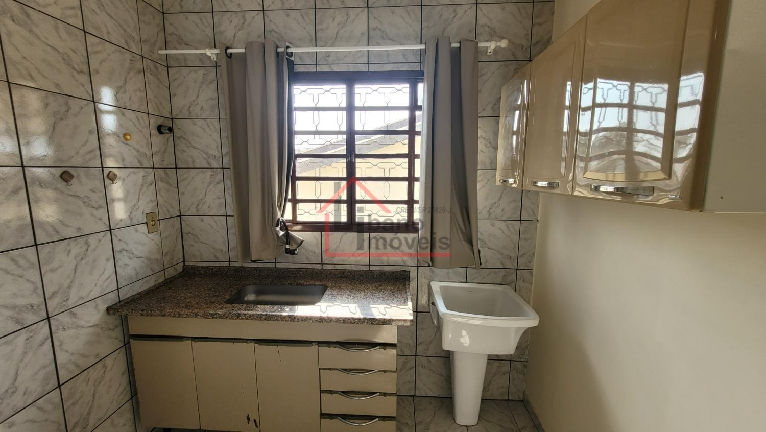 Sala de estar em estilo americano com a cozinha (separadas por um balcão), cozinha com gabinete e lavanderia conjugada.