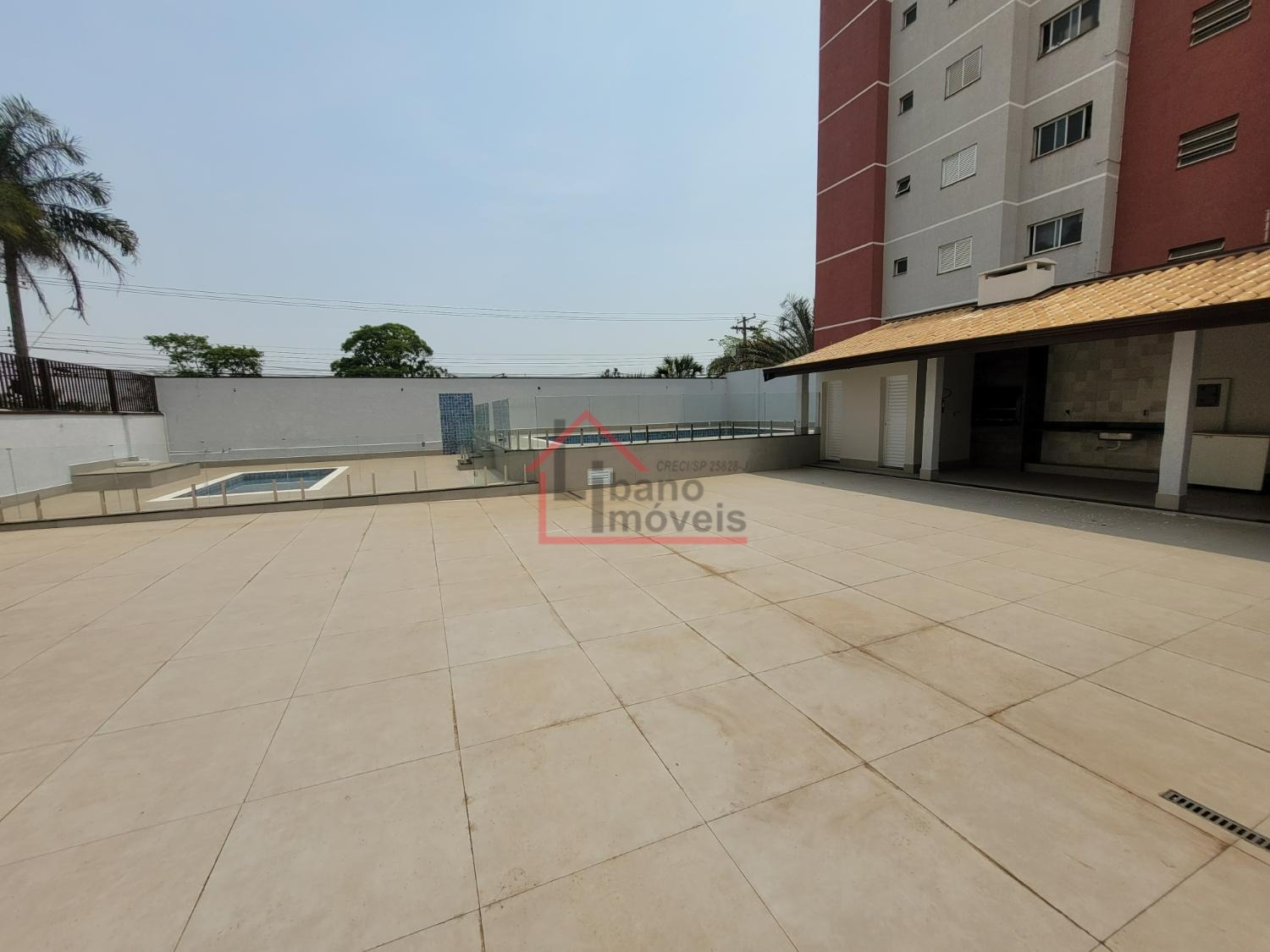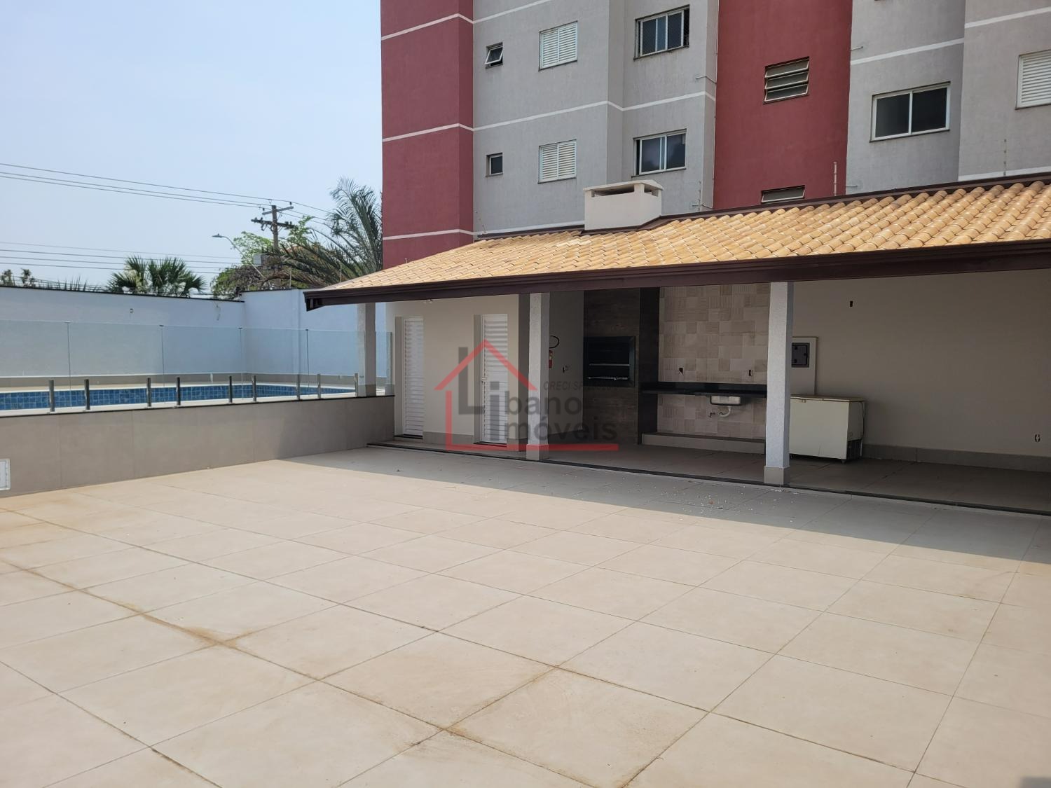 Área de lazer reformada com piscina e churrasqueira.