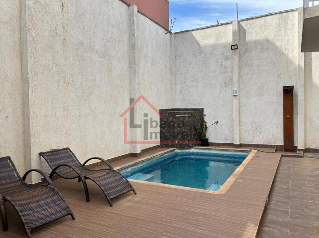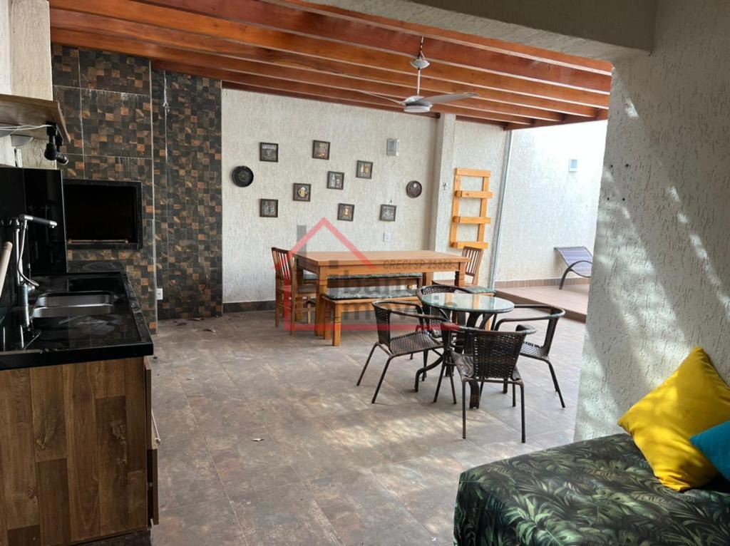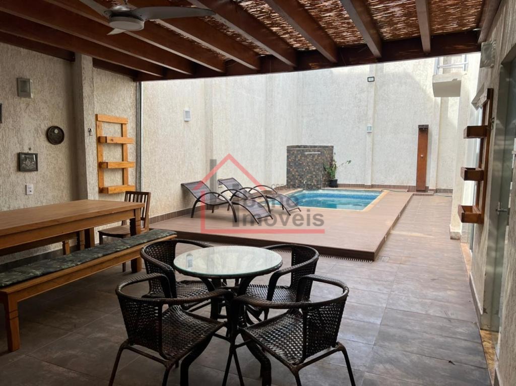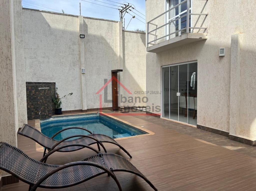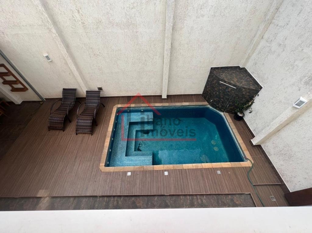São 3 dormitórios, sendo 1 suíte, sala de estar, sala de jantar, hall amplo na parte de cima, banheiro social, escritório, cozinha e lavanderia. Quintal no fundo com piscina, churrasqueira e banheiro.