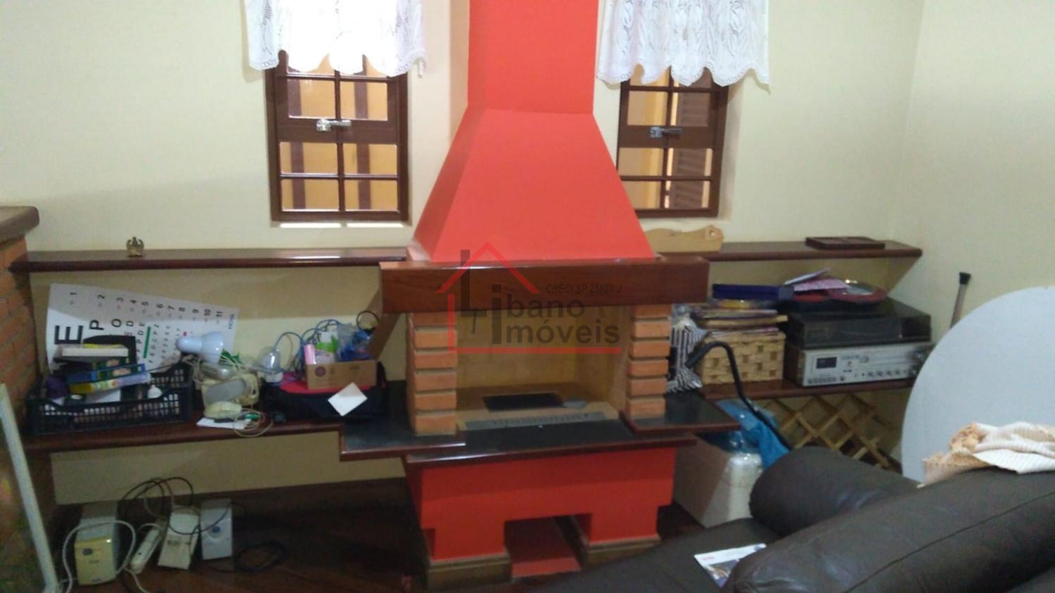 Piso inferior: 3 salas, sendo uma com lareira, escada em madeira Ipê, escritório, lavabo, cozinha com piso de granito, despensa, quarto de empregada, banheiro de empregada, área de serviço e local para varal, depósito, piscina, churrasqueira, forno a lenha, pomar, varandas, garagem para 3 carros e guarda motos