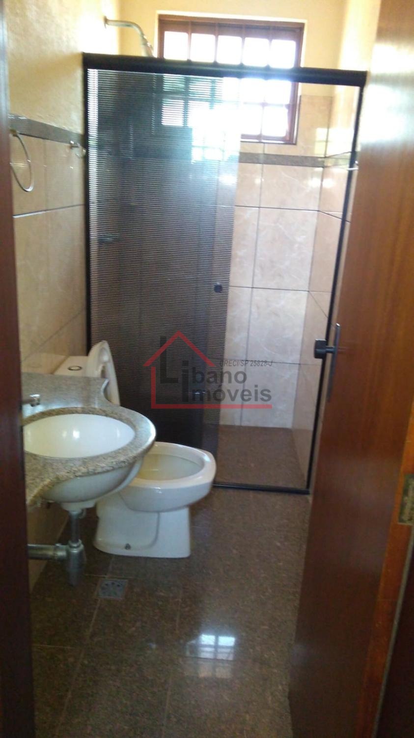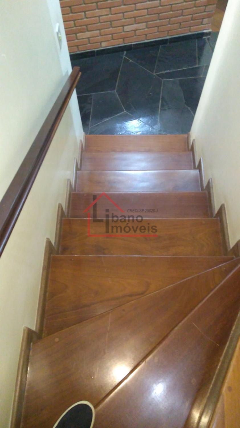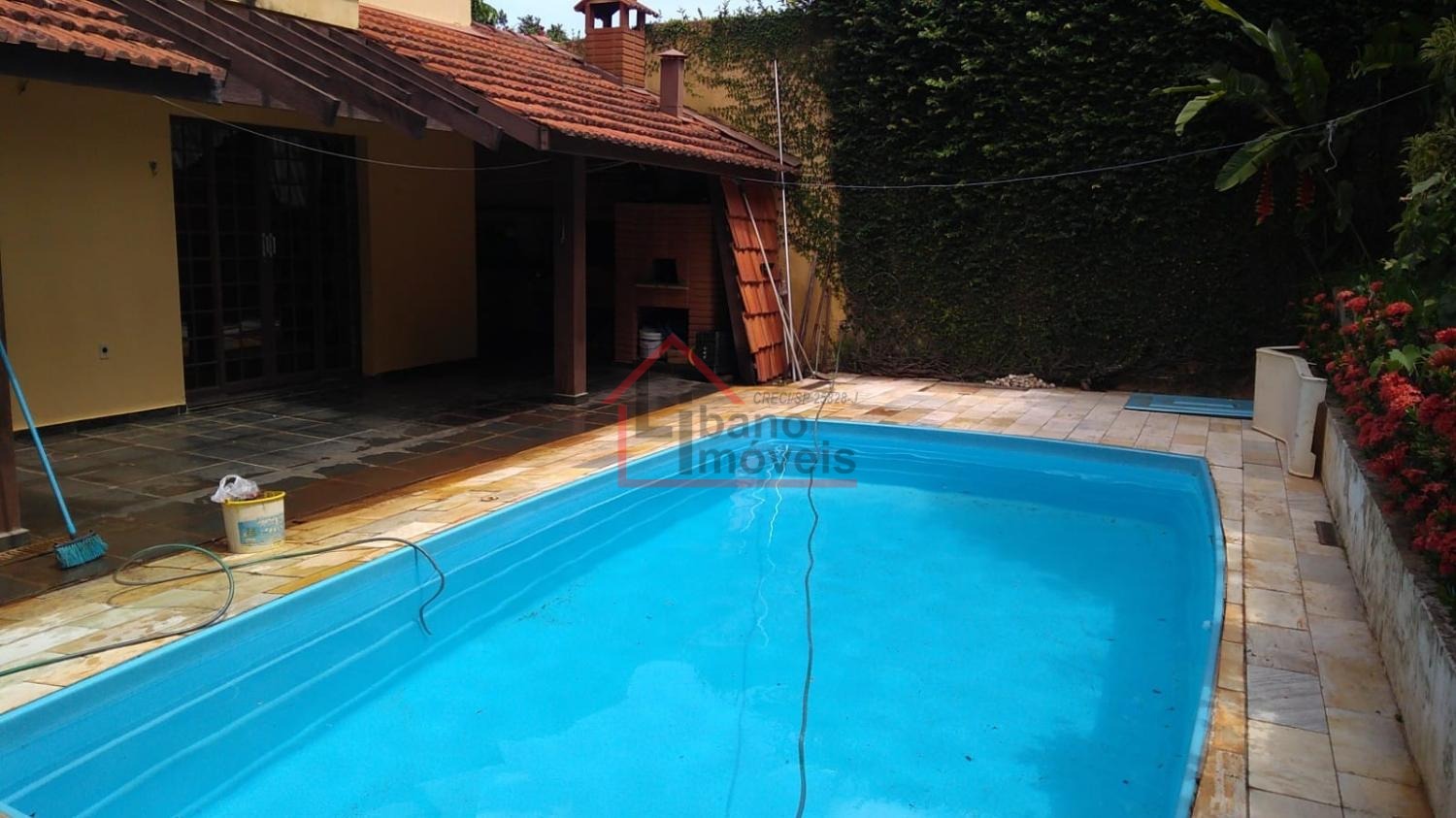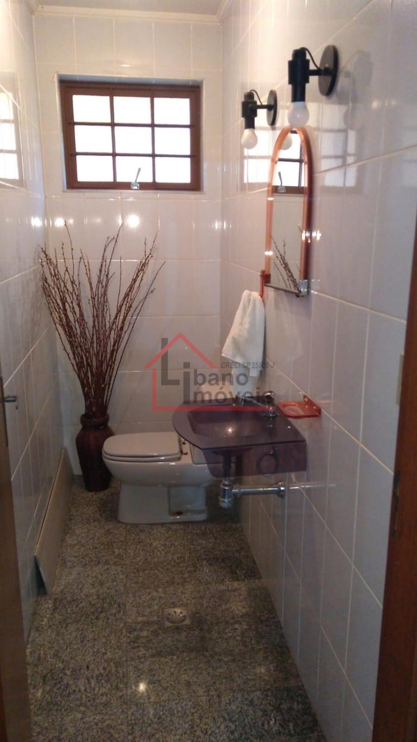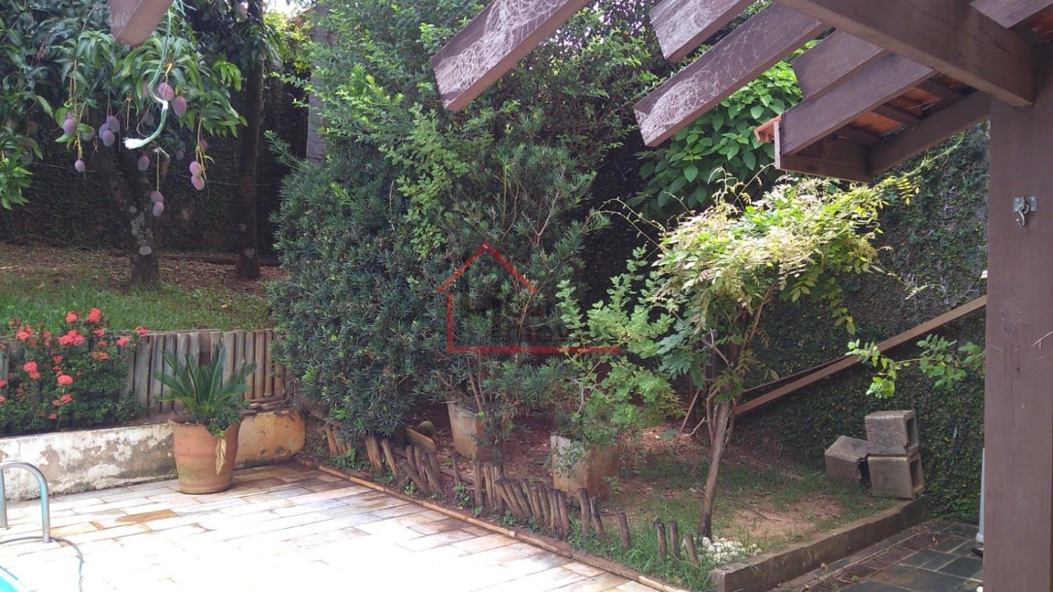 Piso inferior: 3 salas, sendo uma com lareira, escada em madeira Ipê, escritório, lavabo, cozinha com piso de granito, despensa, quarto de empregada, banheiro de empregada, área de serviço e local para varal, depósito, piscina, churrasqueira, forno a lenha, pomar, varandas, garagem para 3 carros e guarda motos