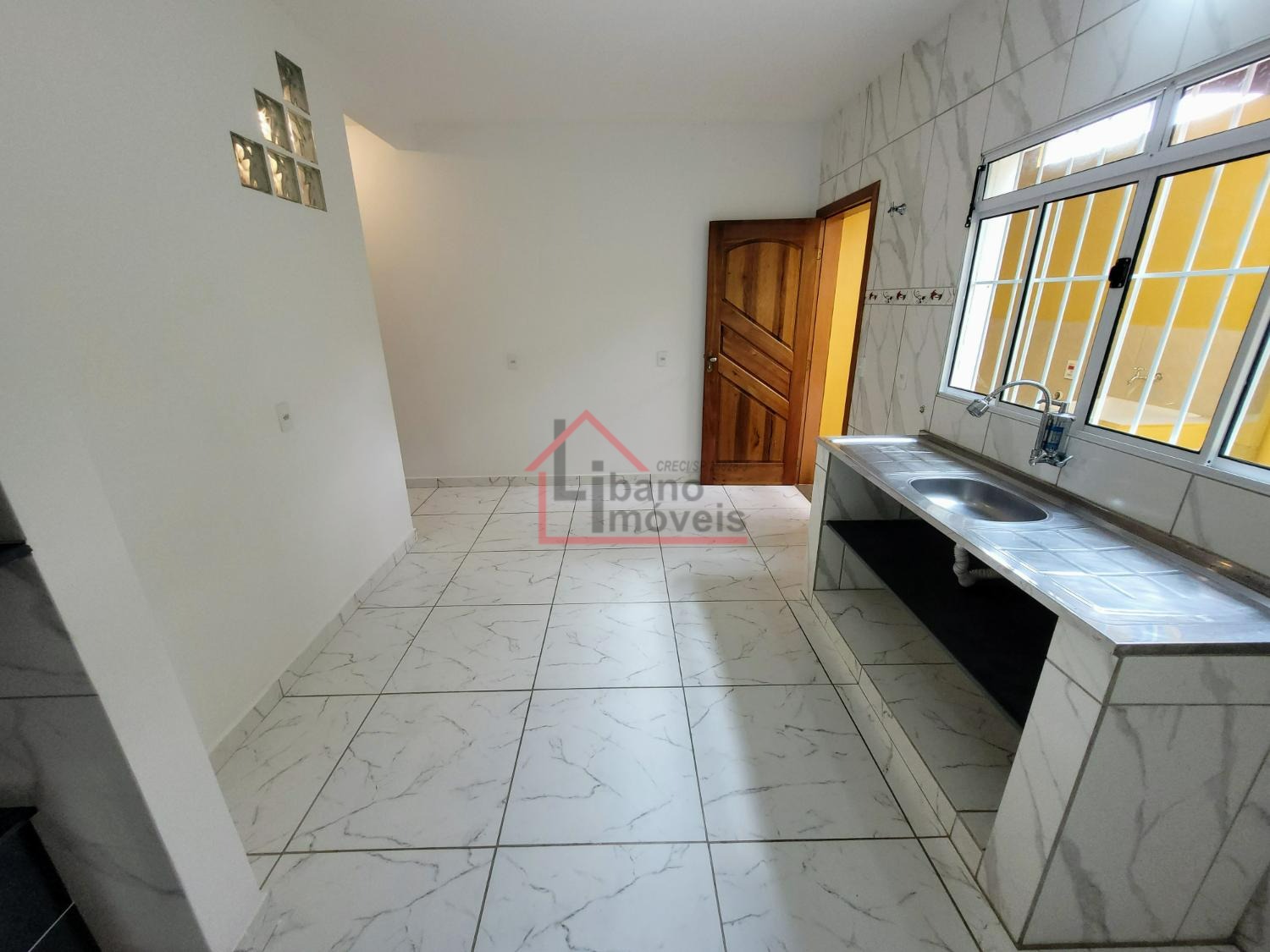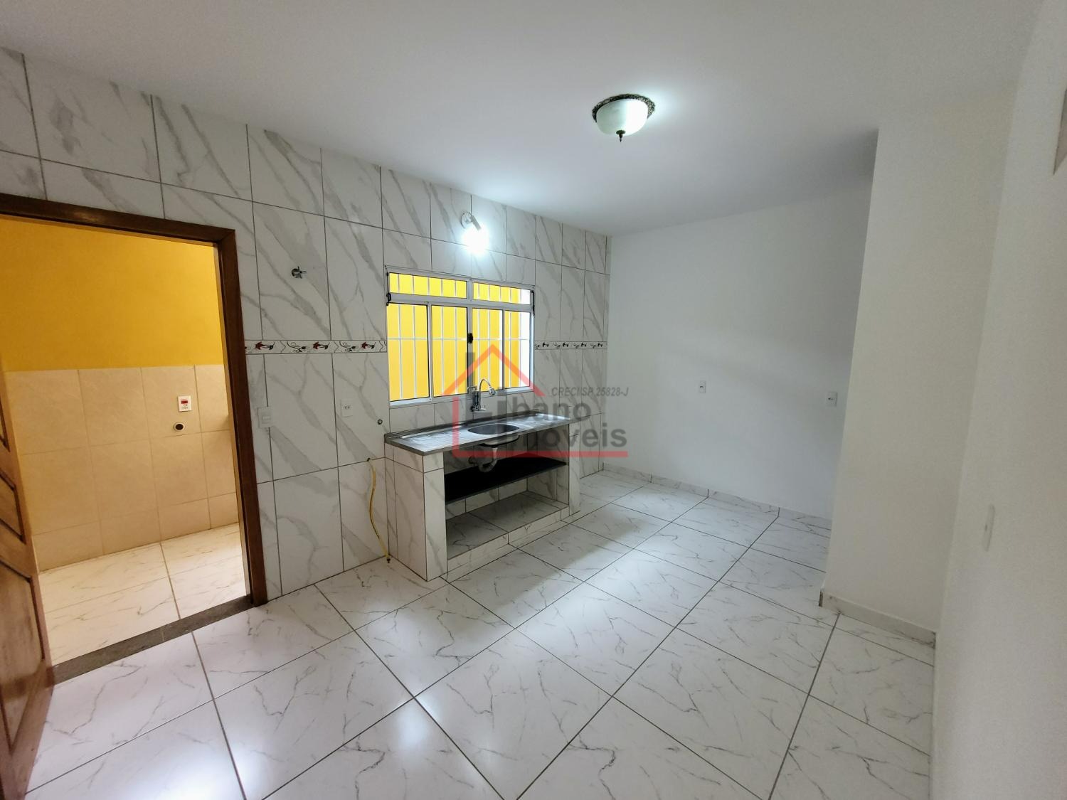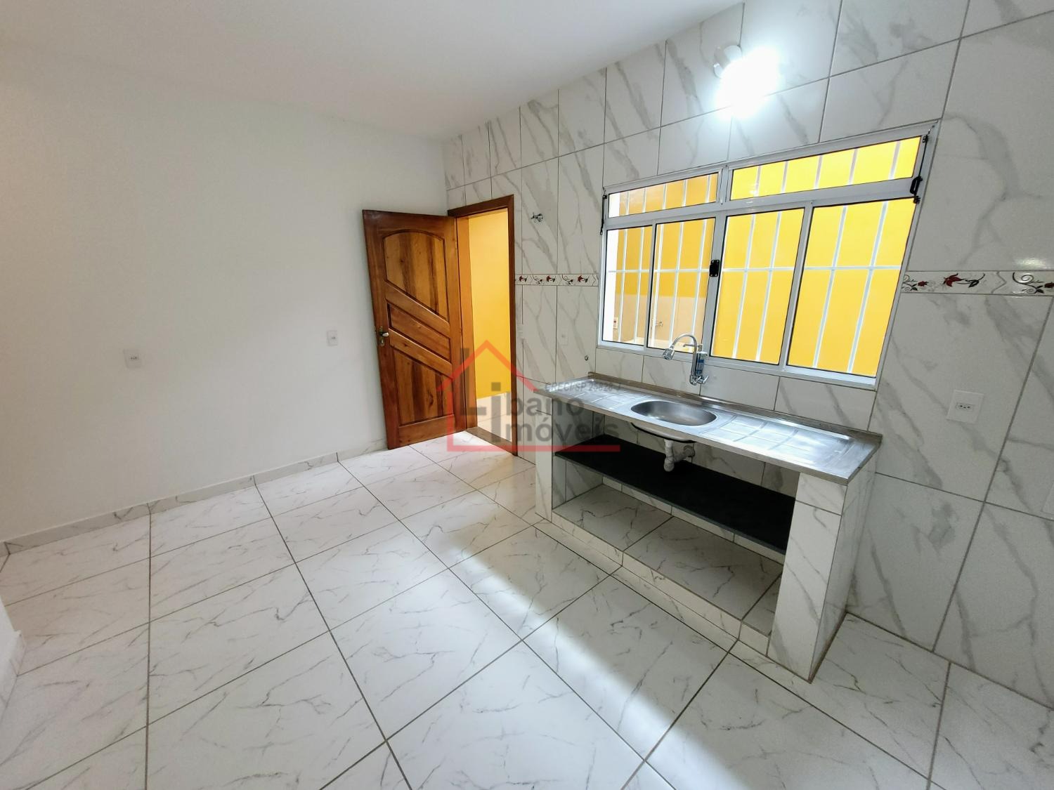 Parte térrea com sala, lavabo, cozinha com gabinete e armário.
