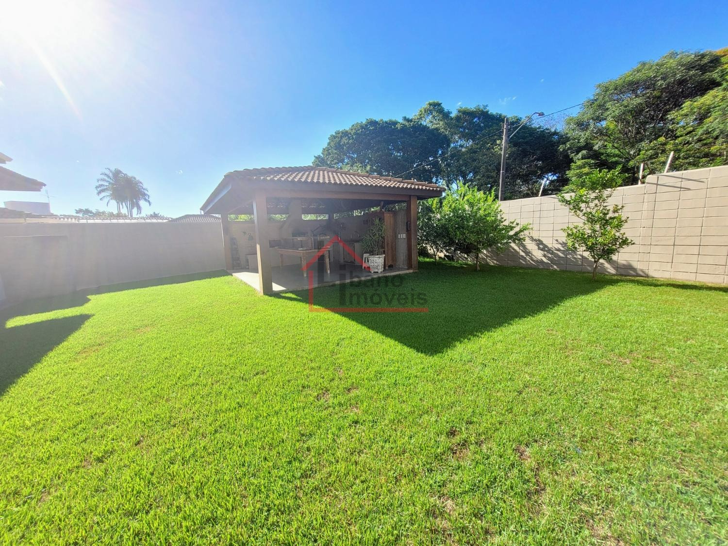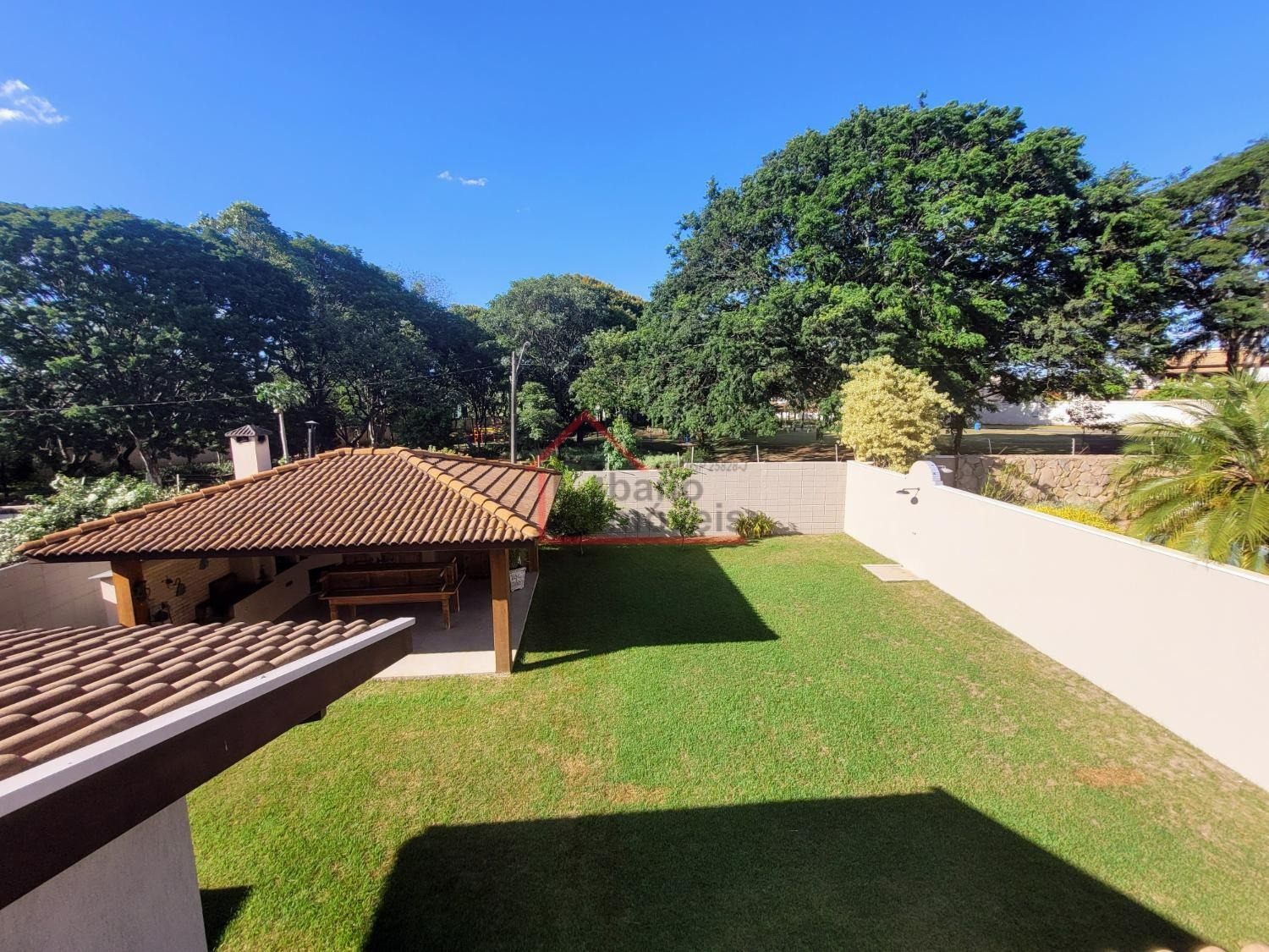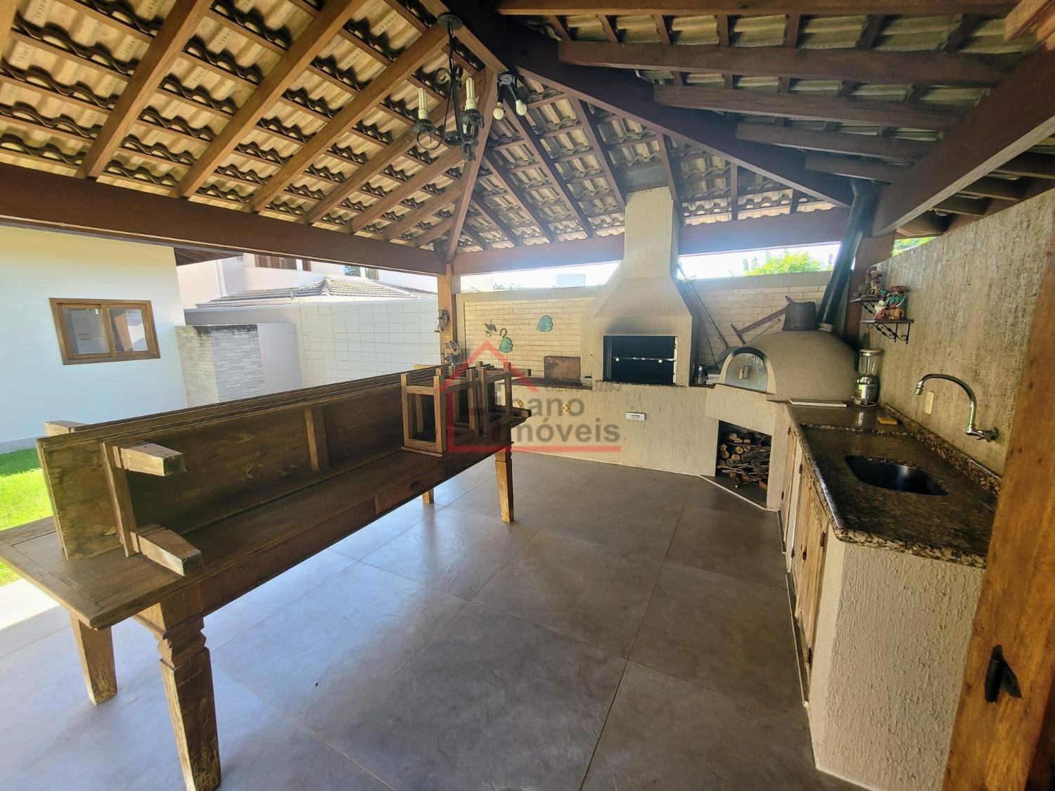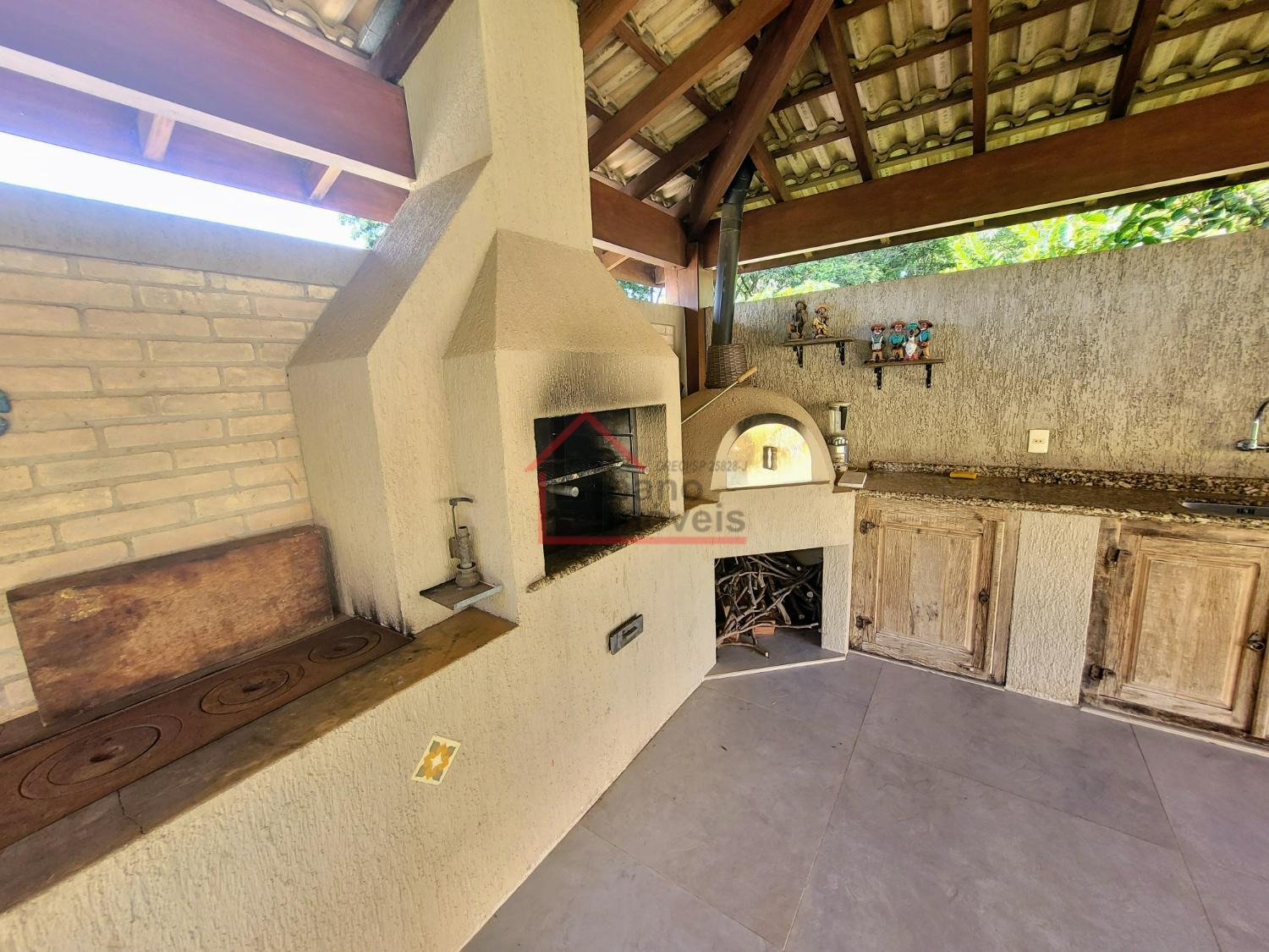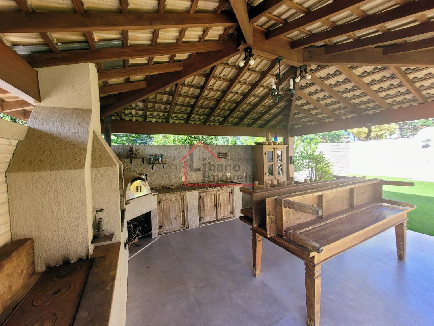 Lindo quintal gramado com área de lazer com churrasqueira, forno e fogão a lenha.
