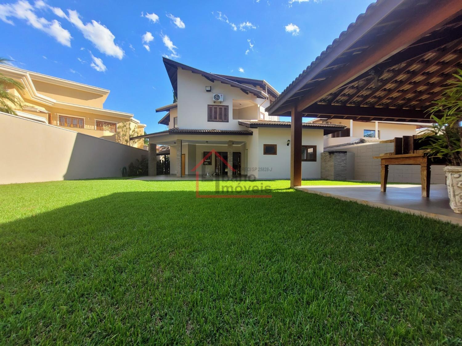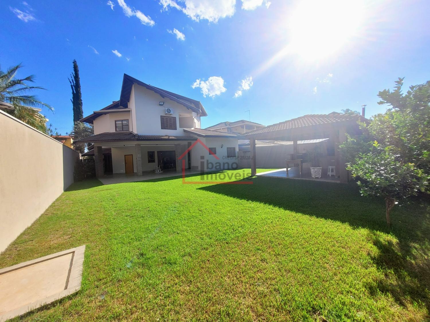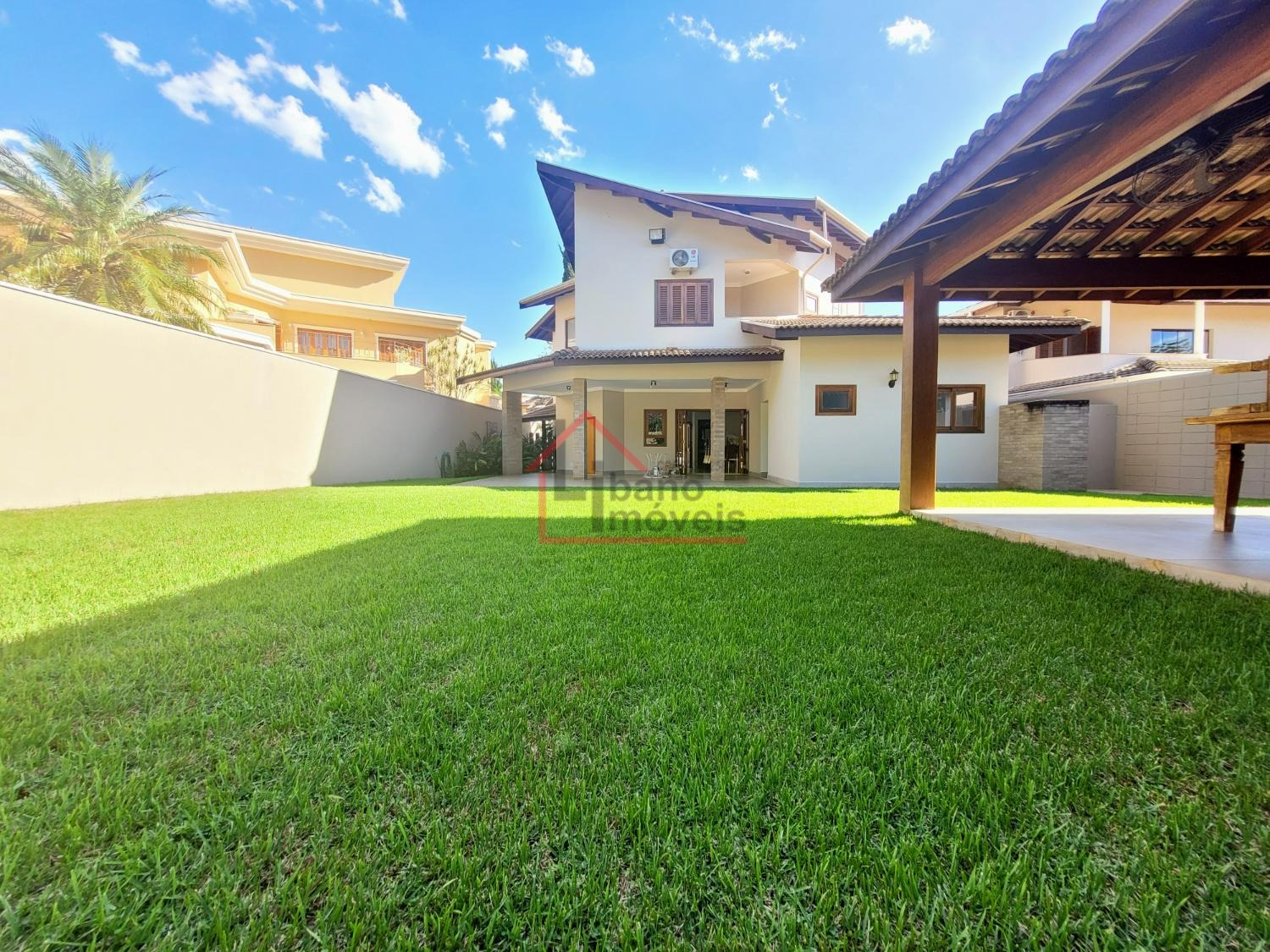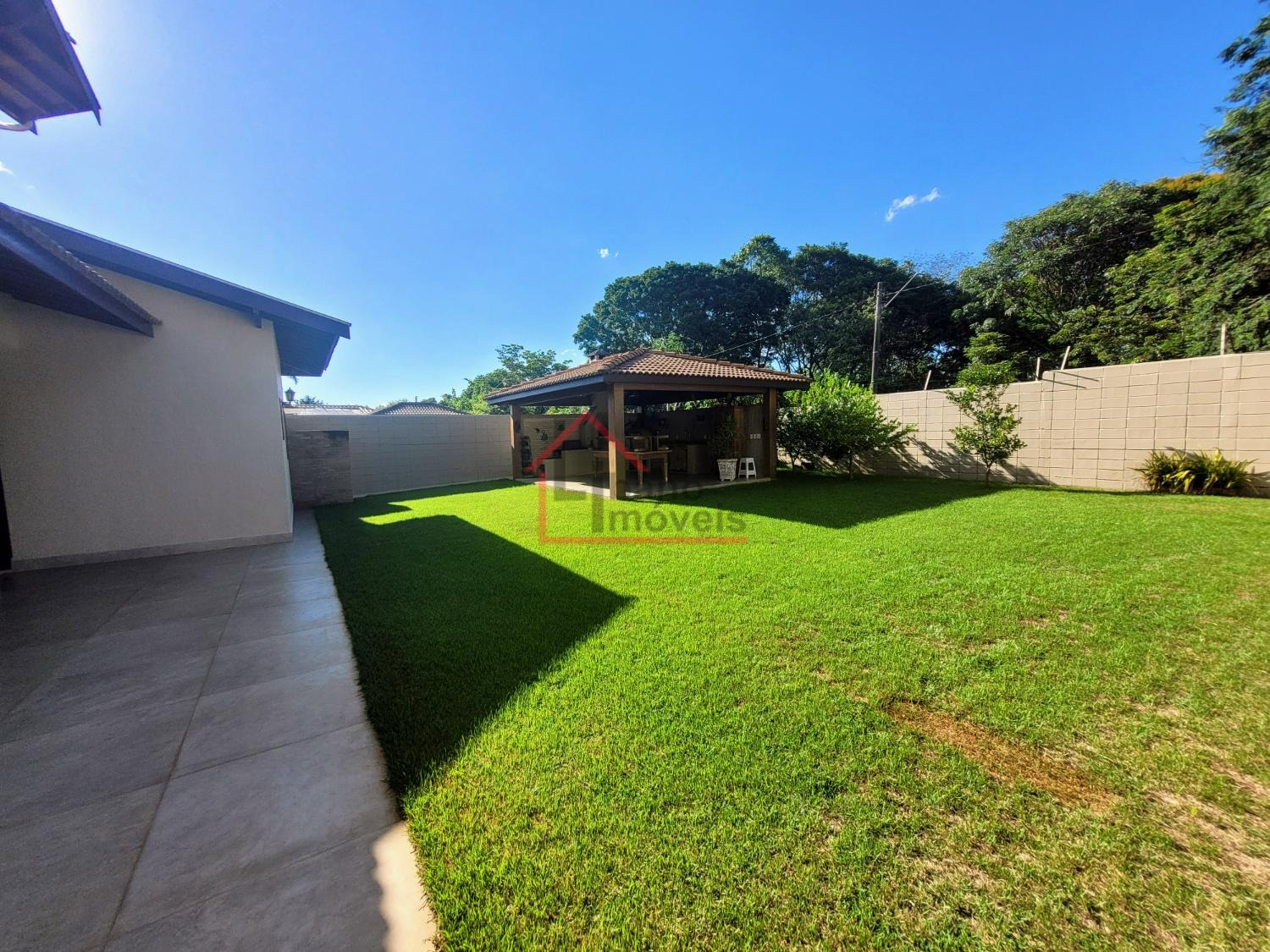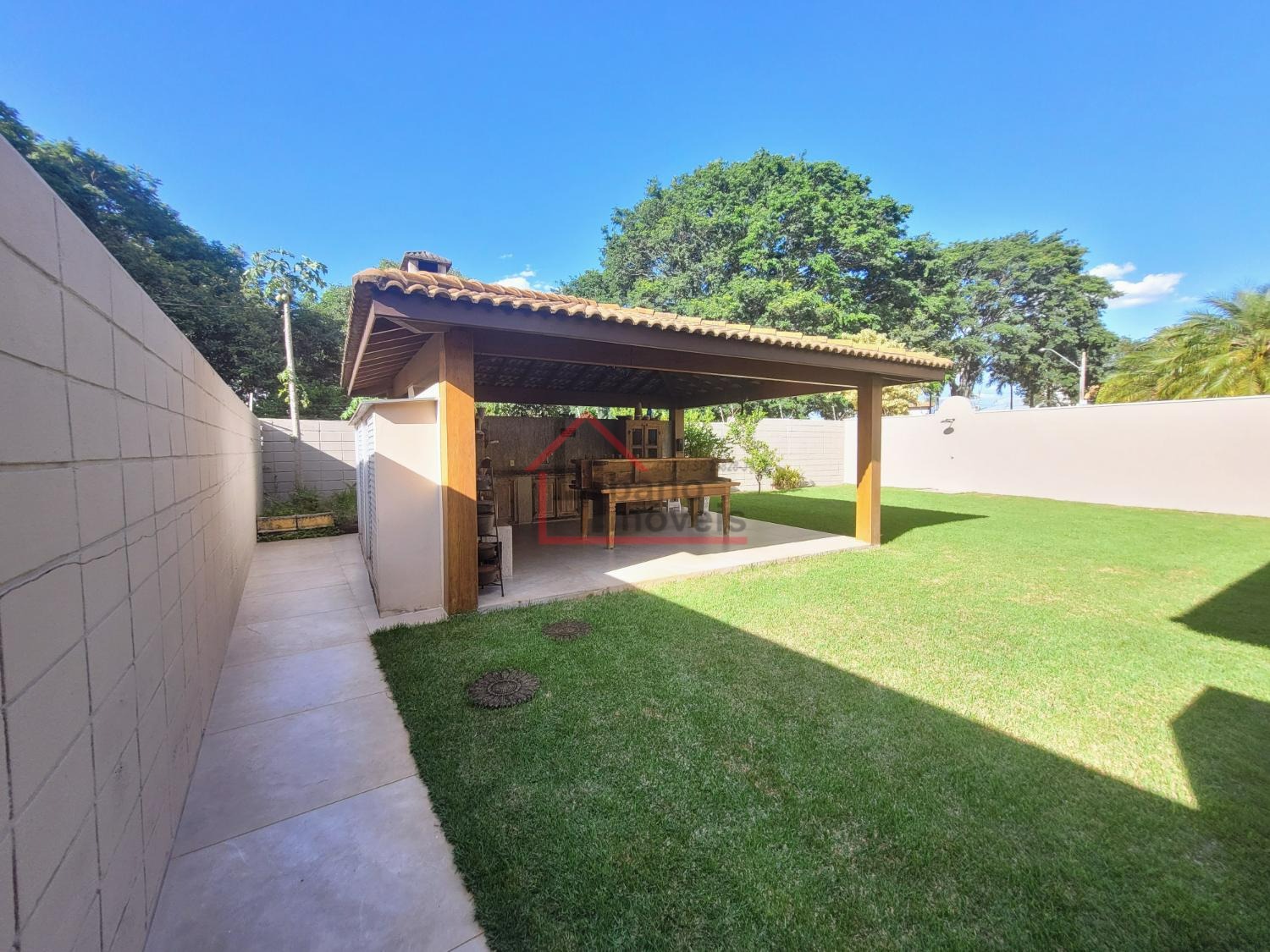 Lindo quintal gramado com área de lazer com churrasqueira, forno e fogão a lenha.