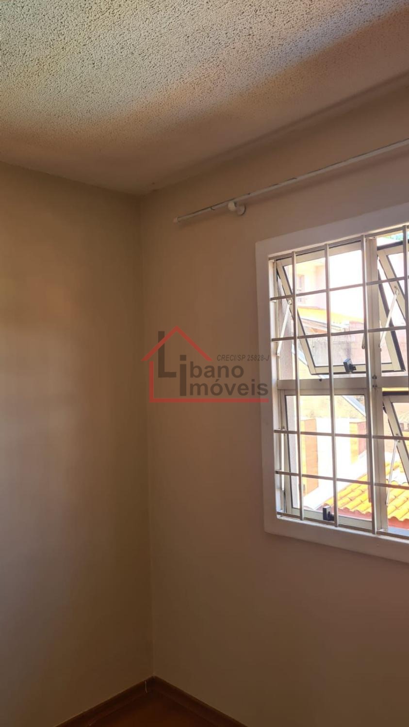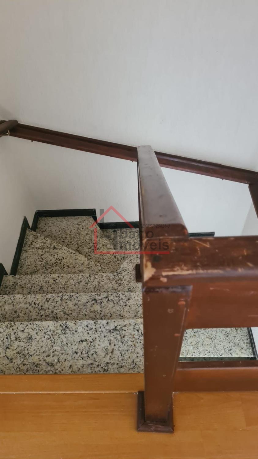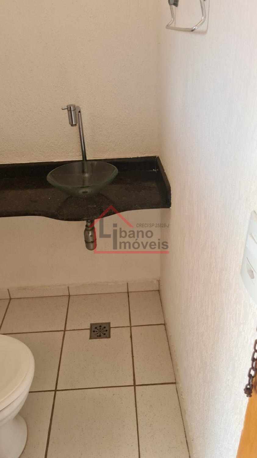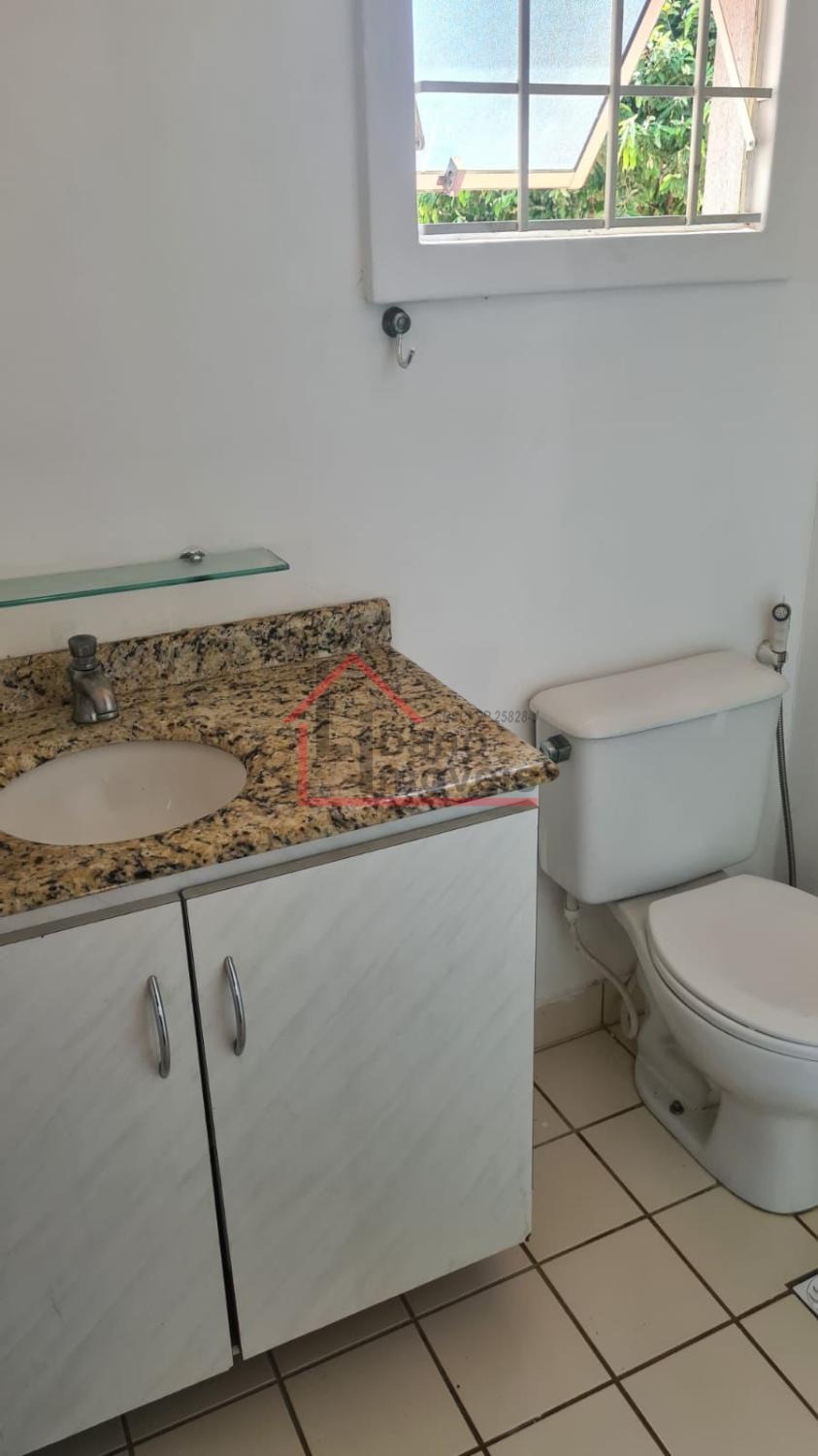 Sobrado com 3 dormitórios, sala com rack, cozinha com armários e porta balcão.