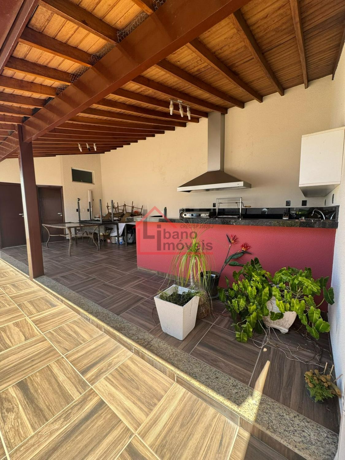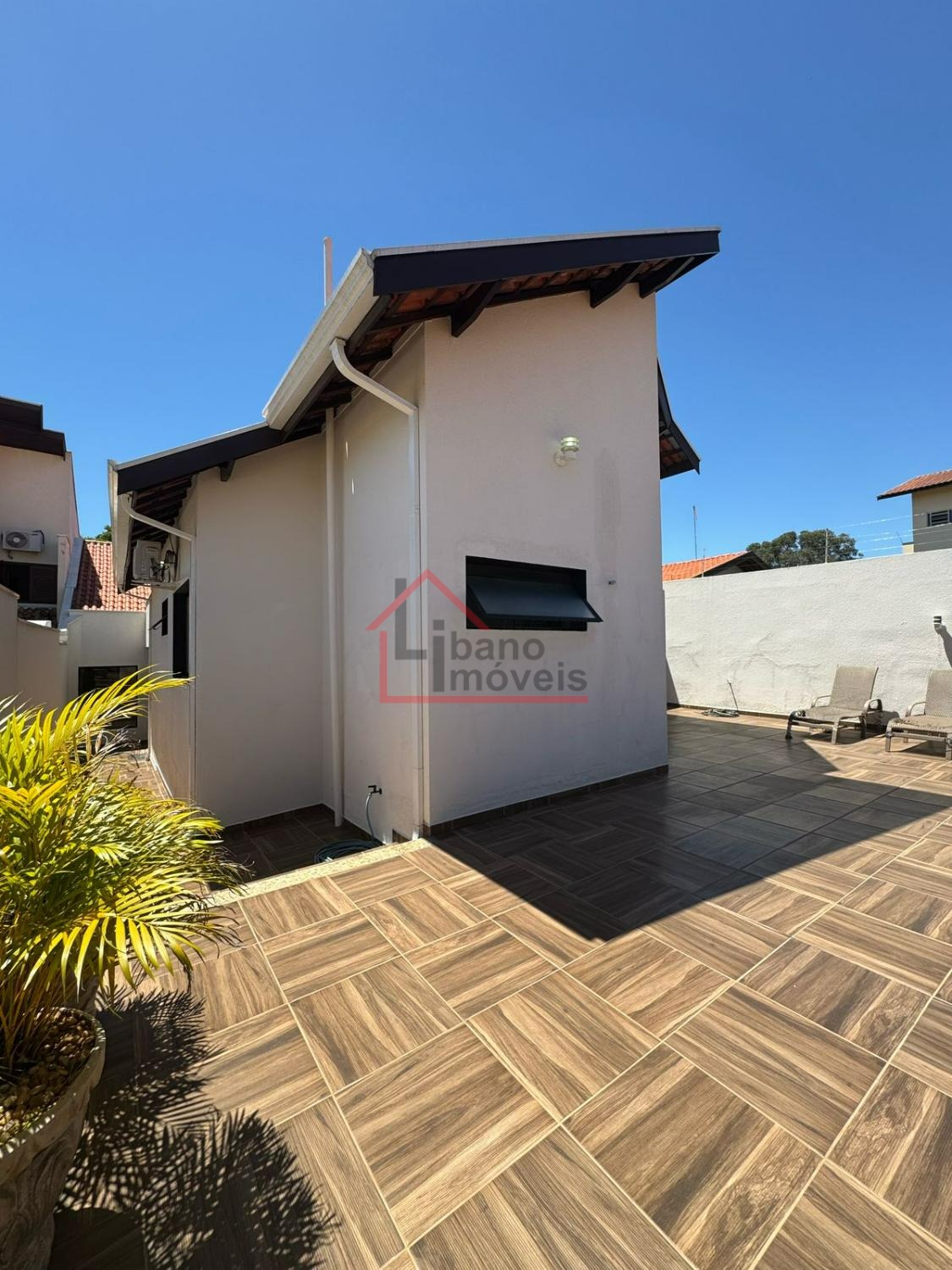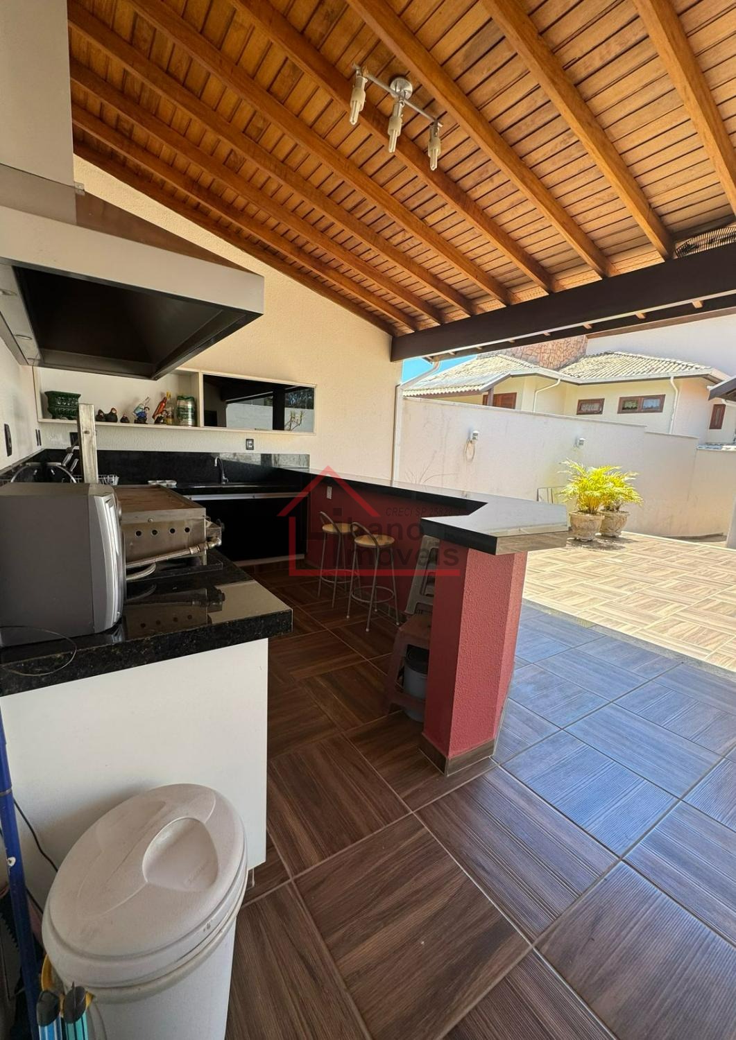 Nos fundos, há uma área gourmet com churrasqueira, balcão, banheiro, um quarto extra e um amplo pátio. A área externa possui piso frio, garantindo praticidade e sofisticação.