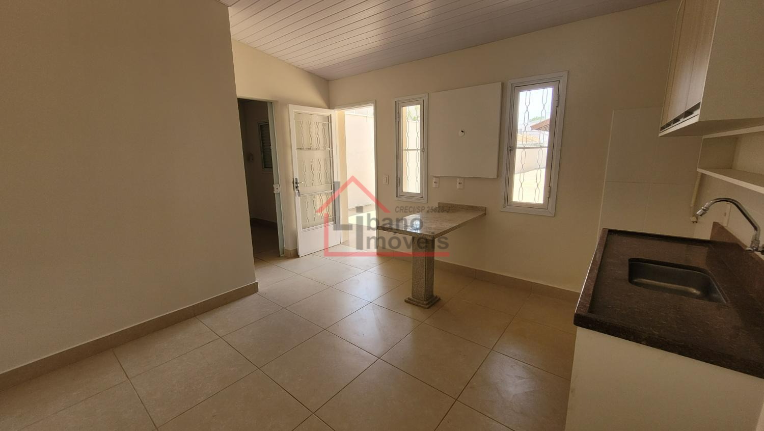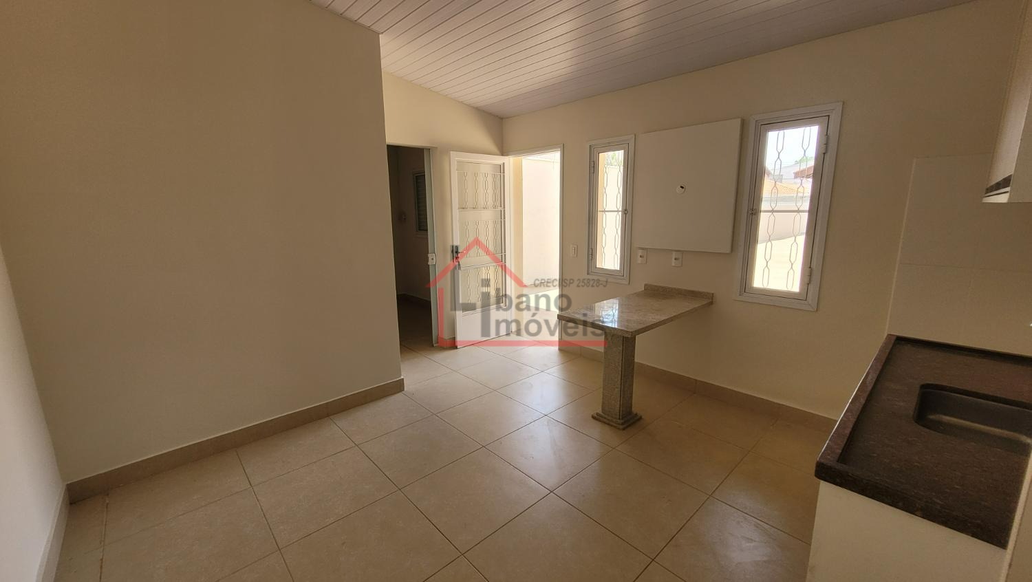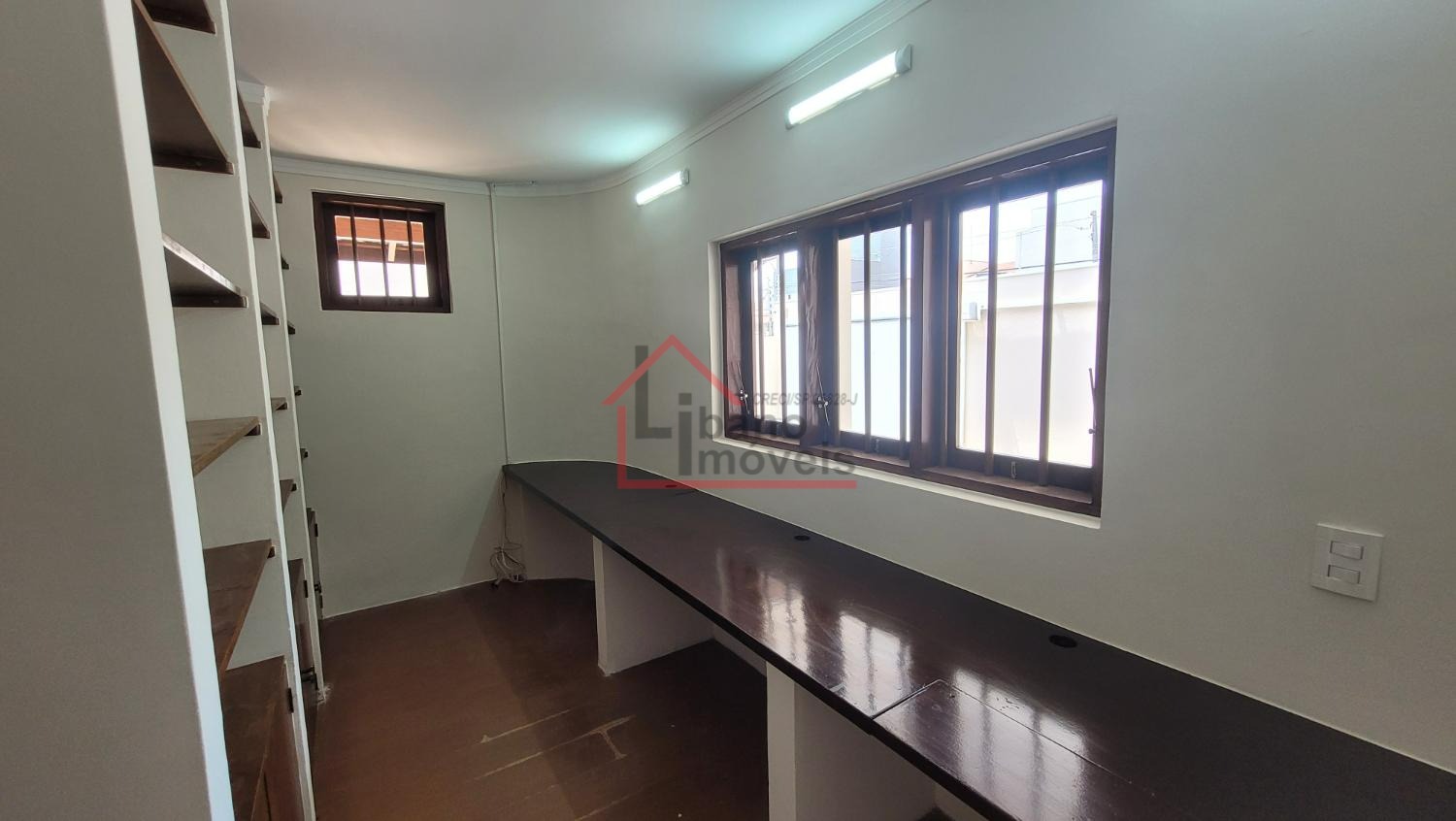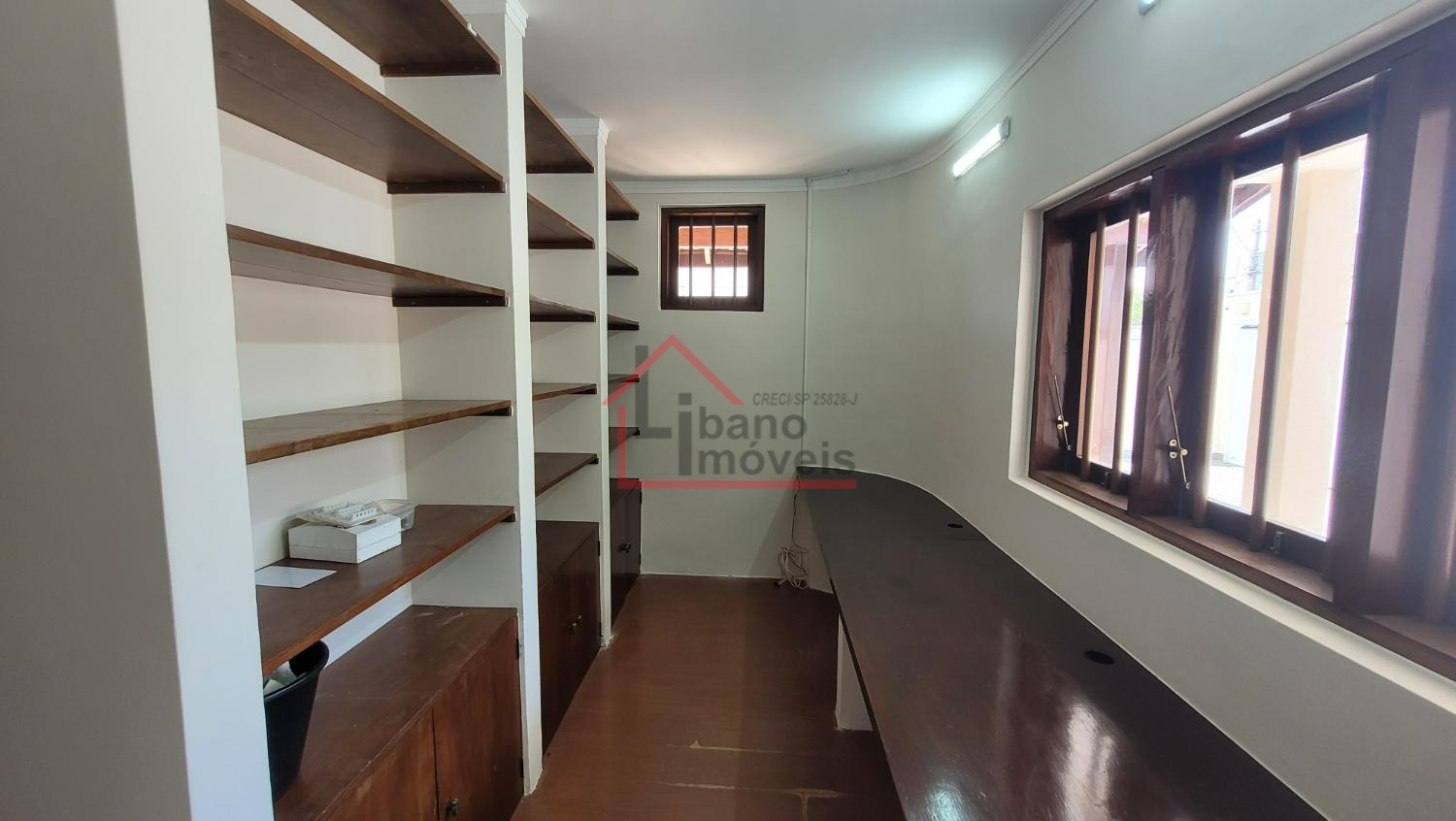 Sala ampla para 2 ambientes, lavabo, escritório com prateleiras, sala de jantar, cozinha. Dependência de serviços e banheiro.
