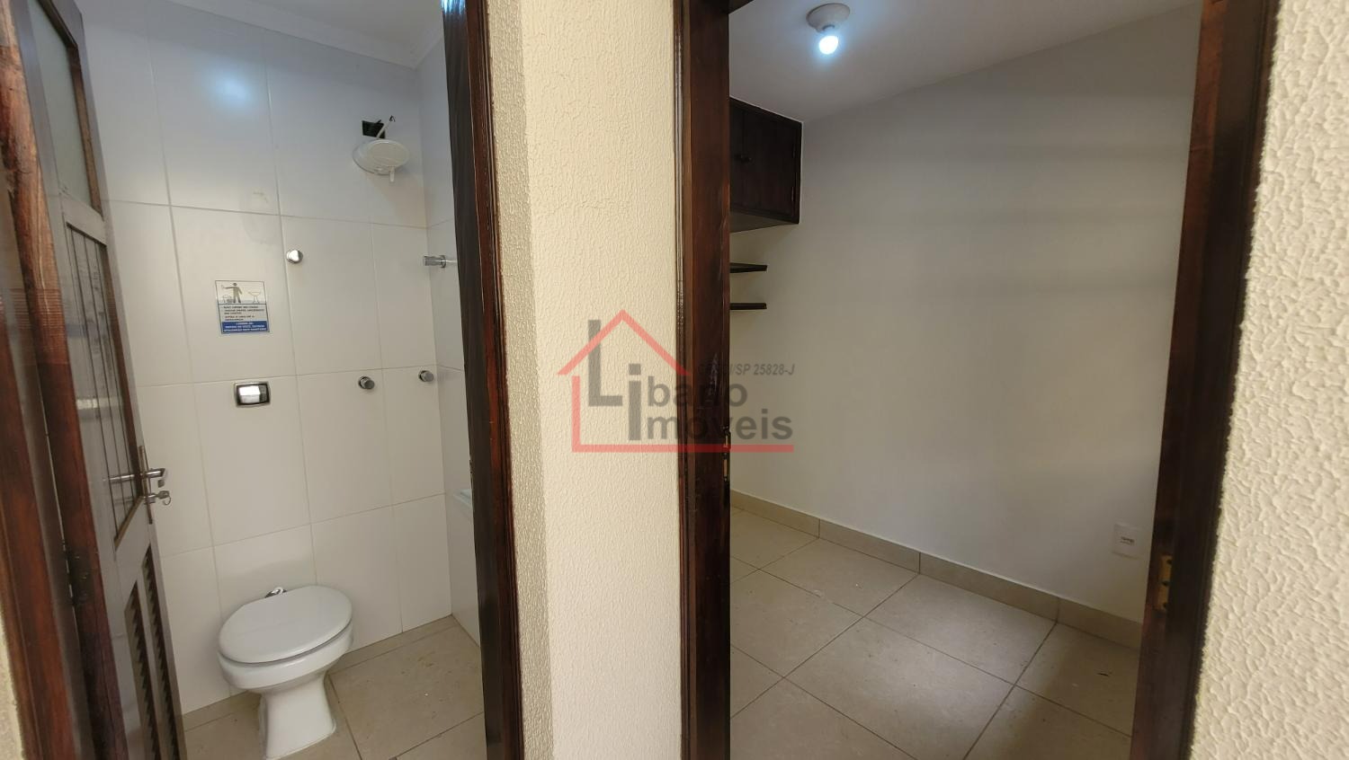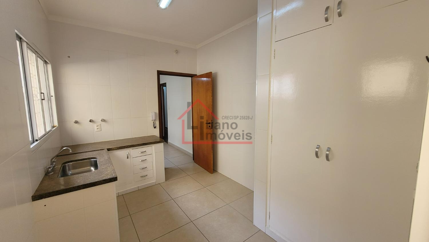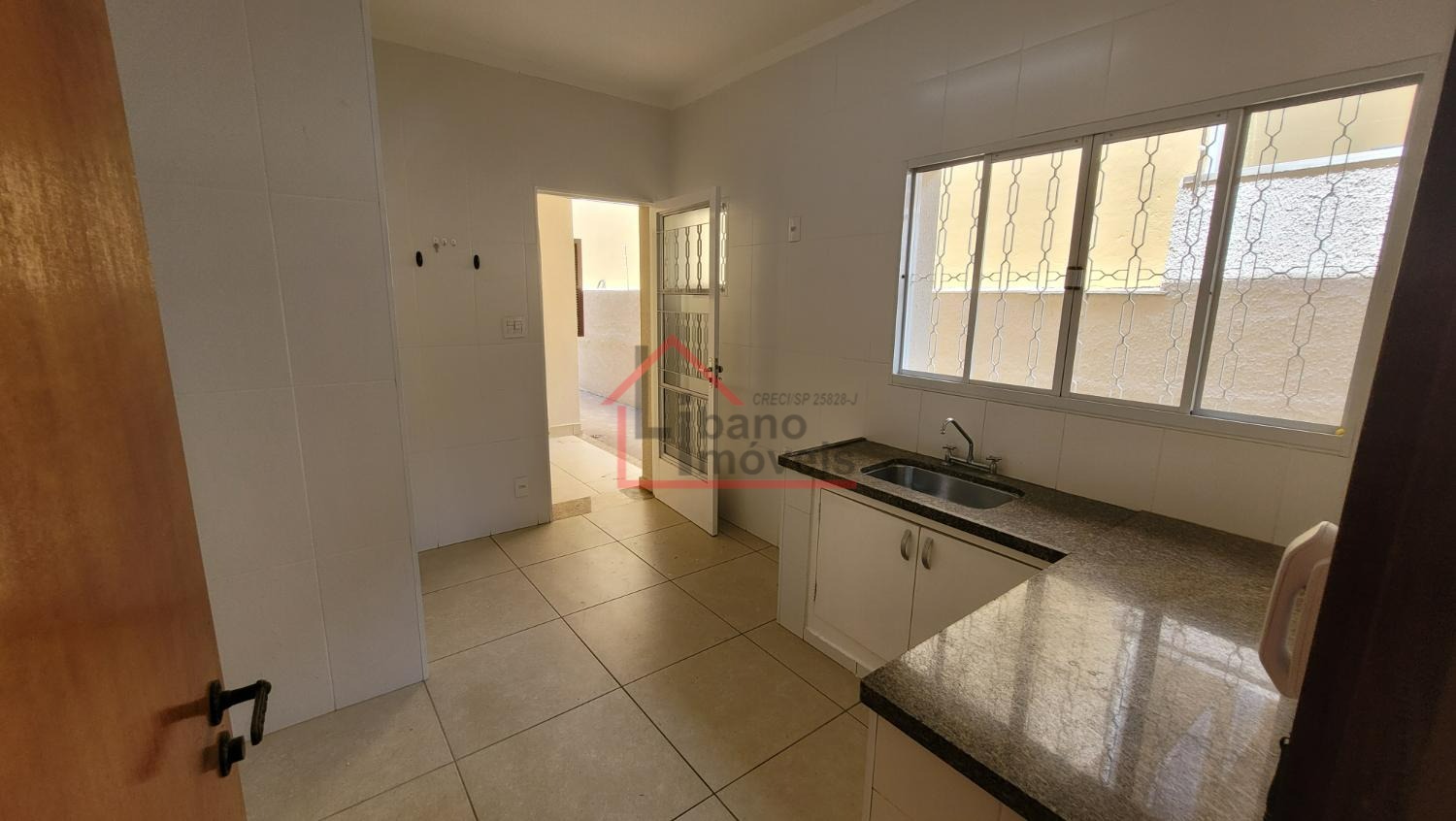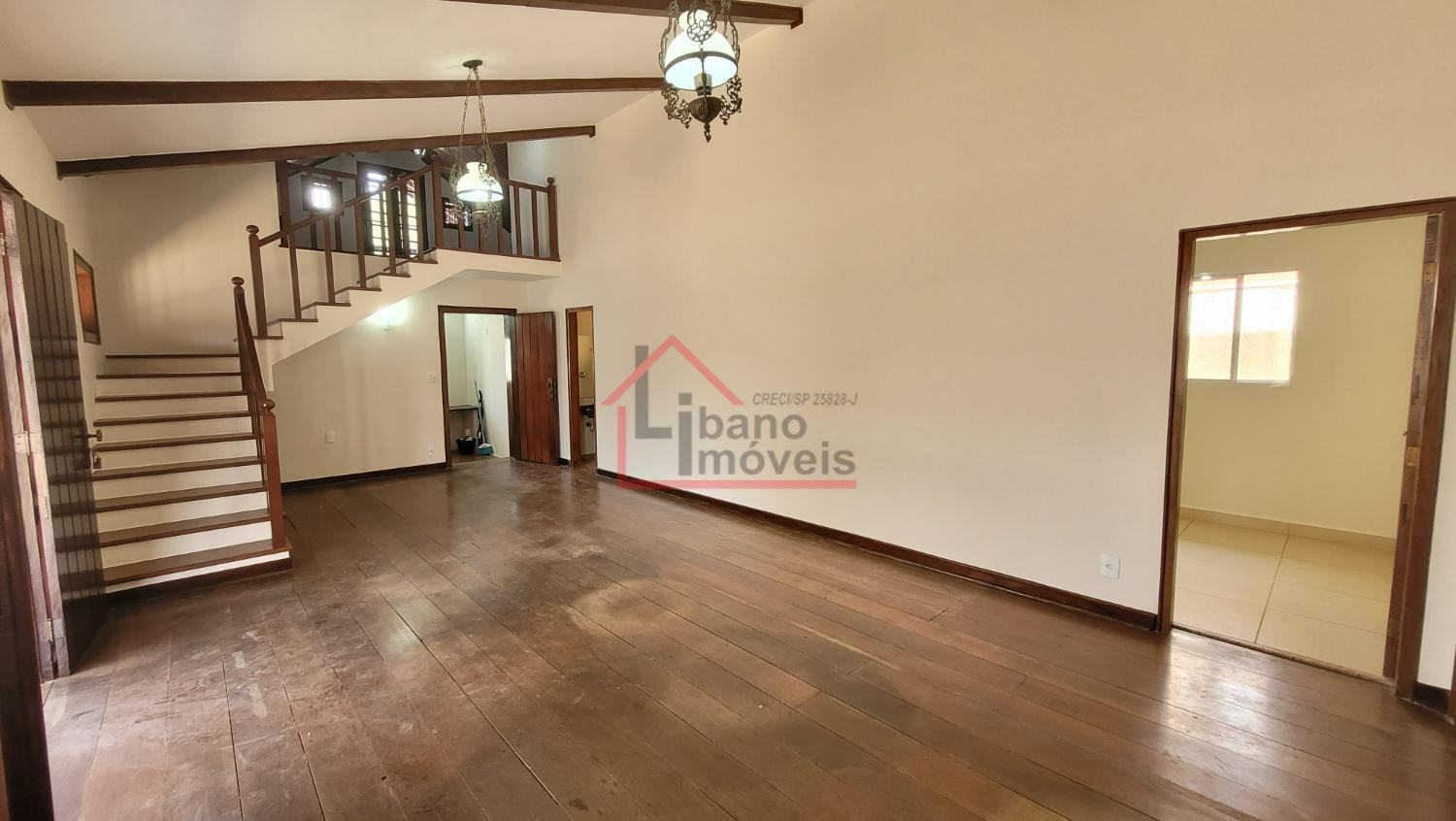 Sala ampla para 2 ambientes, lavabo, escritório com prateleiras, sala de jantar, cozinha. Dependência de serviços e banheiro.