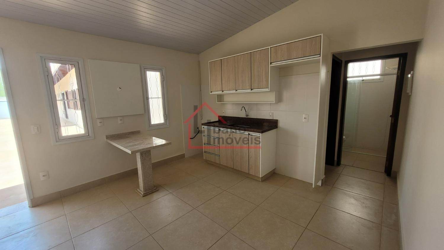 Edícula com kit-net completa e de alto padrão: dormitório separado da cozinha, com armário, cozinha com armários, banheiro e depósito.