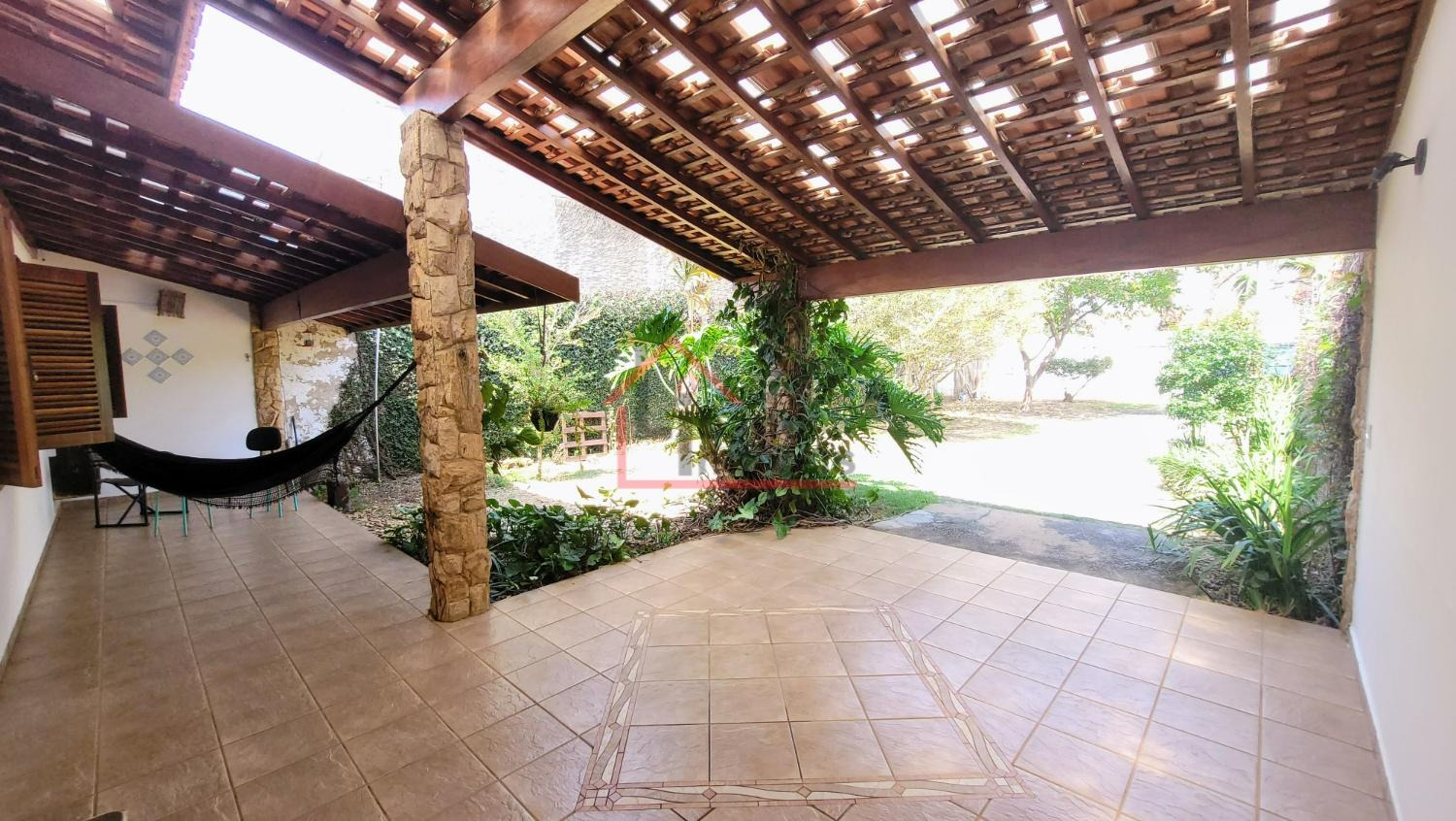 Varanda frontal com espaço para garagem coberta para até 2 autos.