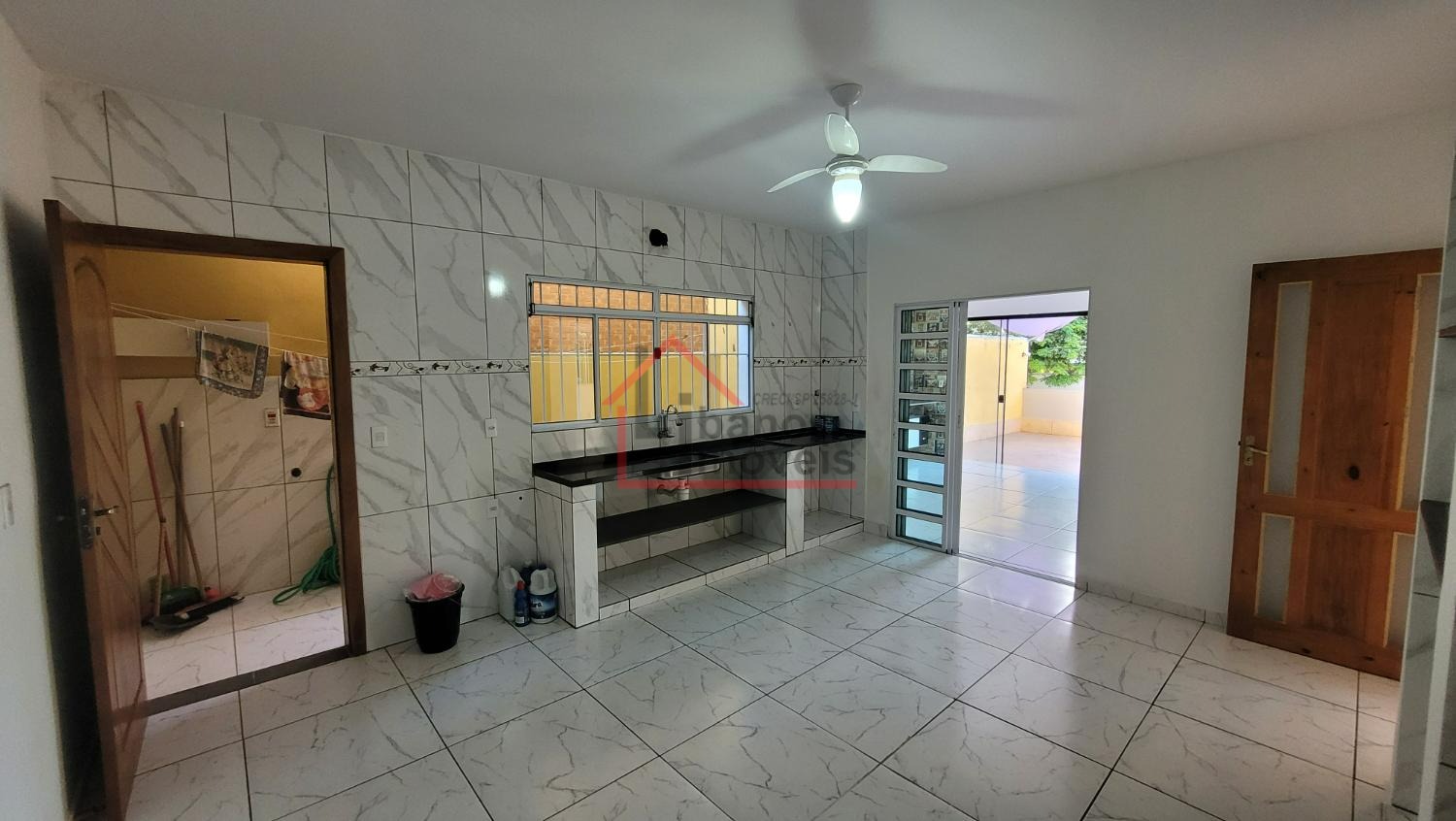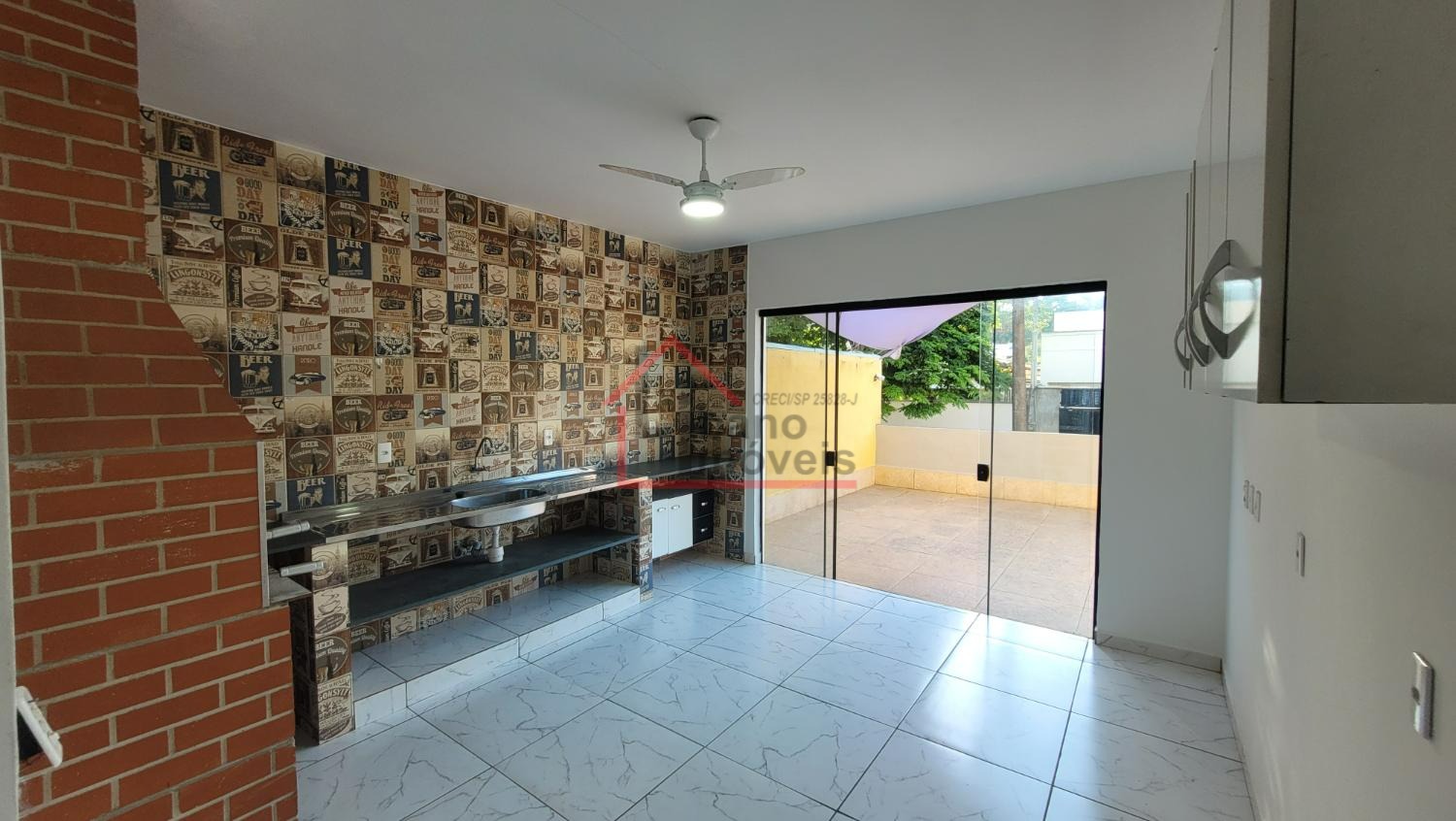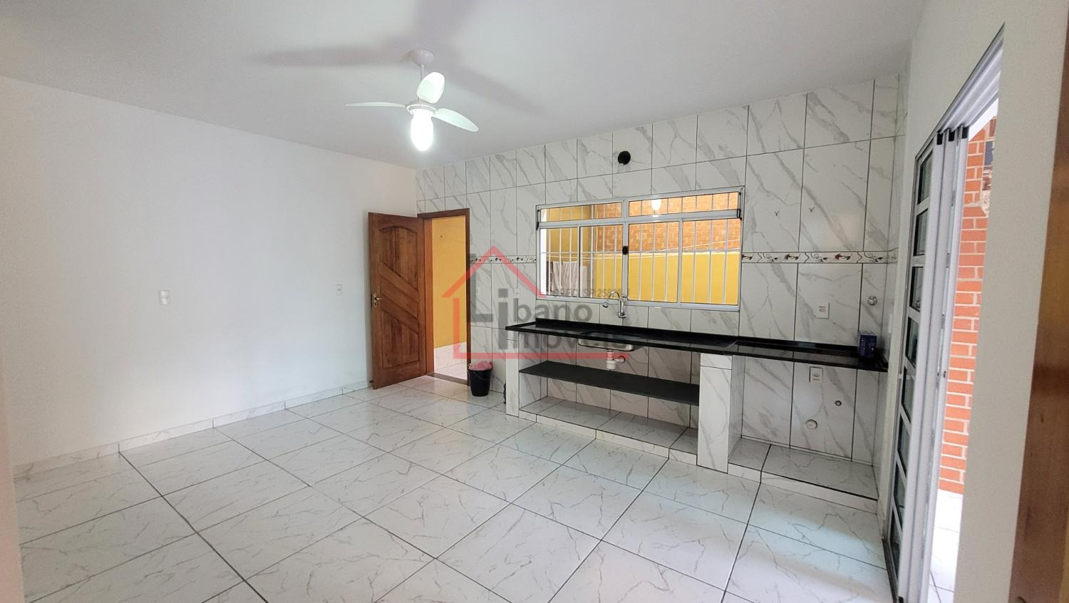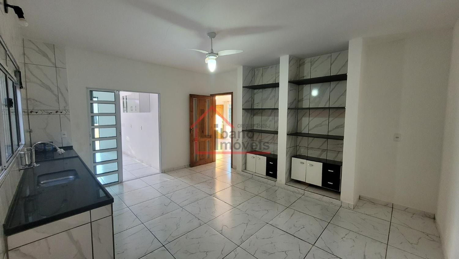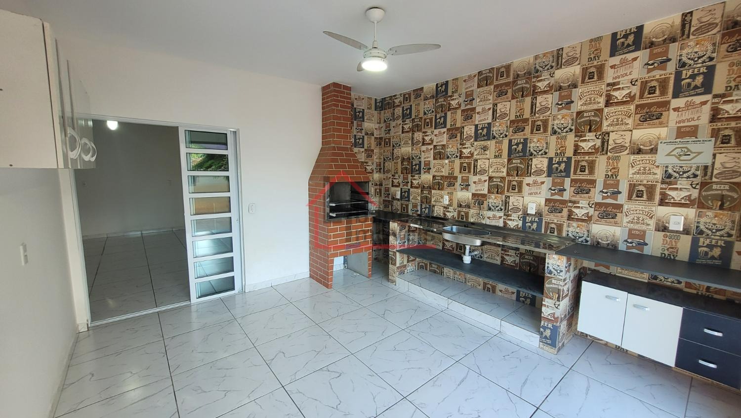 Sala de estar, cozinha ampla, com armários tipo prateleira, espaço de churrasqueira e varanda.