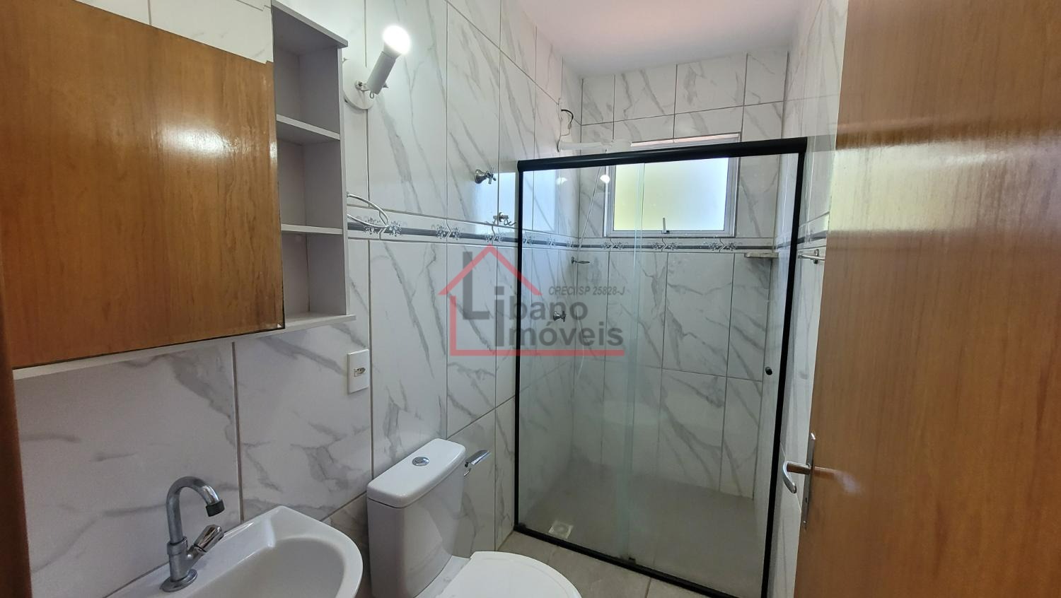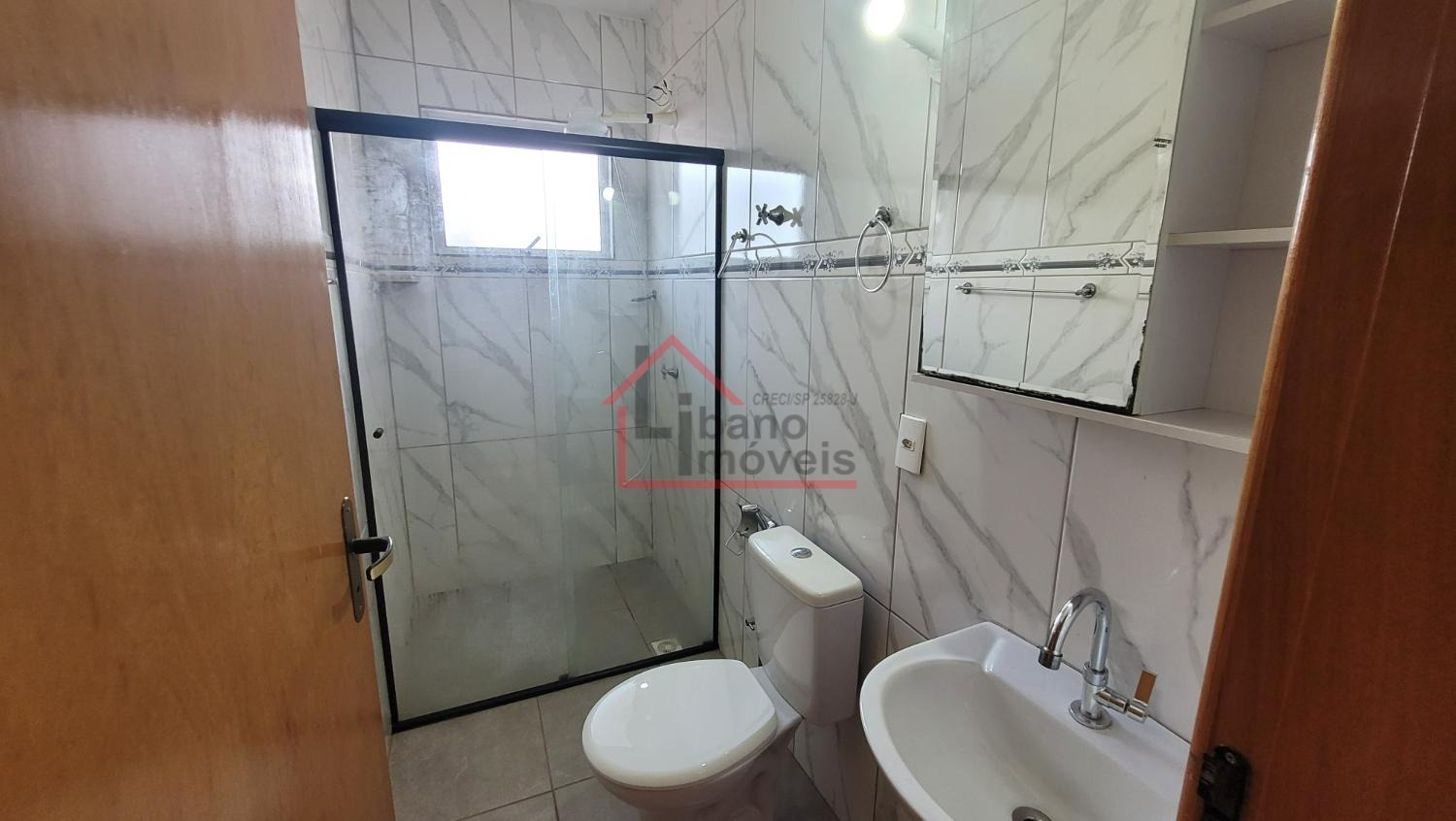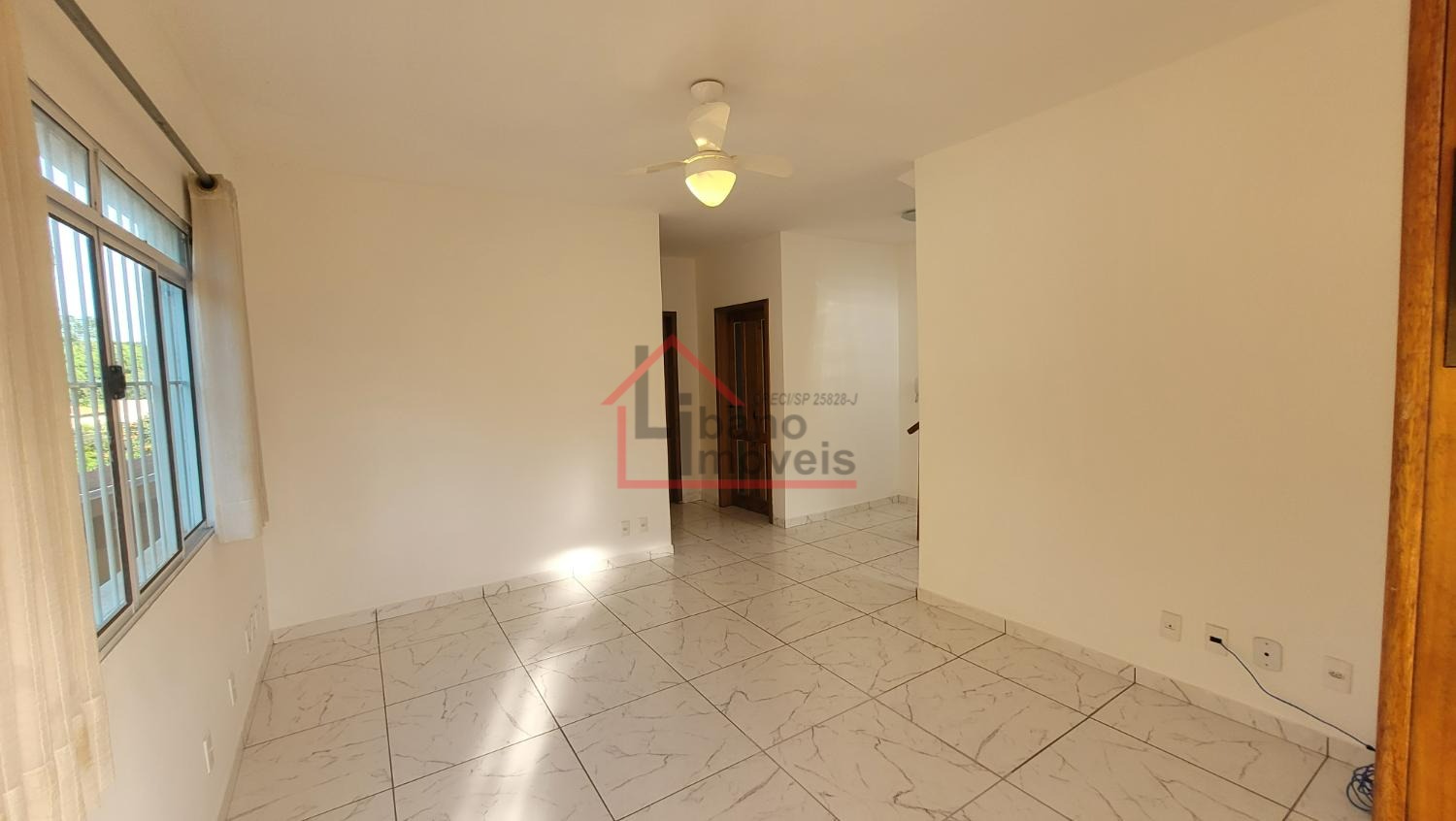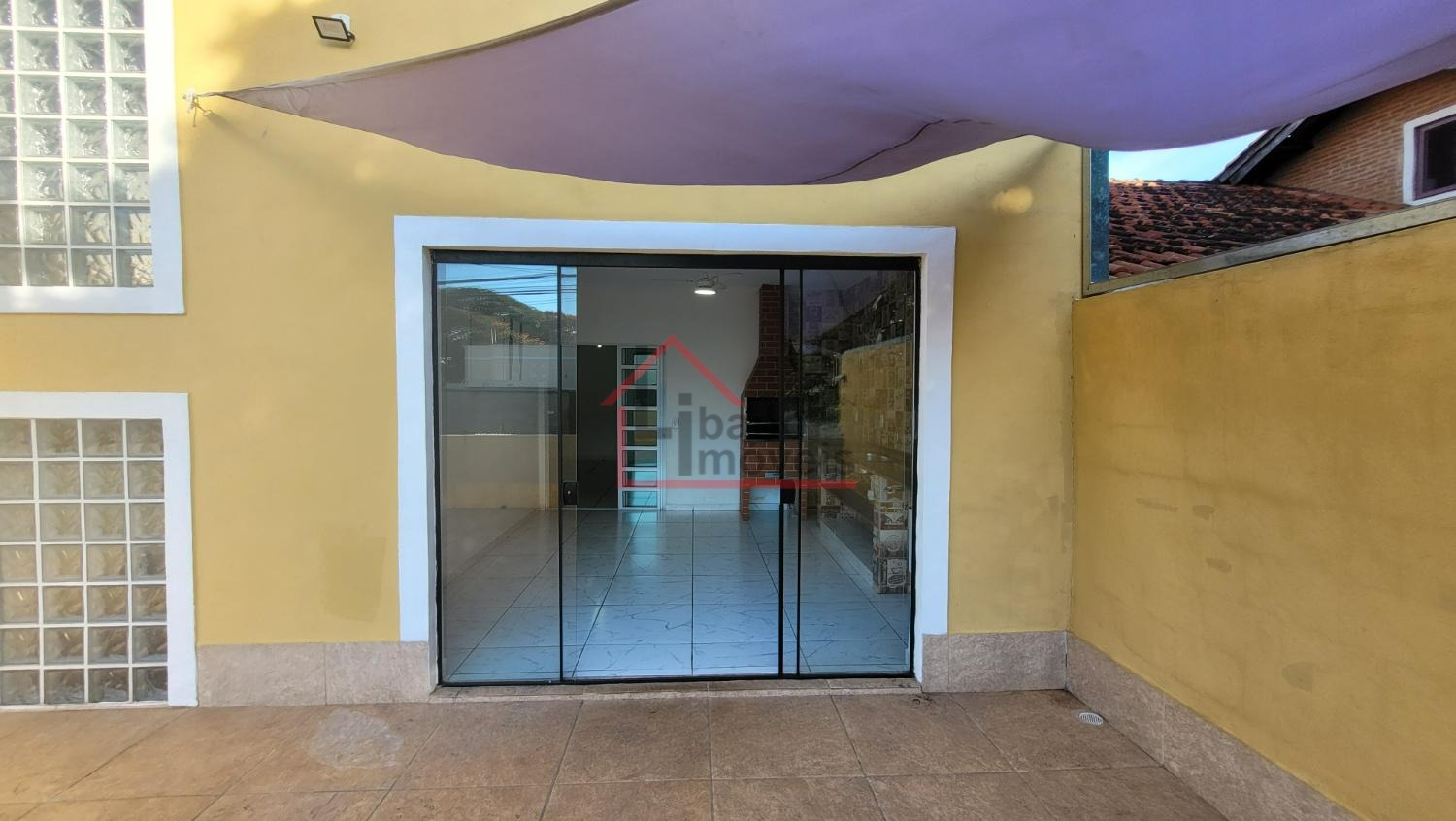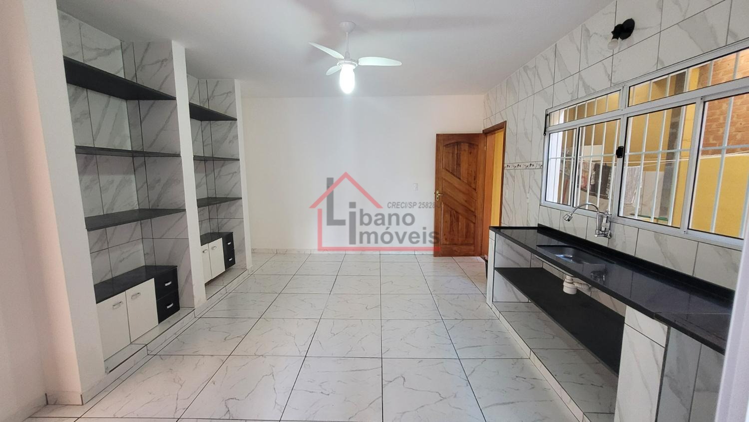 Sala de estar, cozinha ampla, com armários tipo prateleira, espaço de churrasqueira e varanda.