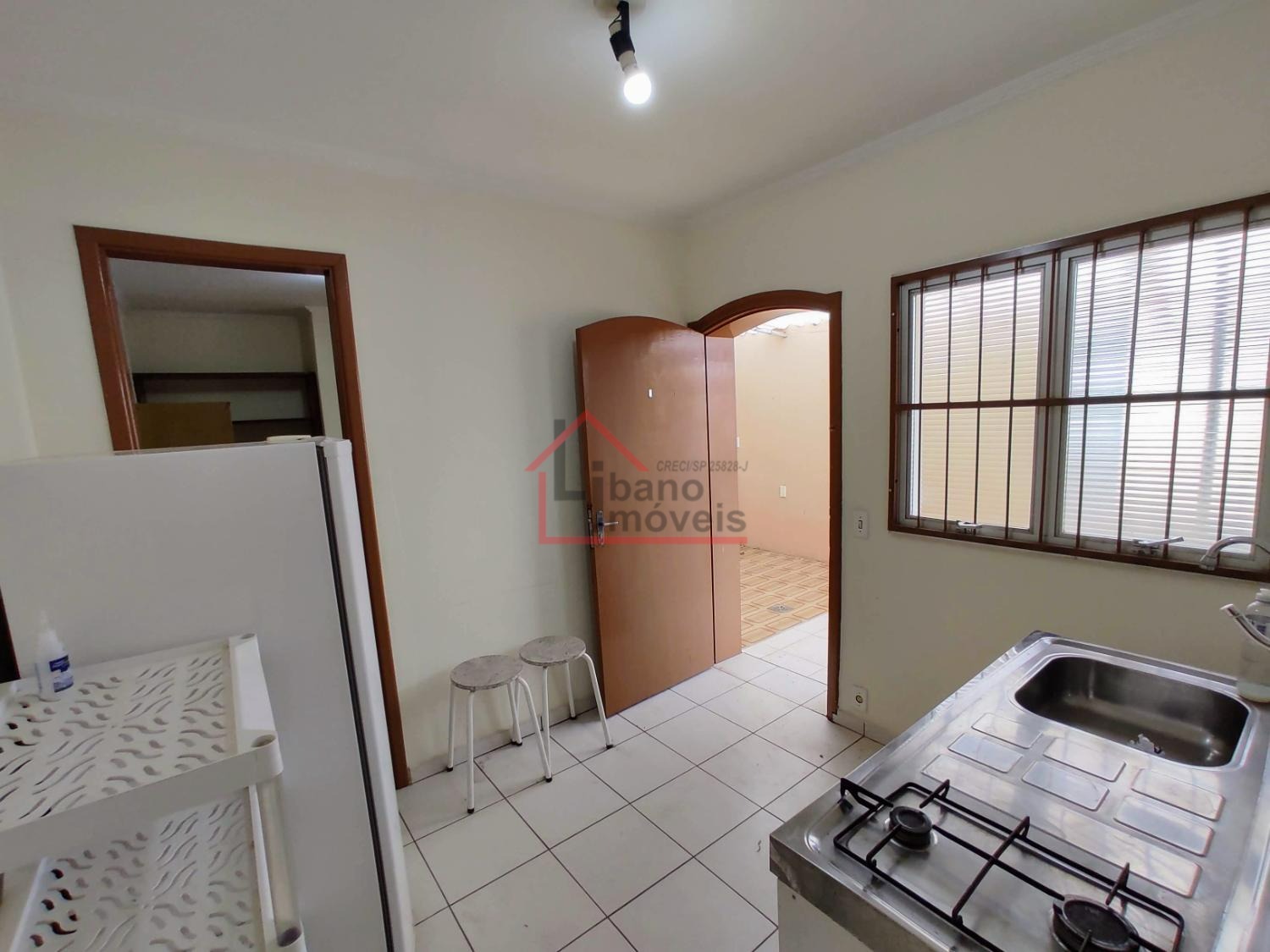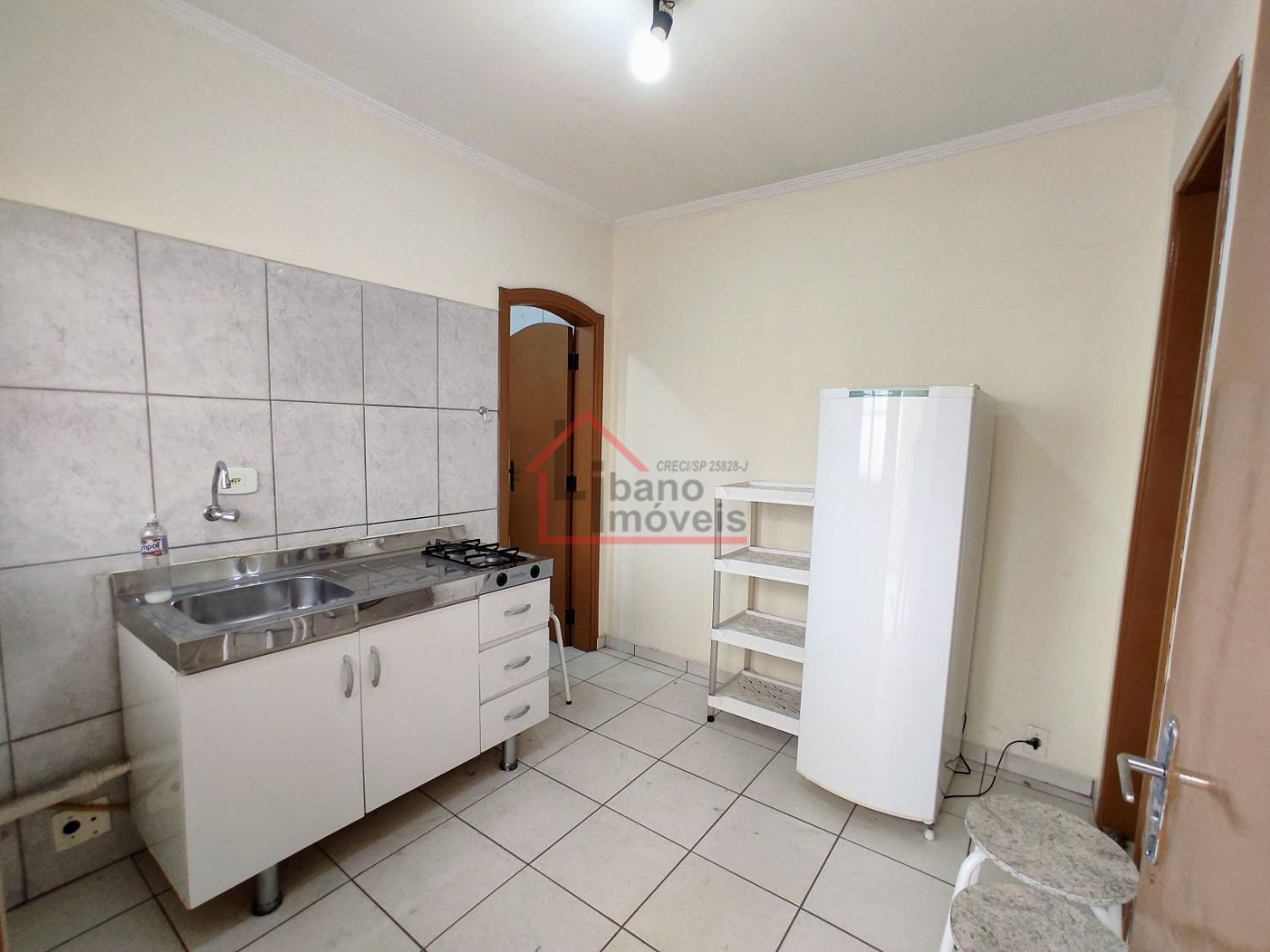 Opção de kitnet com 20 m², com divisória entre cozinha e dormitório, mobiliada com geladeira 240 litros, fogão de 2 bocas sem forno, gabinete pia de cozinha.