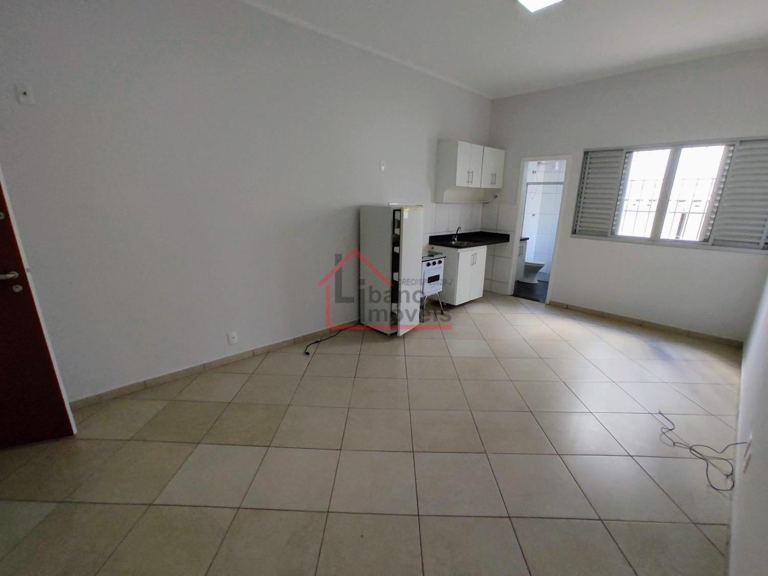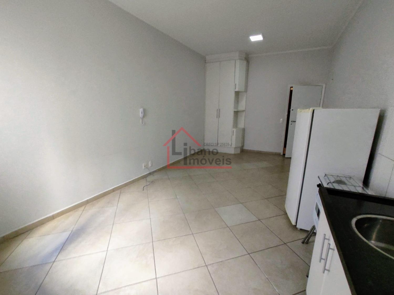 Kitnet do tipo estúdio (sem divisória da cozinha para o dormitório). Cozinha com gabinete, armário embutido no dormitório.