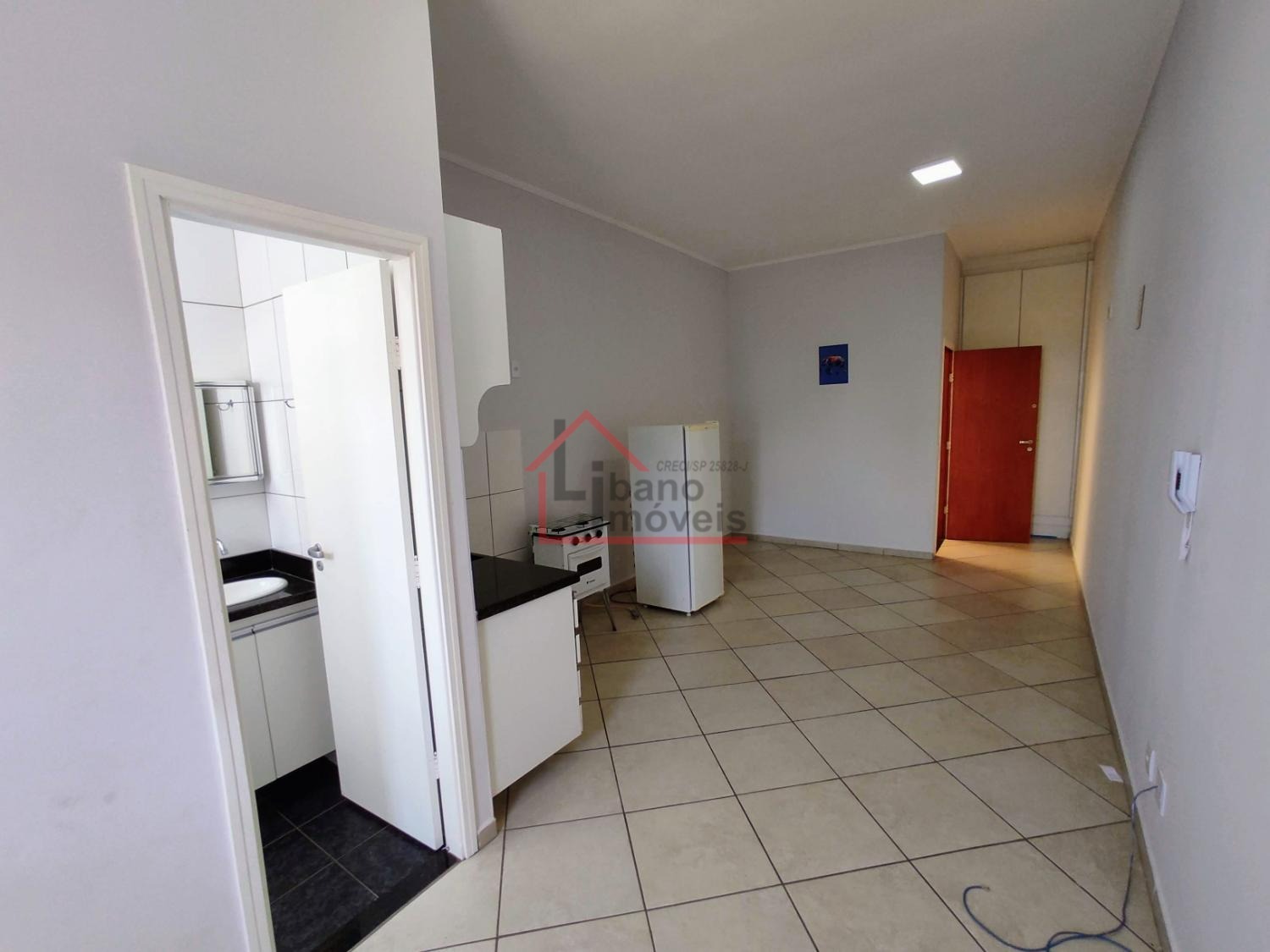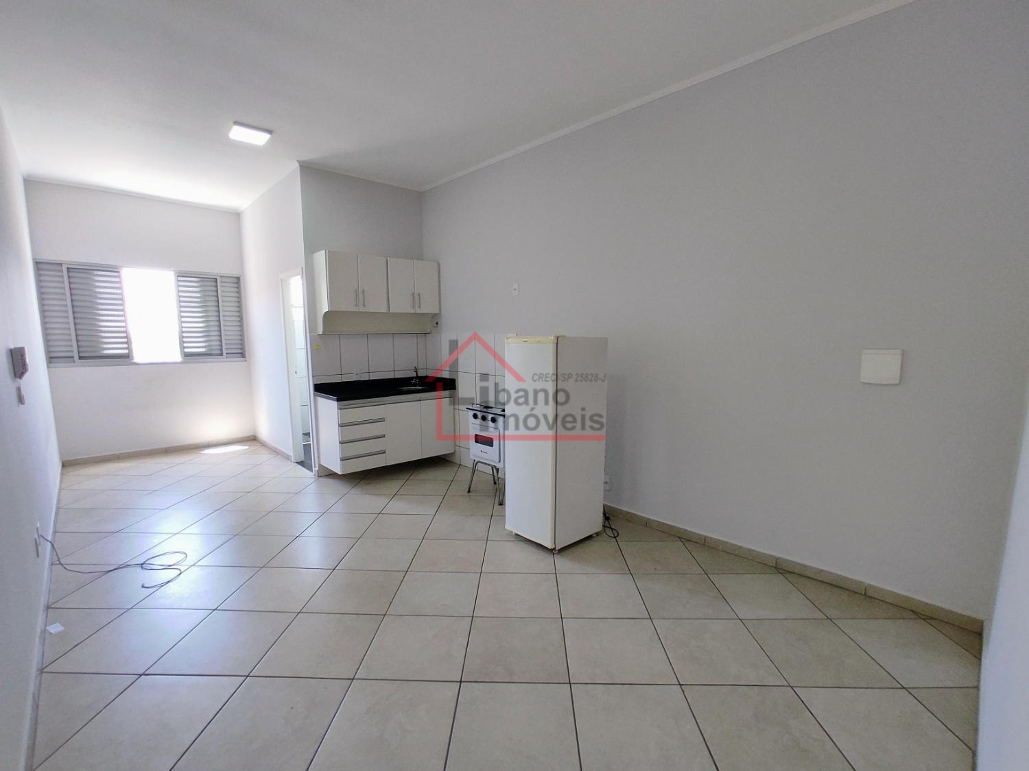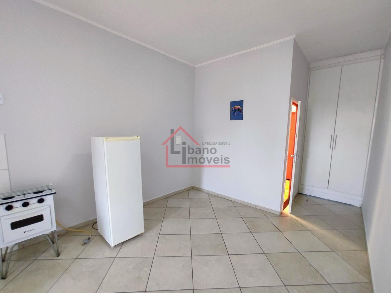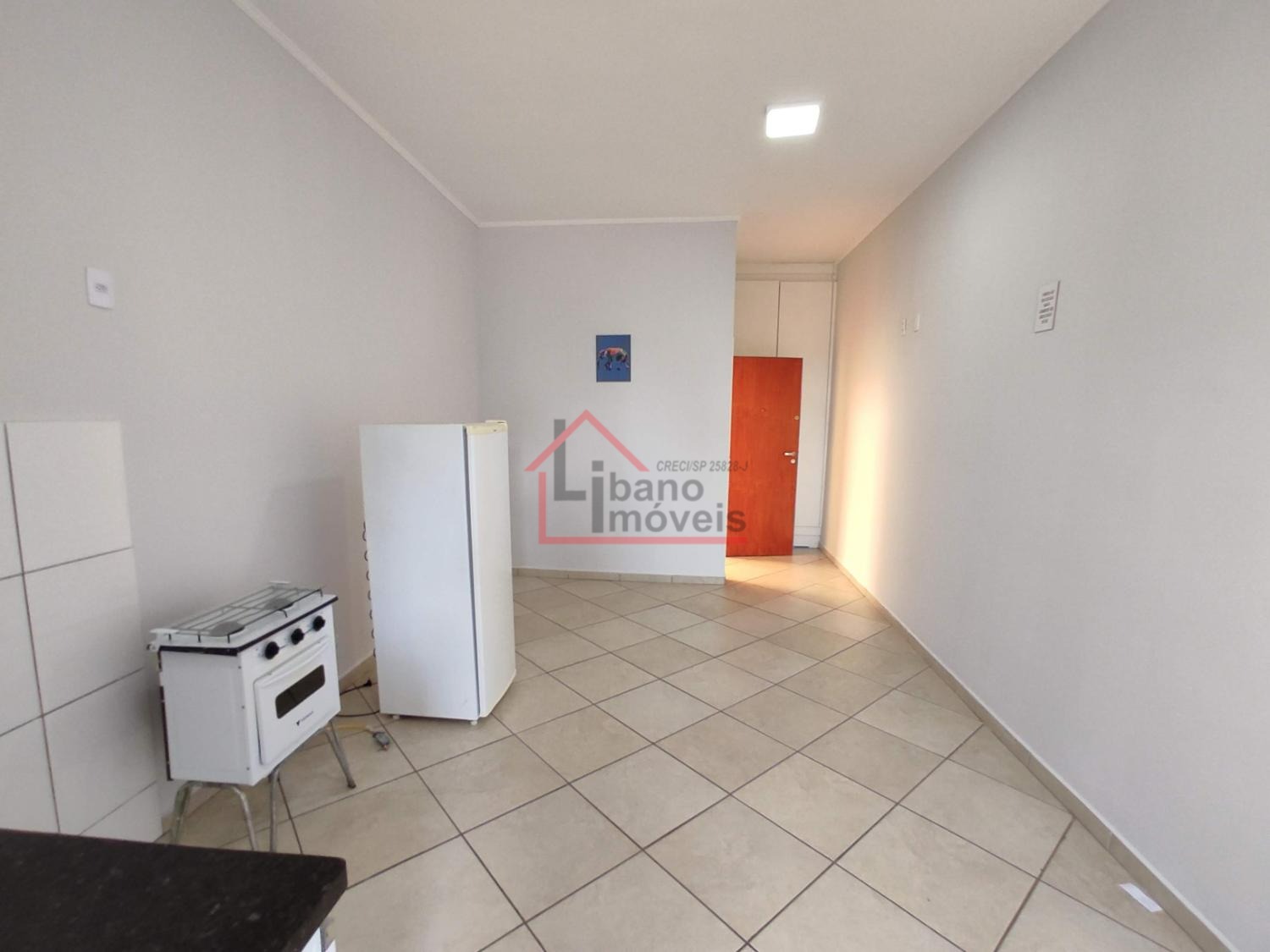 Kitnet do tipo estúdio (sem divisória da cozinha para o dormitório). Cozinha com gabinete, frigobar, fogão pequeno 2 bocas com forno), armário embutido no dormitório.