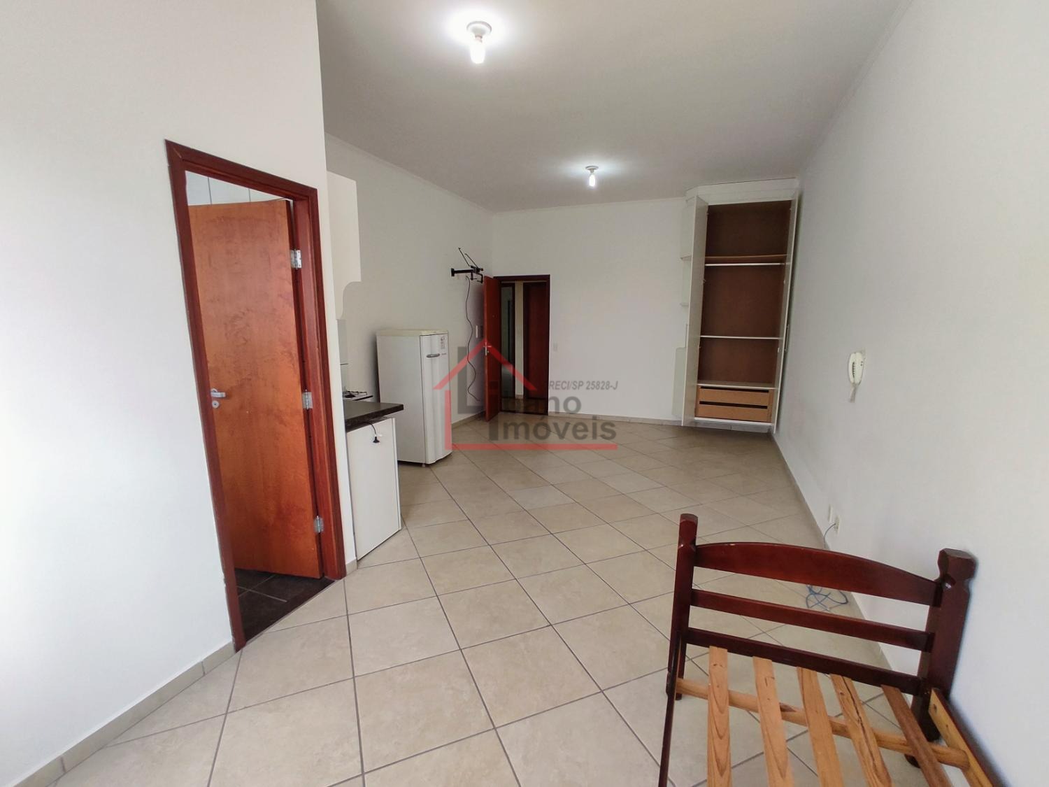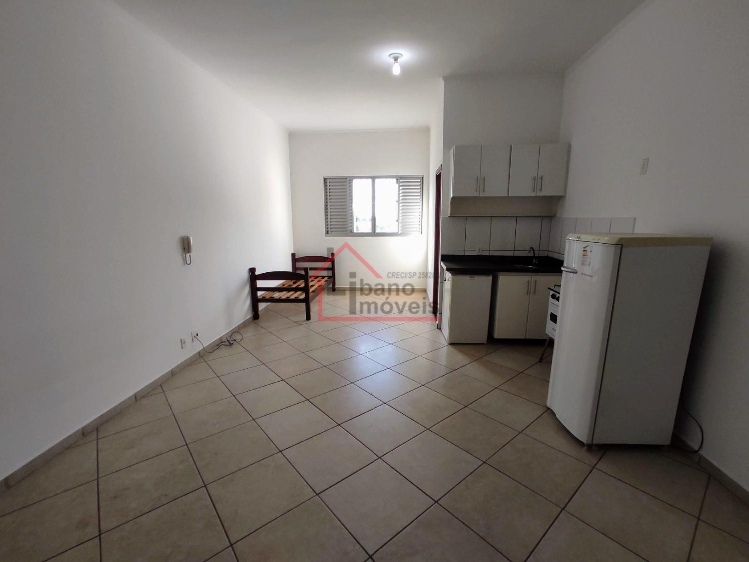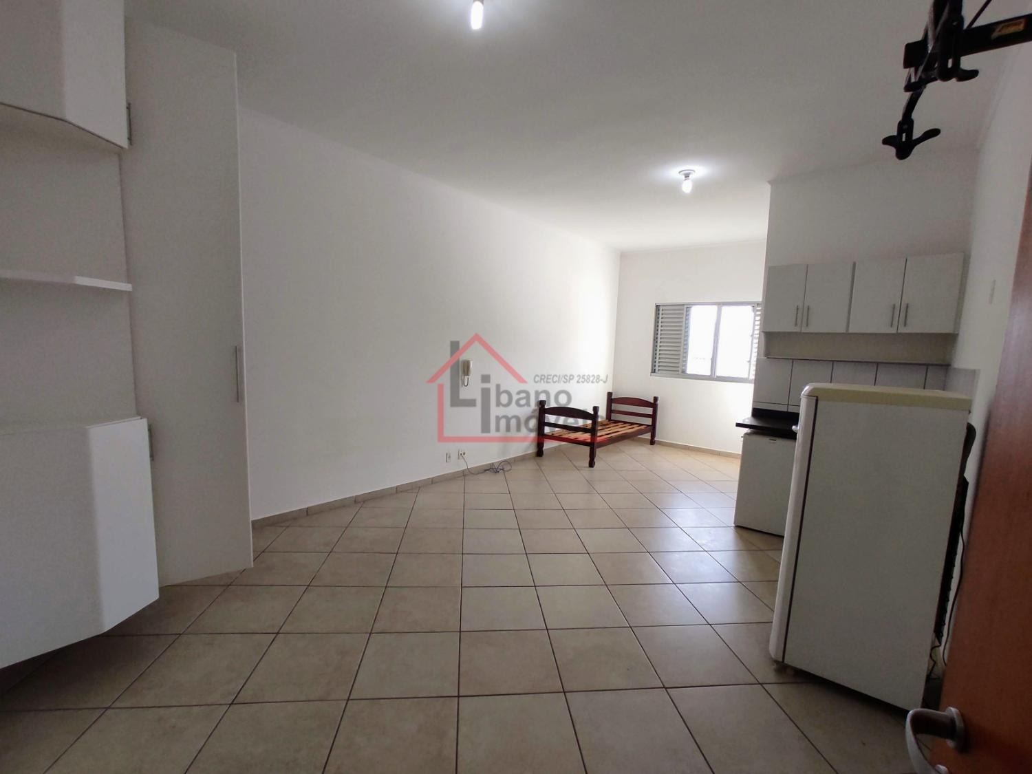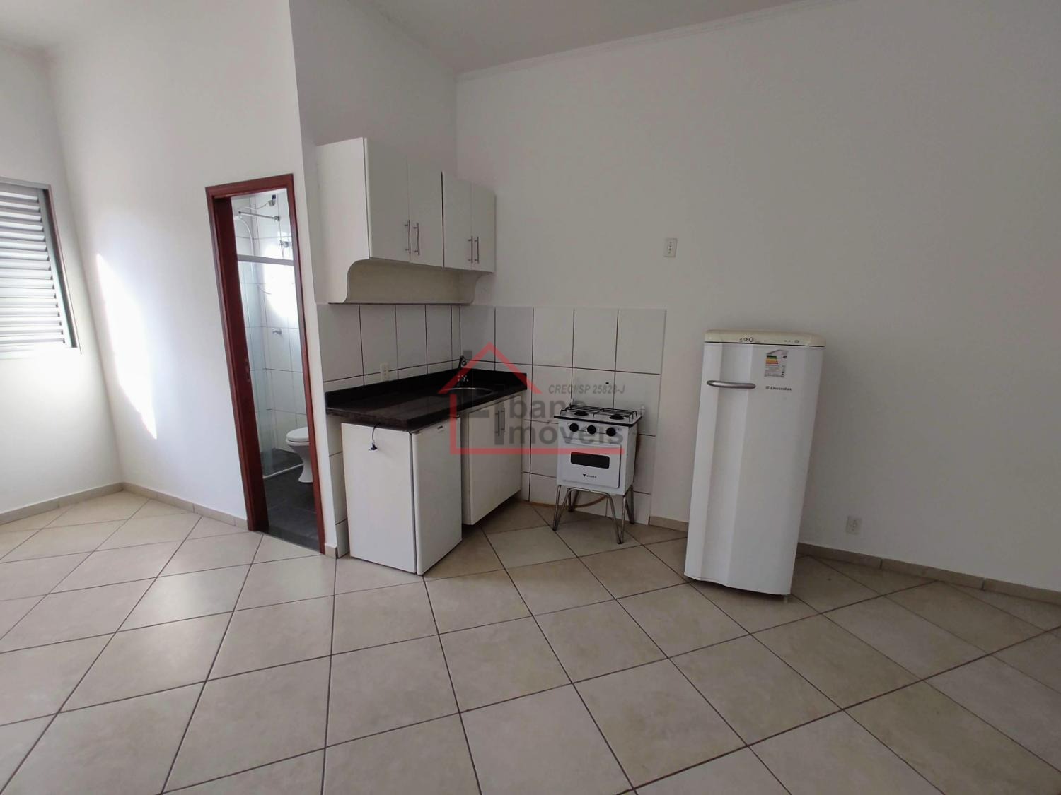 Kitnet do tipo estúdio (sem divisória da cozinha para o dormitório). Cozinha com gabinete, frigobar, fogão pequeno 2 bocas com forno), armário embutido no dormitório.