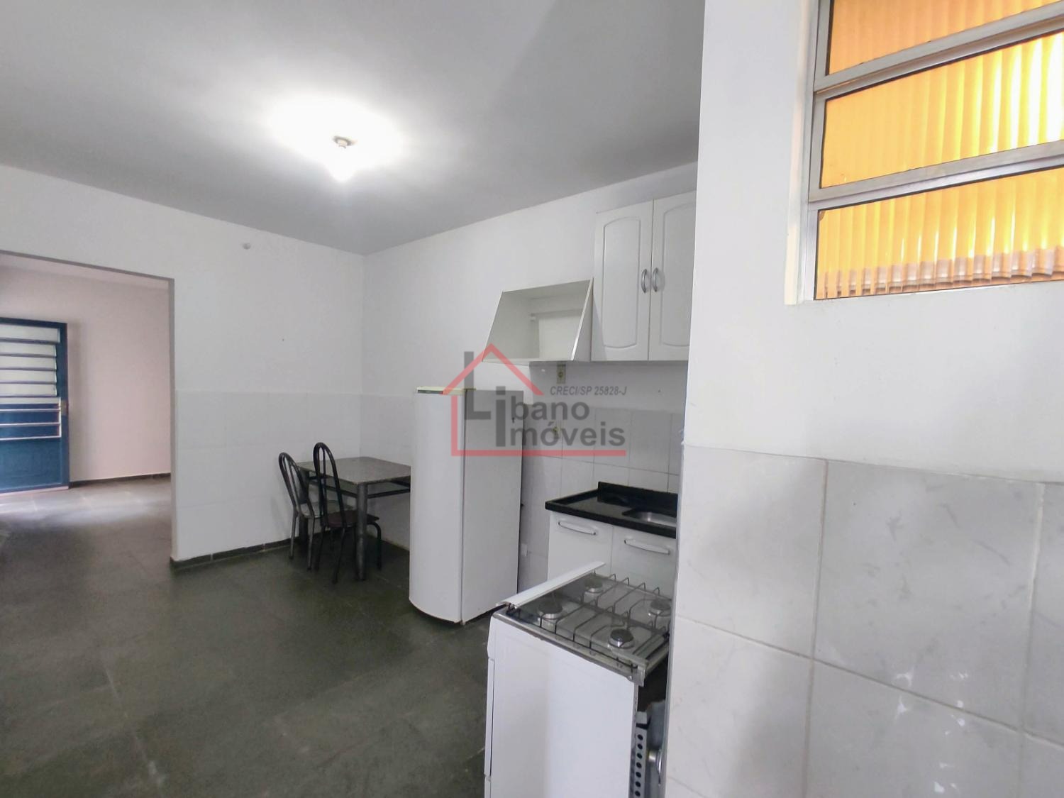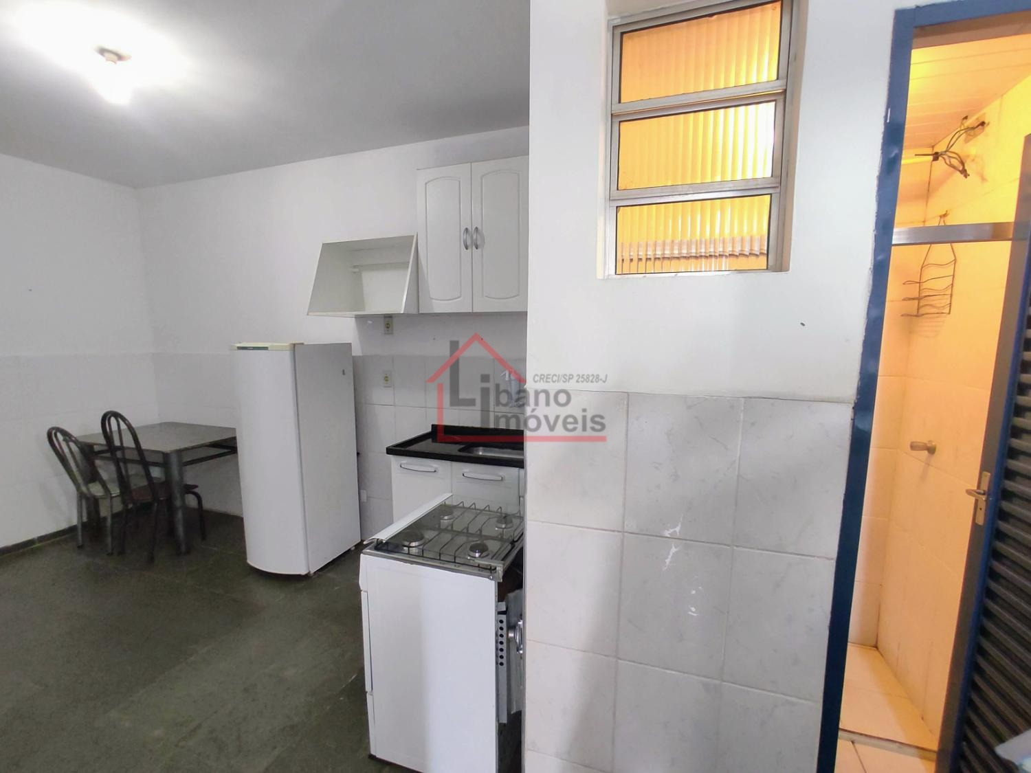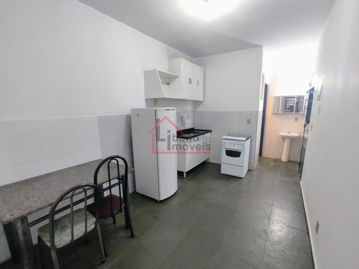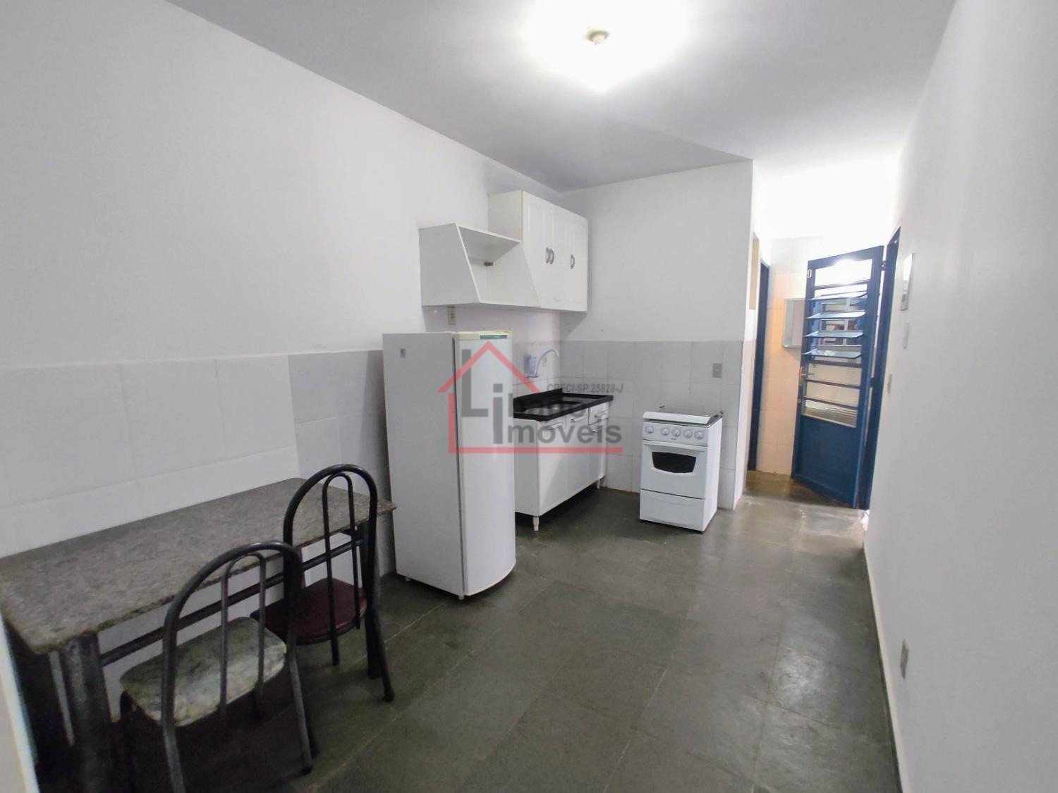 Opção de kitnet térrea, do tipo estúdio (sem divisória da cozinha para dormitório). Mobiliada com geladeira, fogão 4 bocas com forno, armários cozinha, armário guarda roupas, mesa com cadeira, opção de cama solteiro sem colchão.