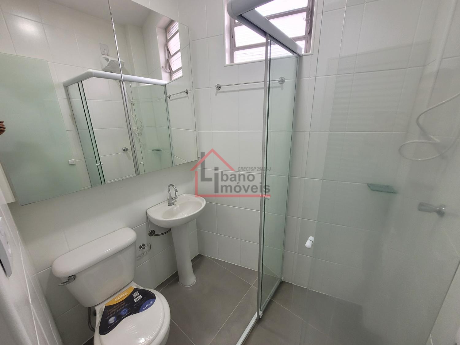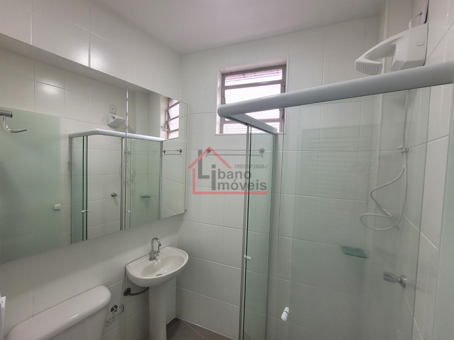 Banheiro com box de vidro, espelhos, armários.
