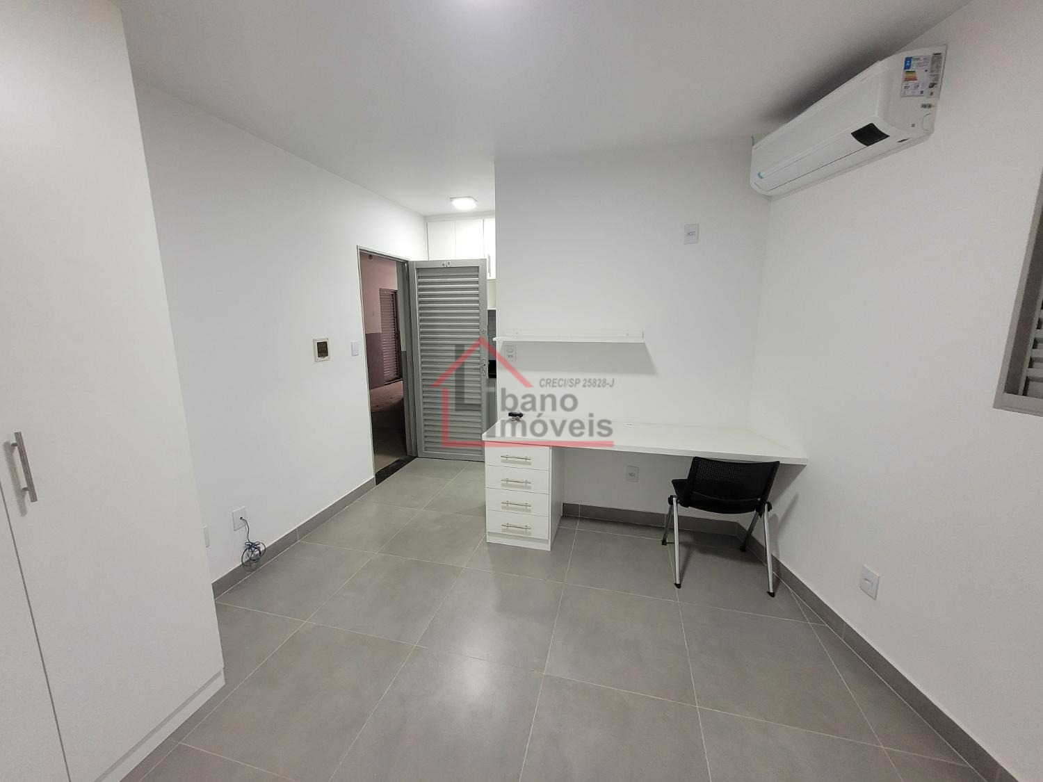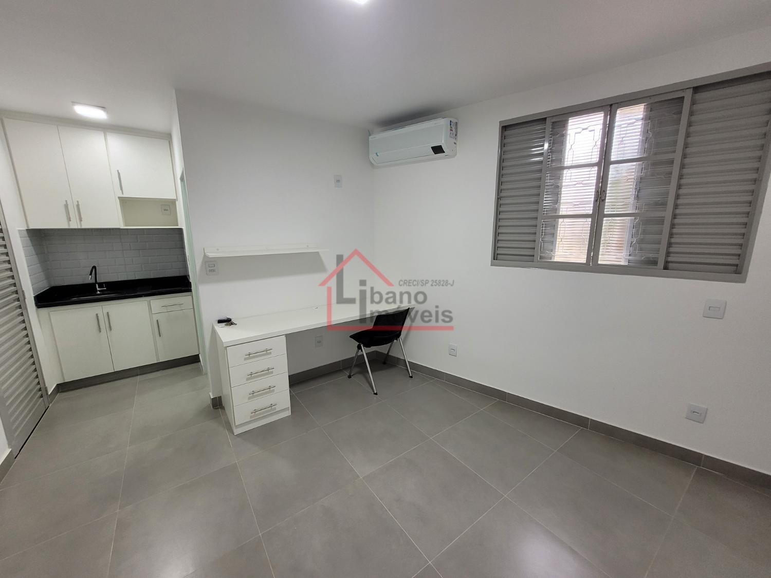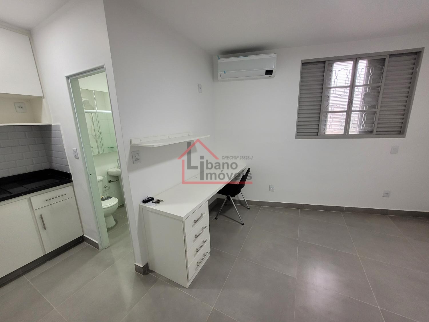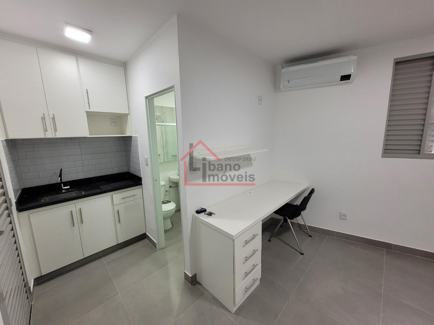 Kitnets mobiliadas com geladeira frost free, fogão por indução, mesa planejada de estudos bem ampla, com cadeira.