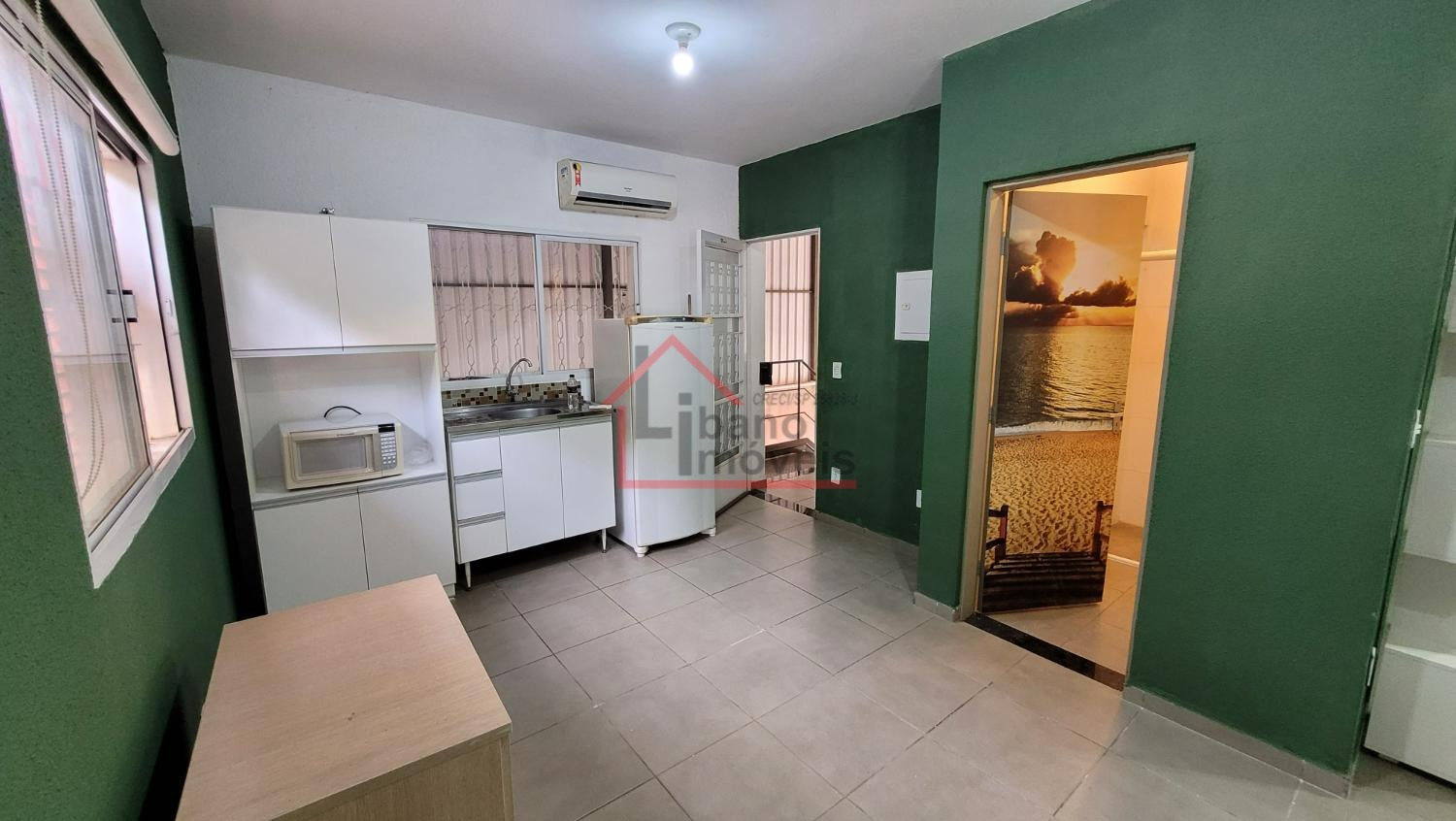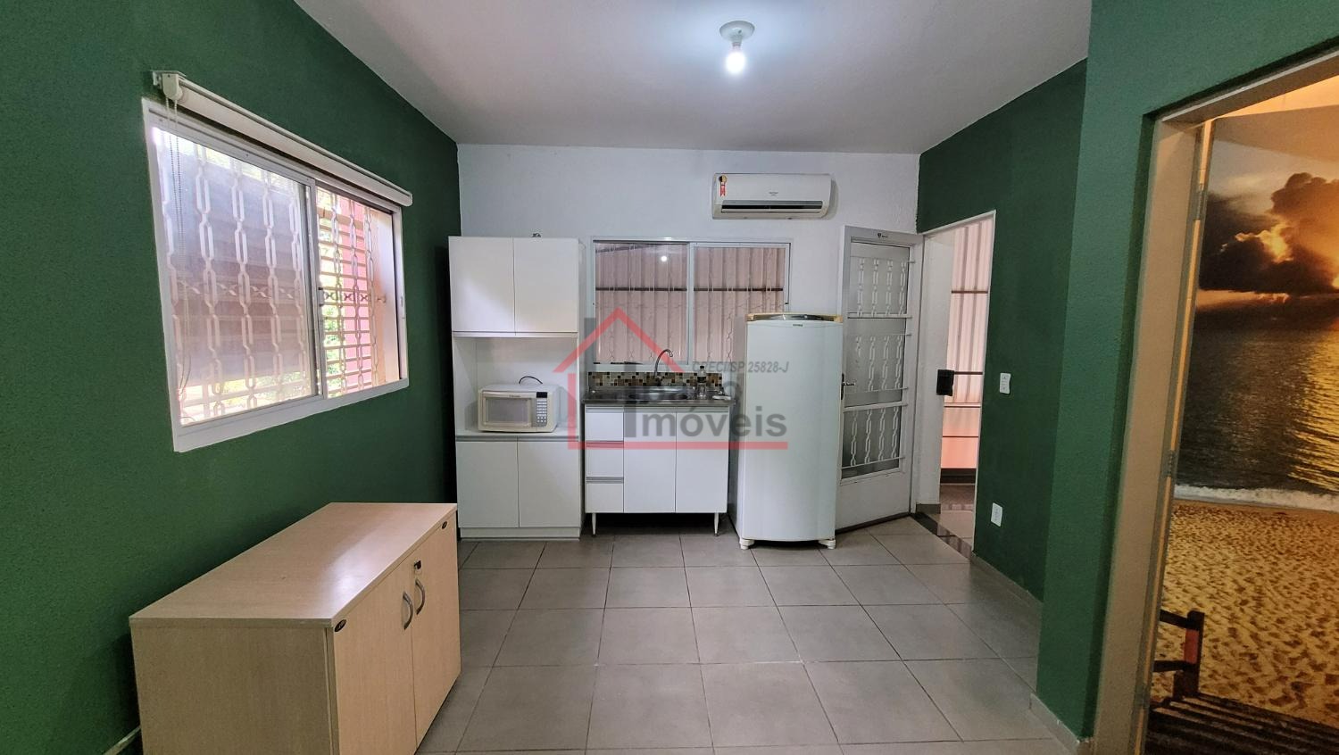 Cozinha com gabinete embaixo da pia, armários do tipo guarda roupas, mesa de escritório. Cama box de casal, geladeira, amrários auxiliares, fogão 4 bocas.