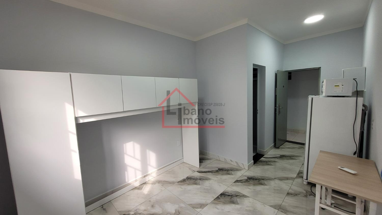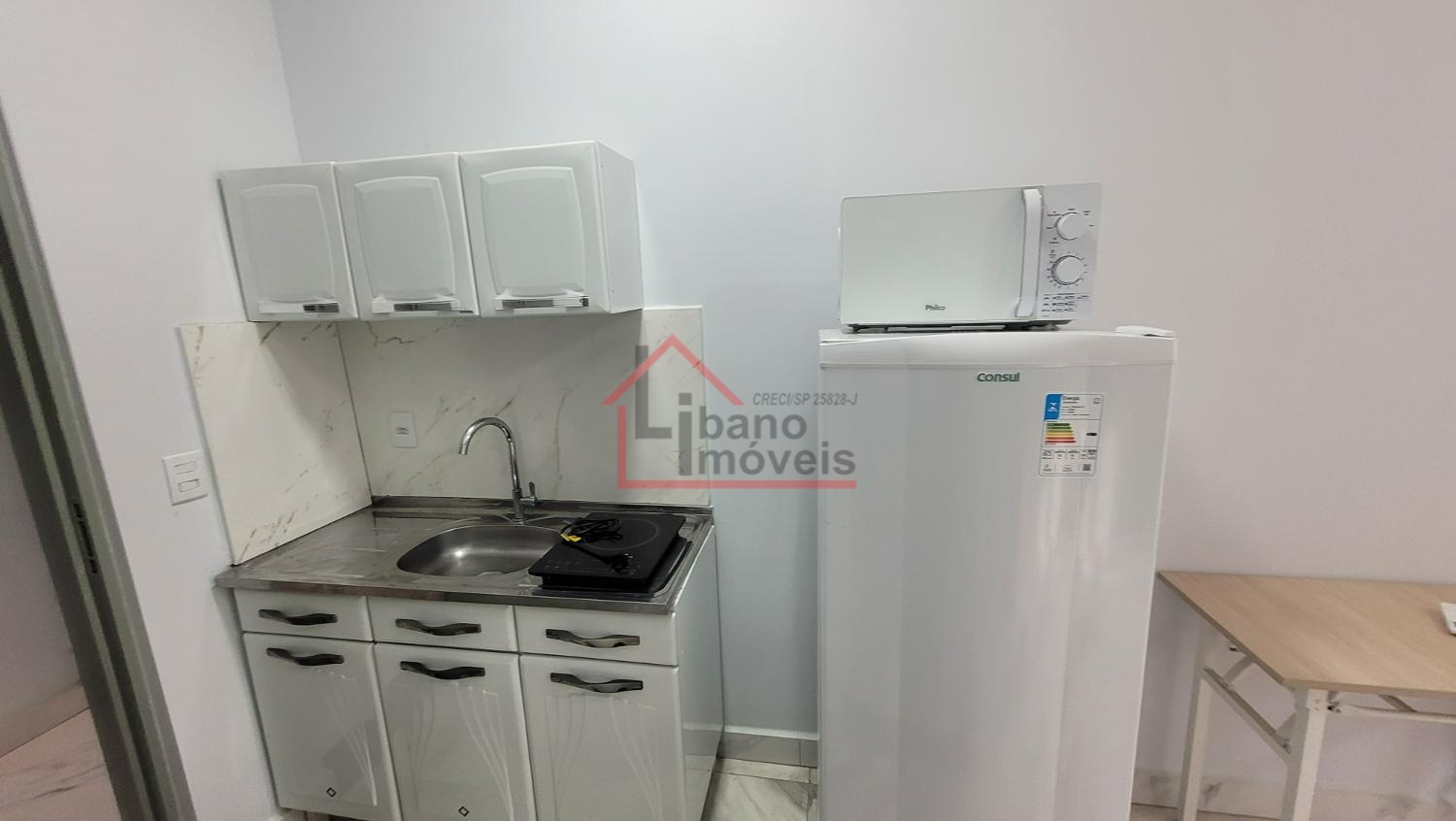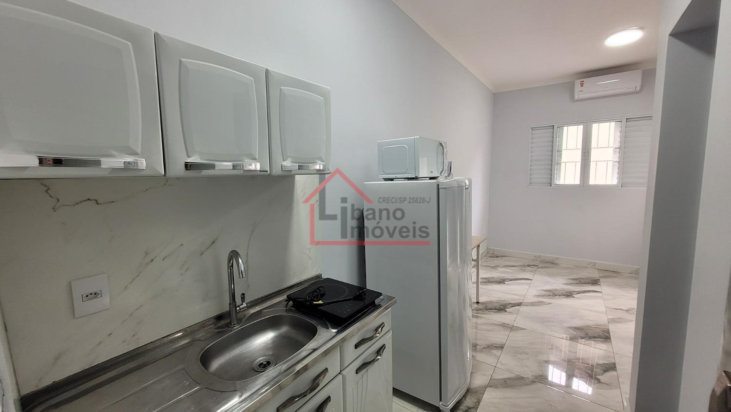 Kitnet do tipo estúdio (sem divisória) entre dormitório e cozinha. Unidade 1º andar.