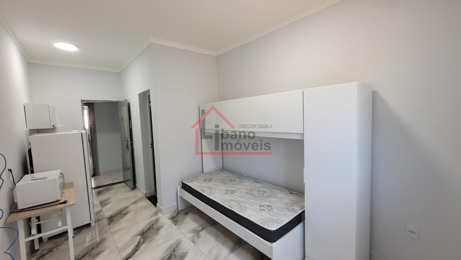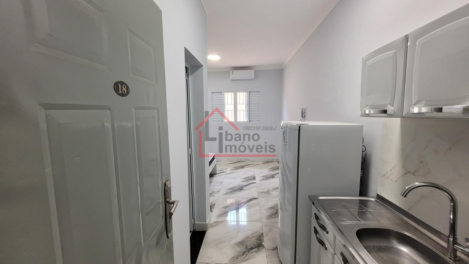 Kitnet do tipo estúdio (sem divisória) entre dormitório e cozinha. Unidade 1º andar.