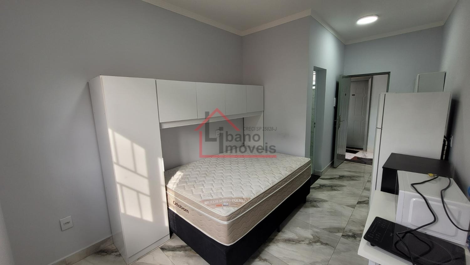 Kitnet do tipo estúdio (sem divisória) entre dormitório e cozinha. Unidade 1º andar.
