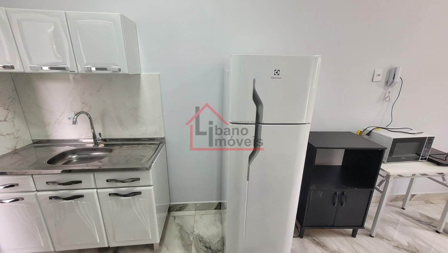 Piso porcelanato, armários de cozinha, geladeira, fogão cook top, microondas
