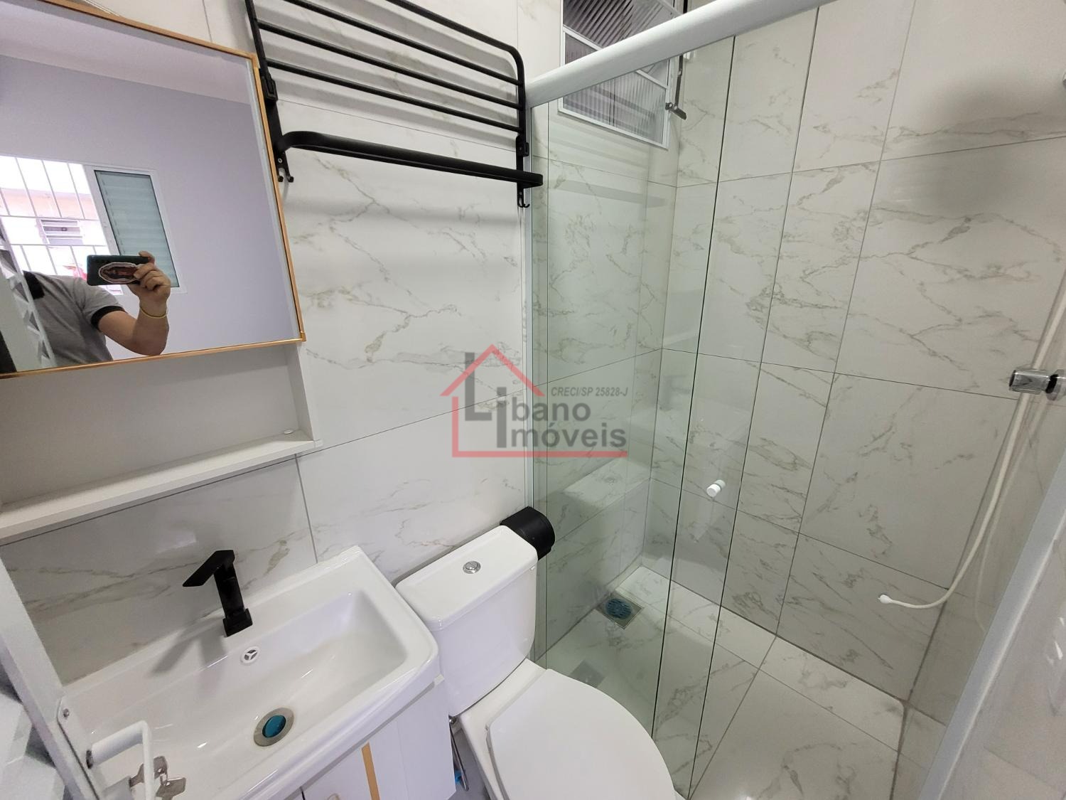 Banheiro com box de vidro.