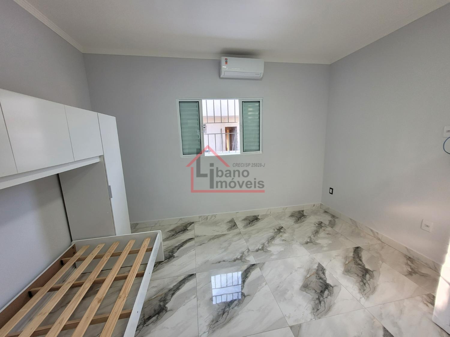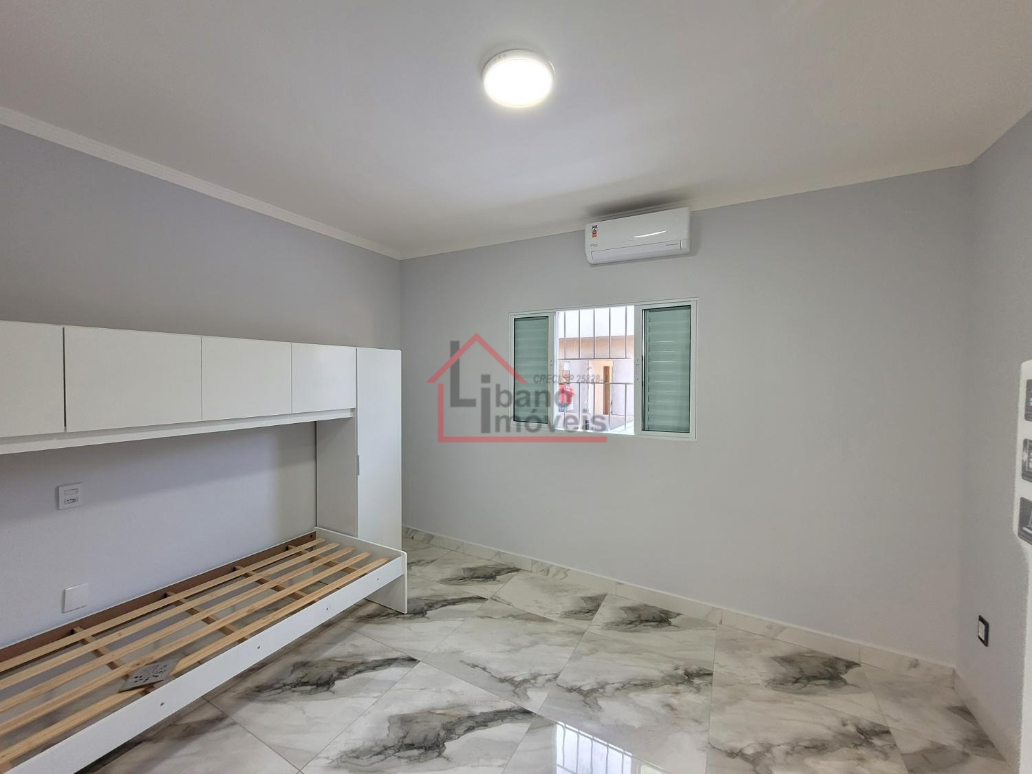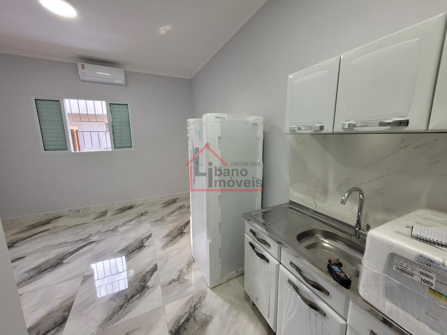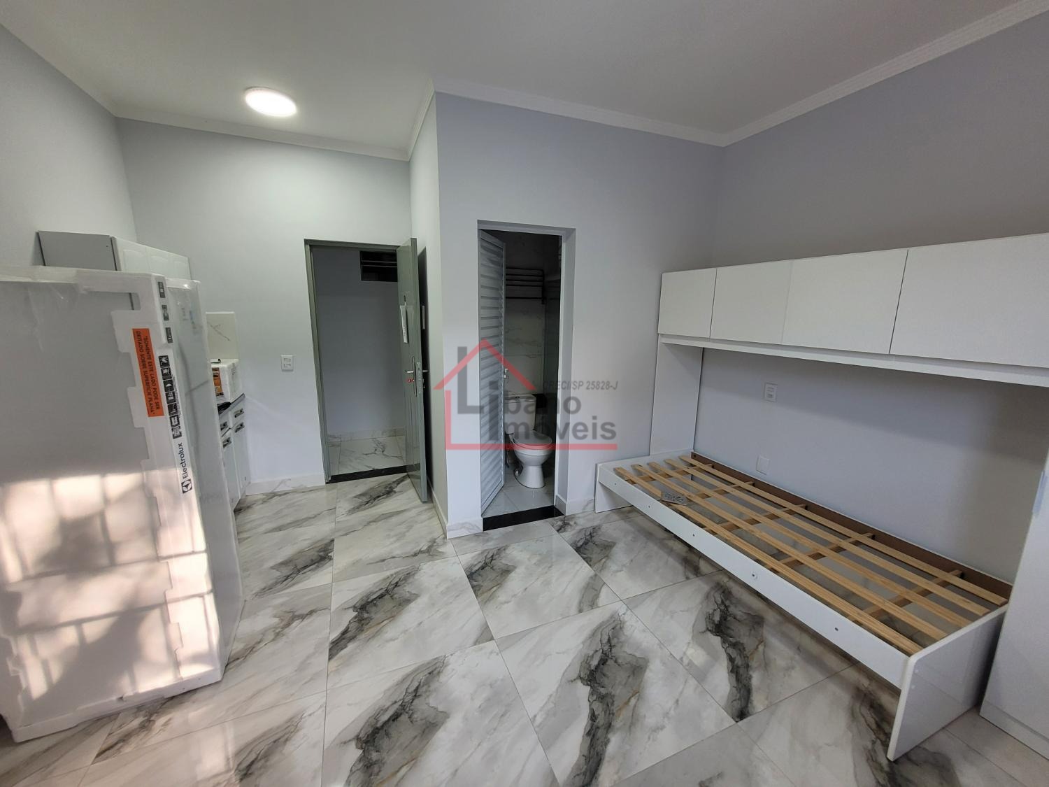 Kitnet do tipo estúdio (sem divisória) entre dormitório e cozinha. Unidade 1º andar.
