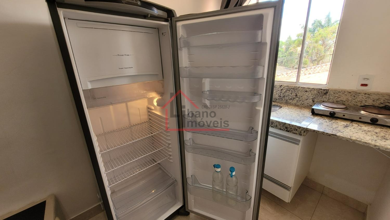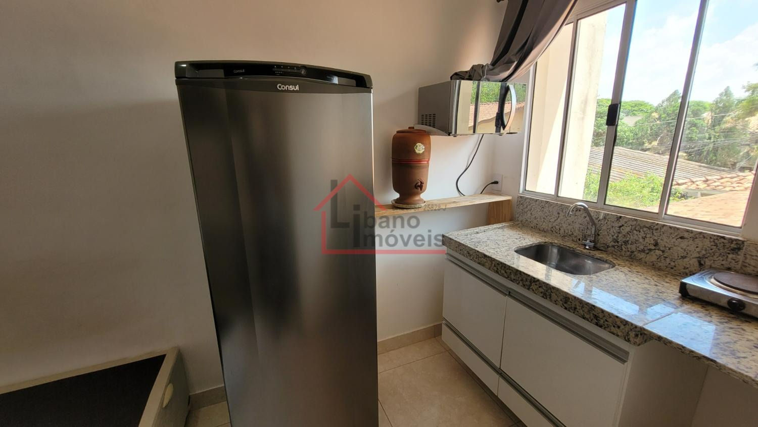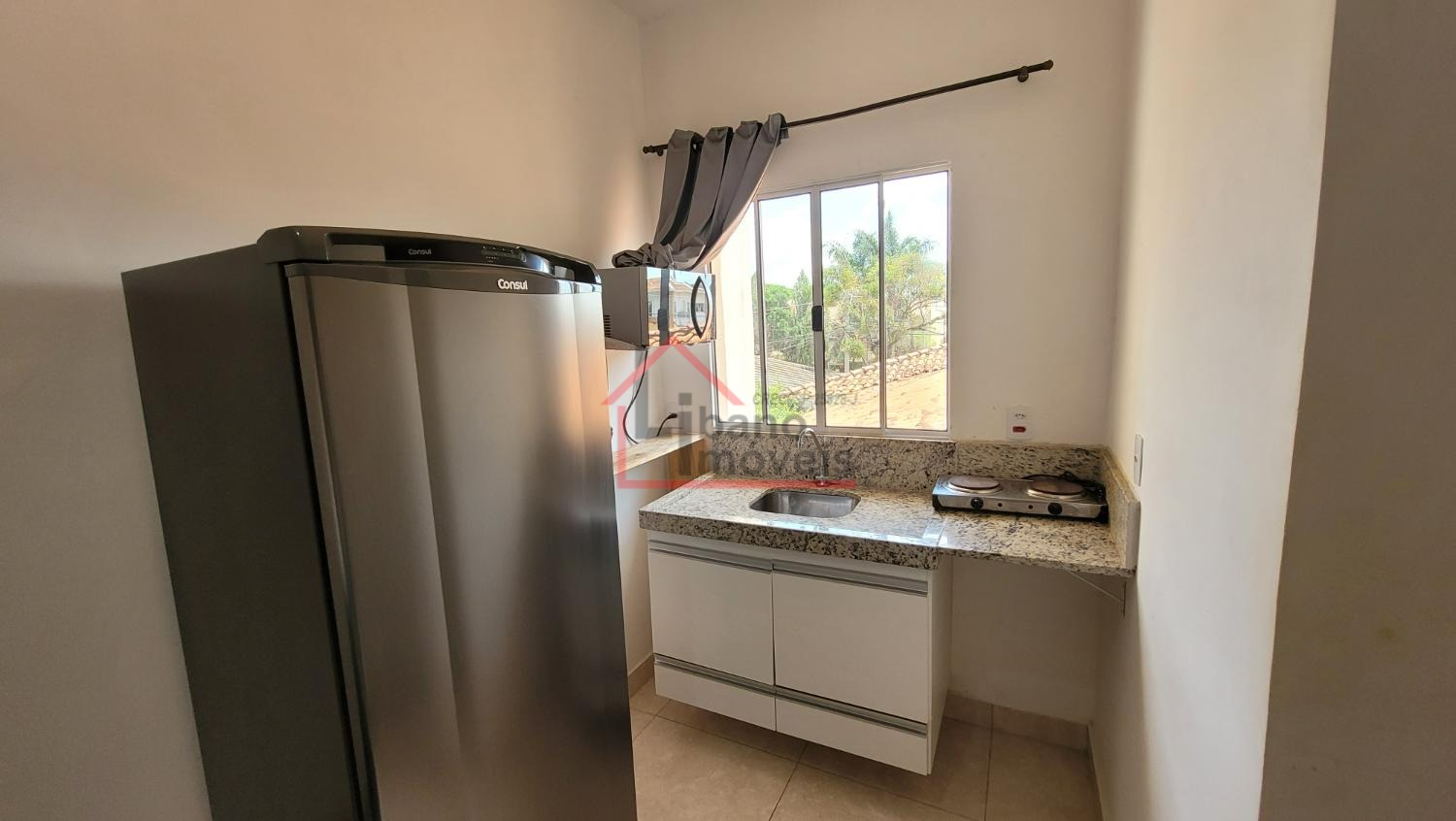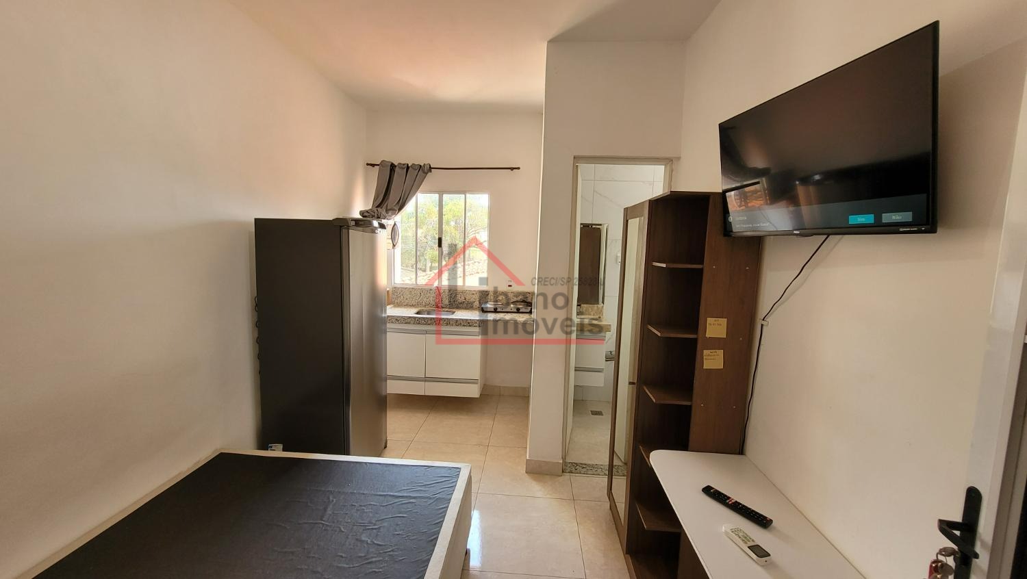 Mobiliada com geladeira frost free, fogão elétrico 2 bocas, micro-ondas. Armário guarda roupas, cama com colchão, mesa retrátil. Televisão SmarTV e cadeiras.