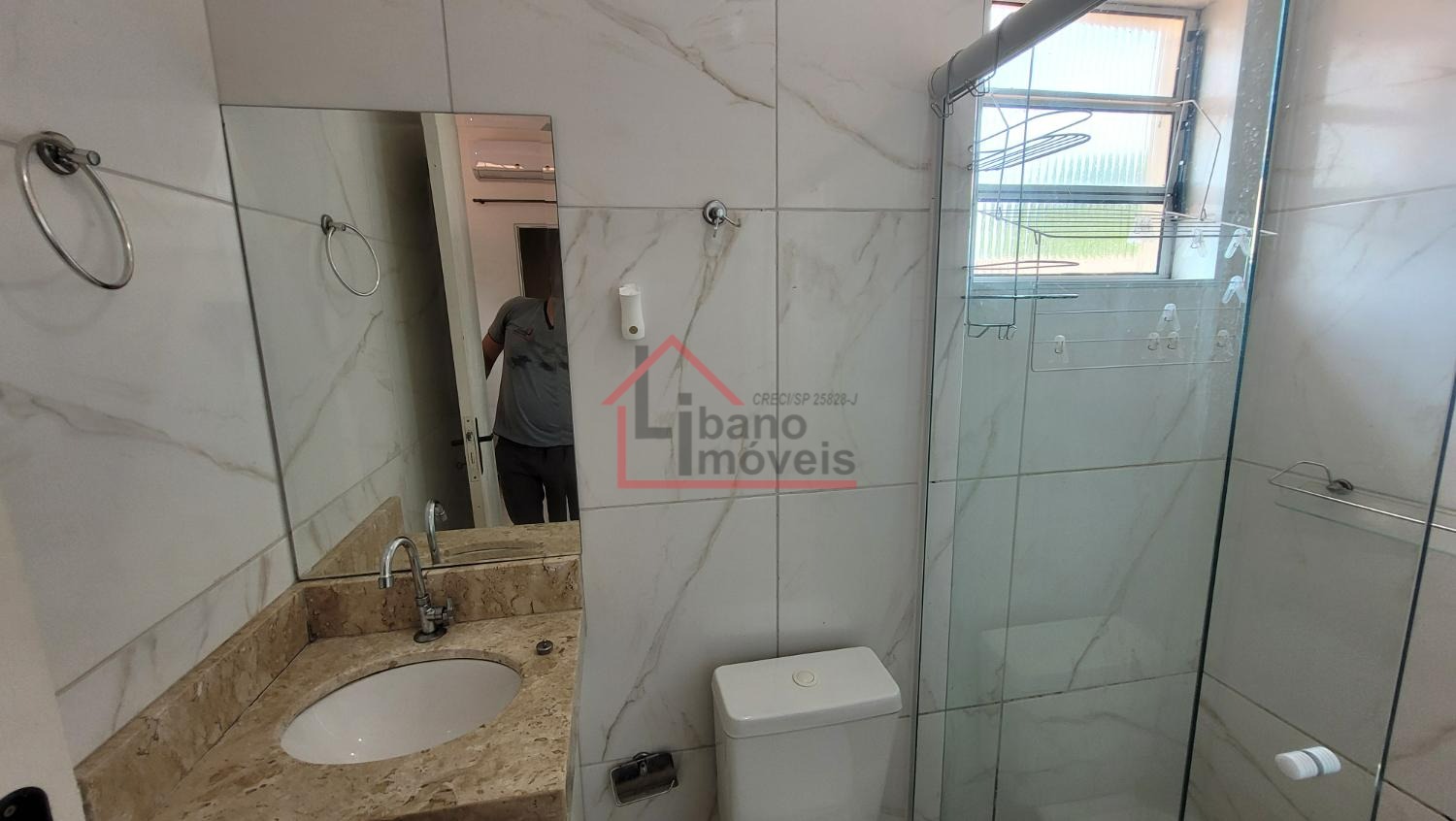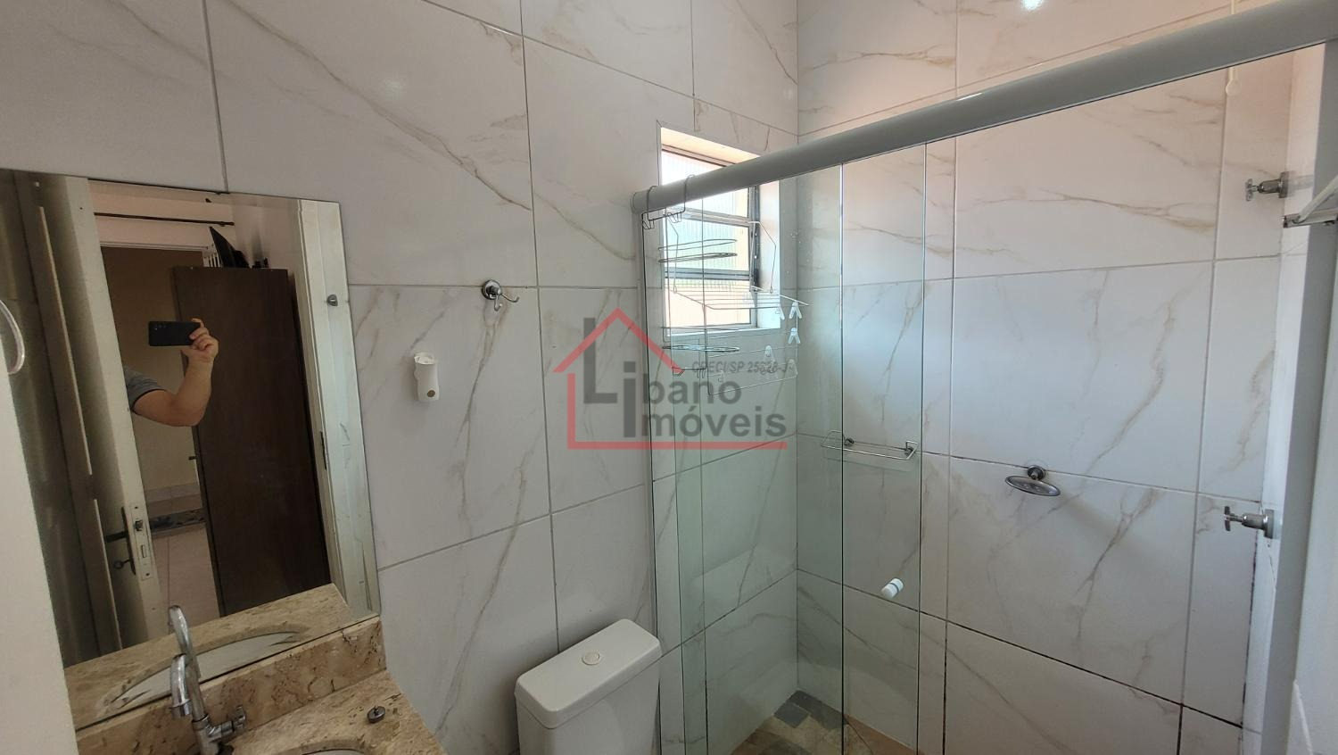 Banheiro com box de vidro.