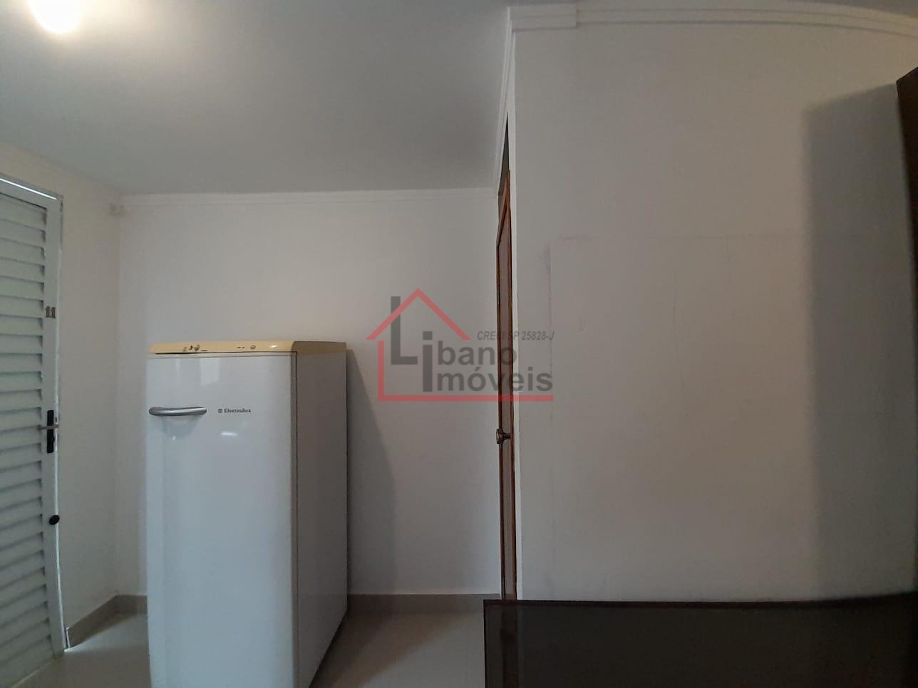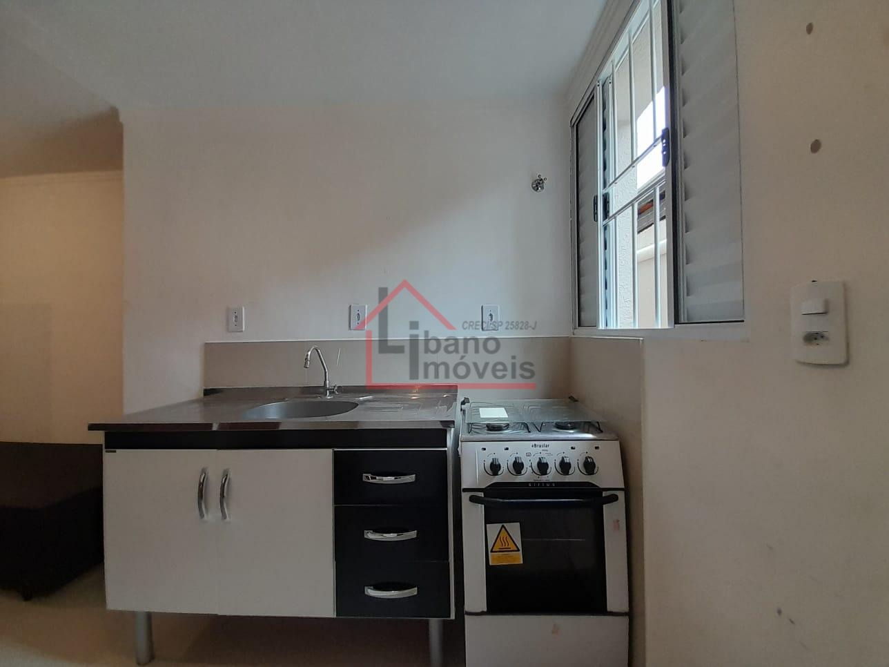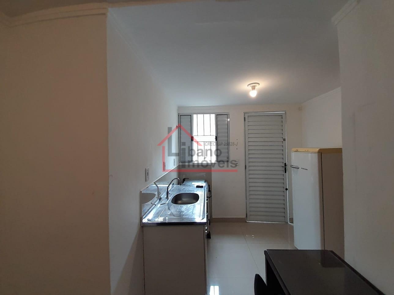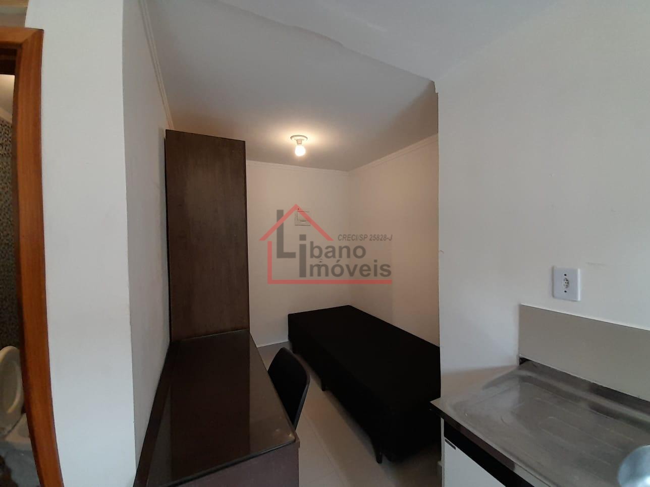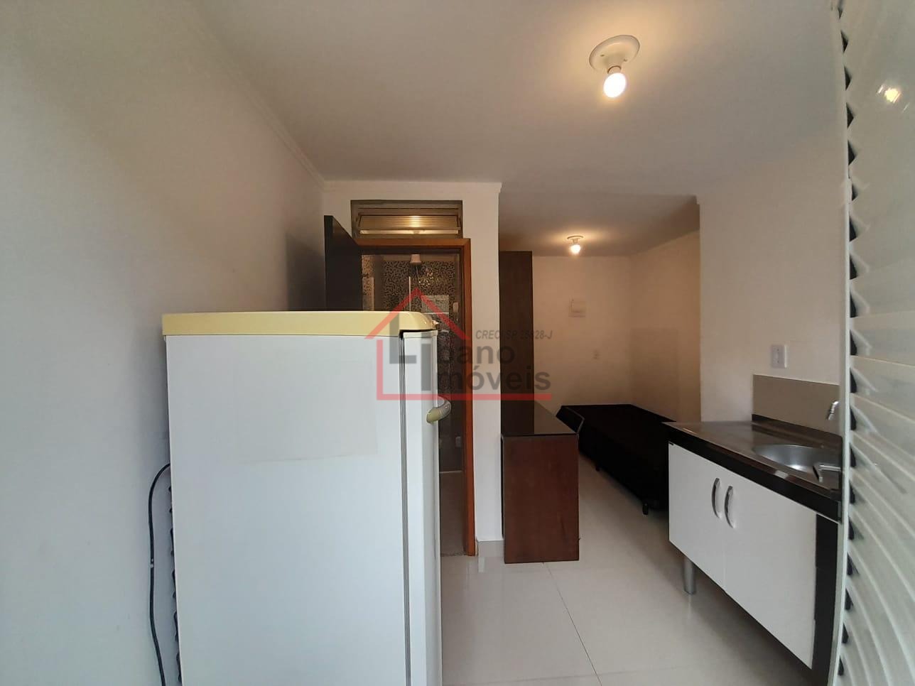 Kit de bom padrão, mobiliada com geladeira, fogão 2 bocas à gás, mesa de estudos, cama box de solteiro sem colchão, armário, mesa de refeição e gabinete abaixo da pia.