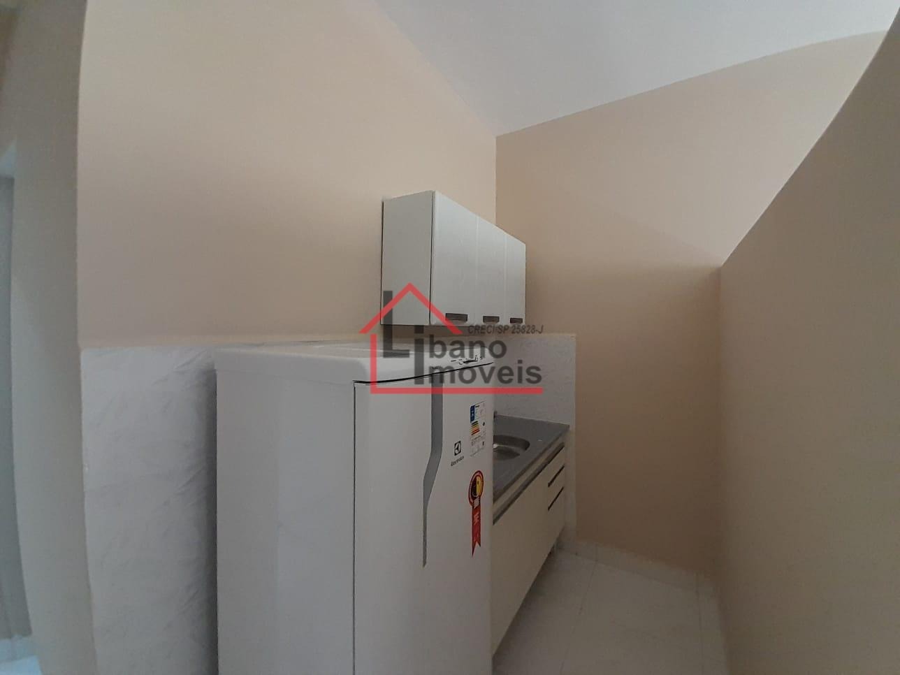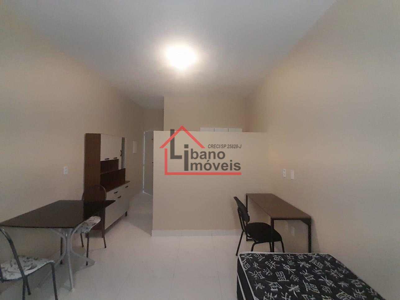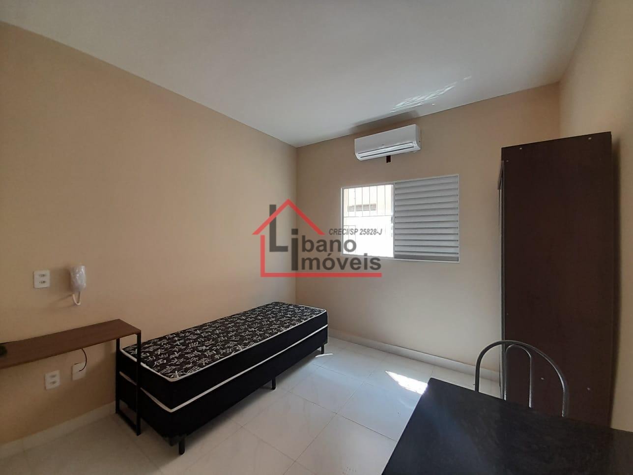 Cozinha americana, mobiliado com geladeira, fogão 2 bocas de indução, armários, mesa de jantar, escrivaninha, poltrona, cama tipo box sem colchão, chuveiro e ar condicionado. Portão acionado com senha.