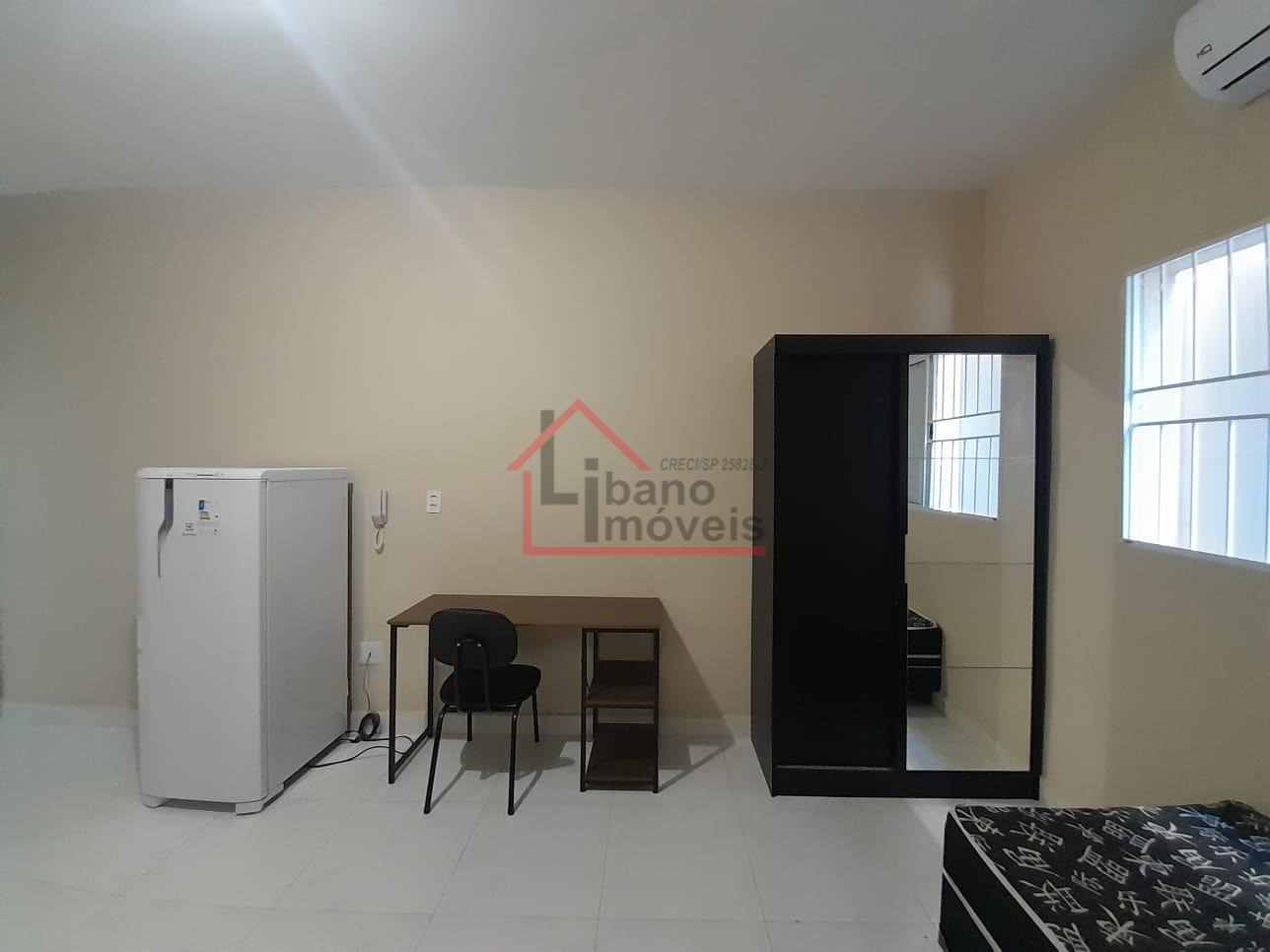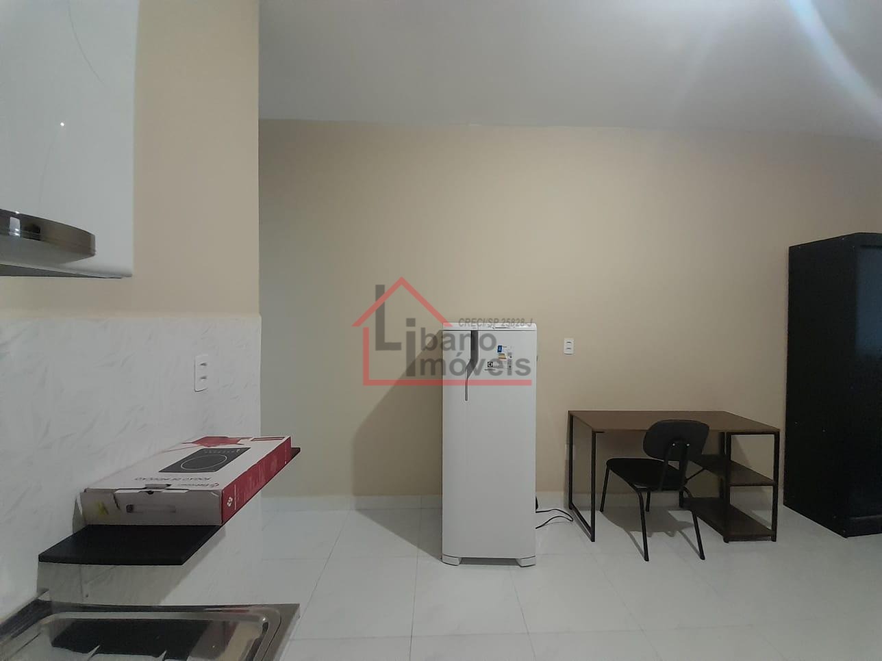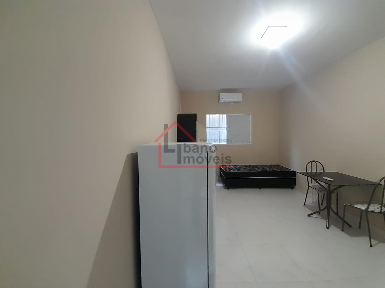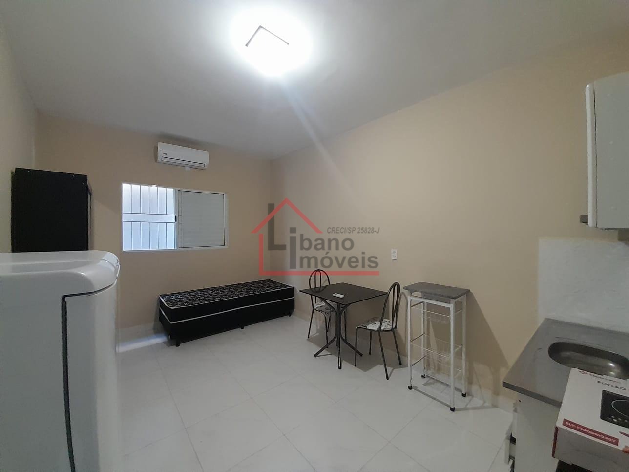 Cozinha americana, mobiliado com geladeira, fogão 2 bocas de indução, armários, mesa de jantar, escrivaninha, poltrona, cama tipo box sem colchão, chuveiro e ar condicionado. Portão acionado com senha.