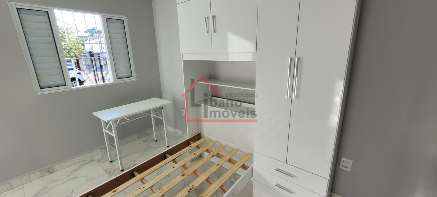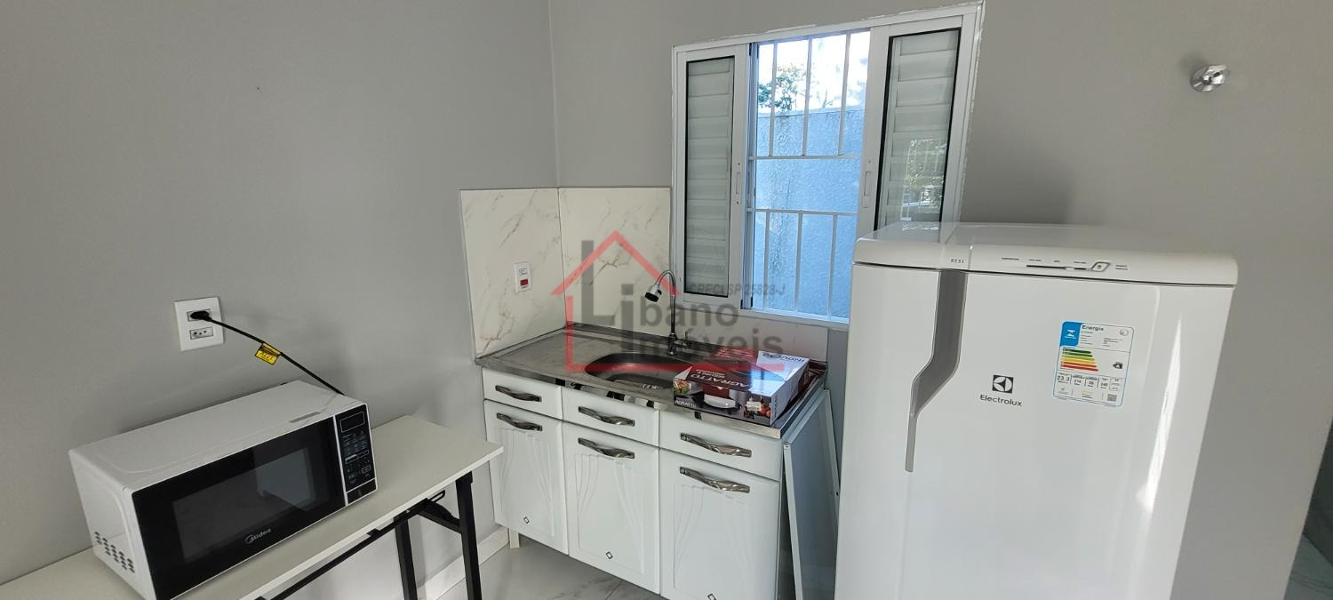 Mobiliada com geladeira, fogão cook-top por indução, armário de cozinha, cama sem colchão, armário guarda roupas e mesa de apoio.