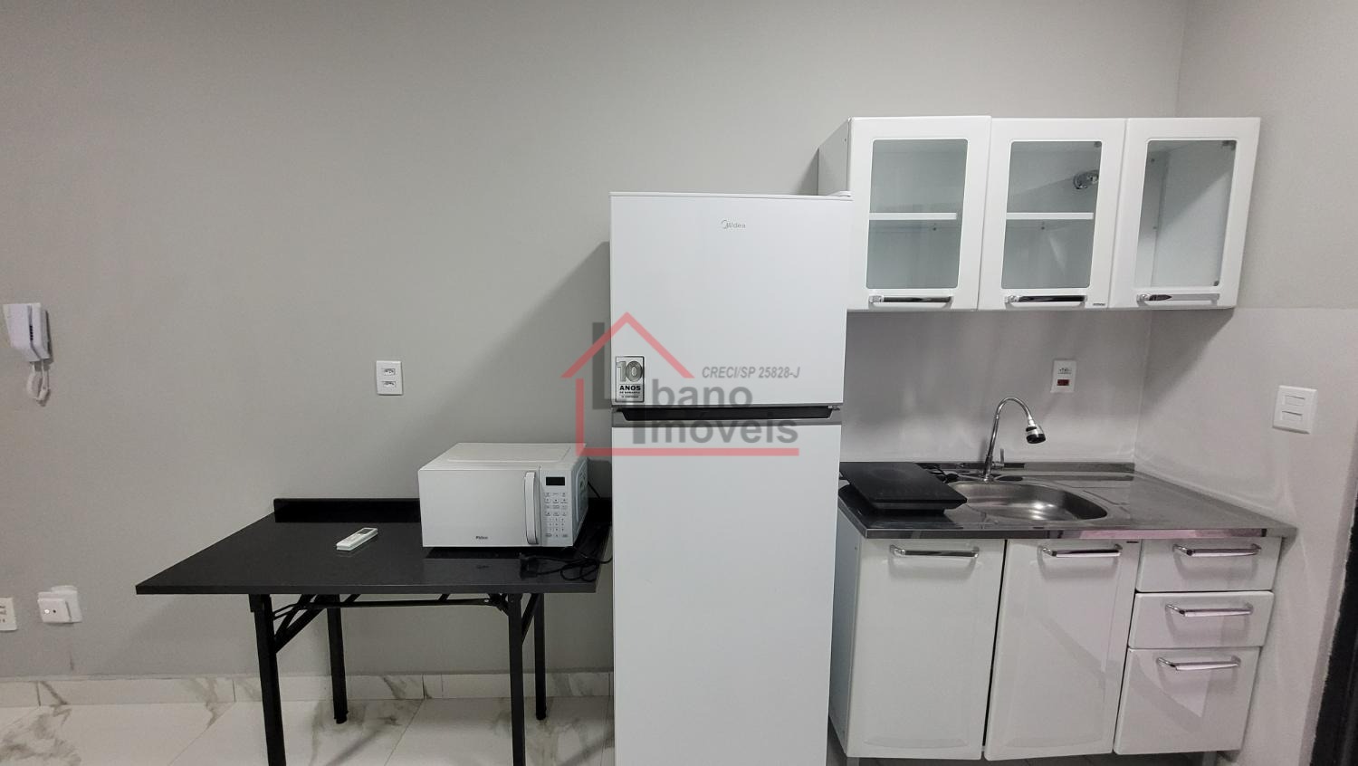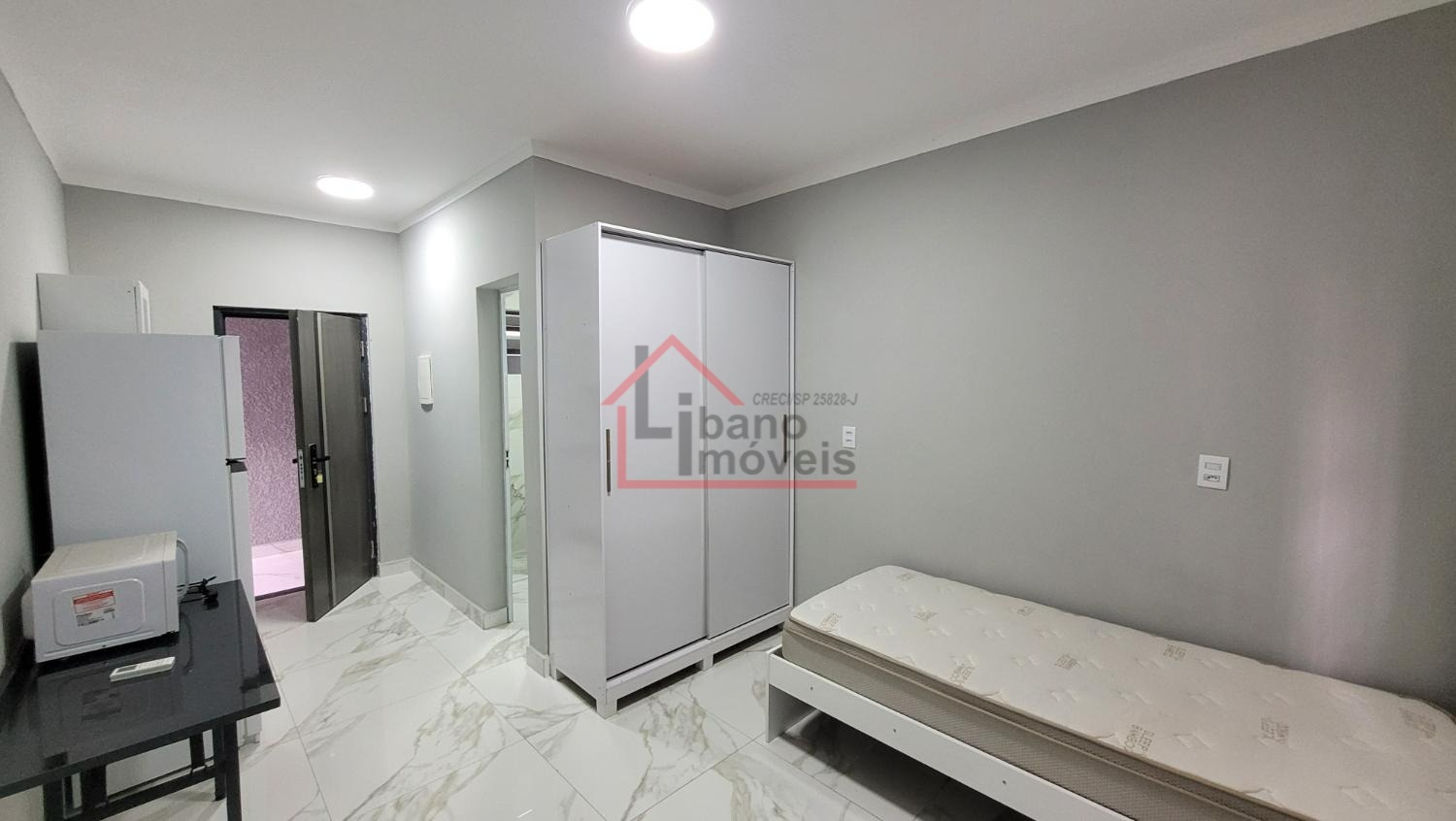 Mobiliada com geladeira, fogão por indução, micro-ondas, cook-top 1 boca, mesa, cama sem colchão, guarda roupas.
