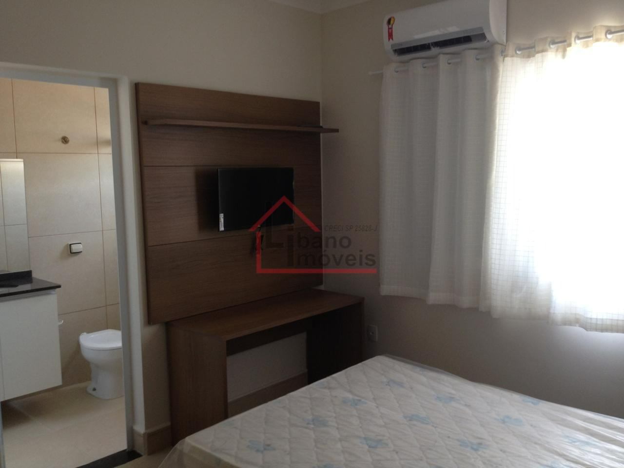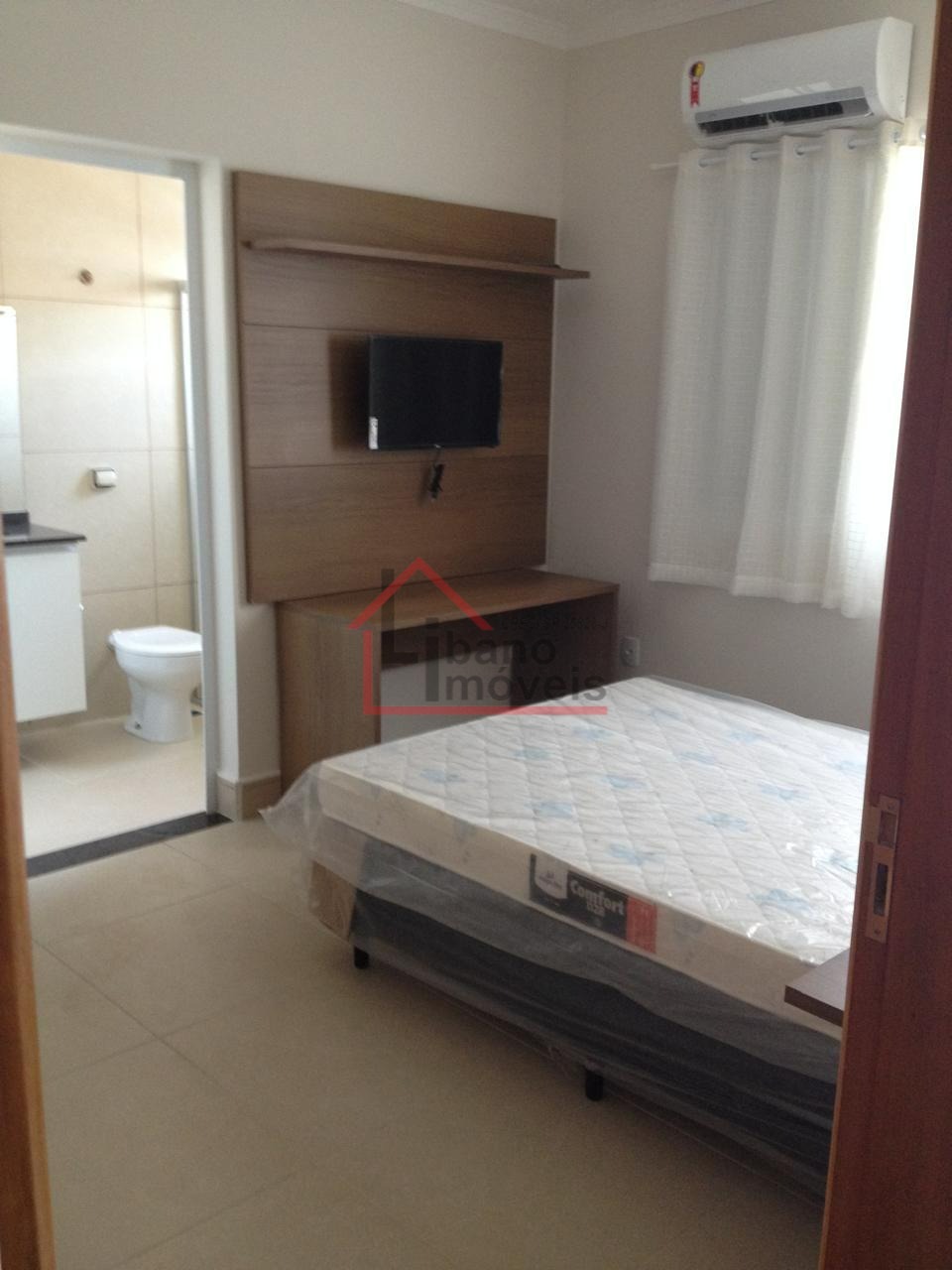 Conforto: Suíte com ar-condicionado, TV, painel e cama.