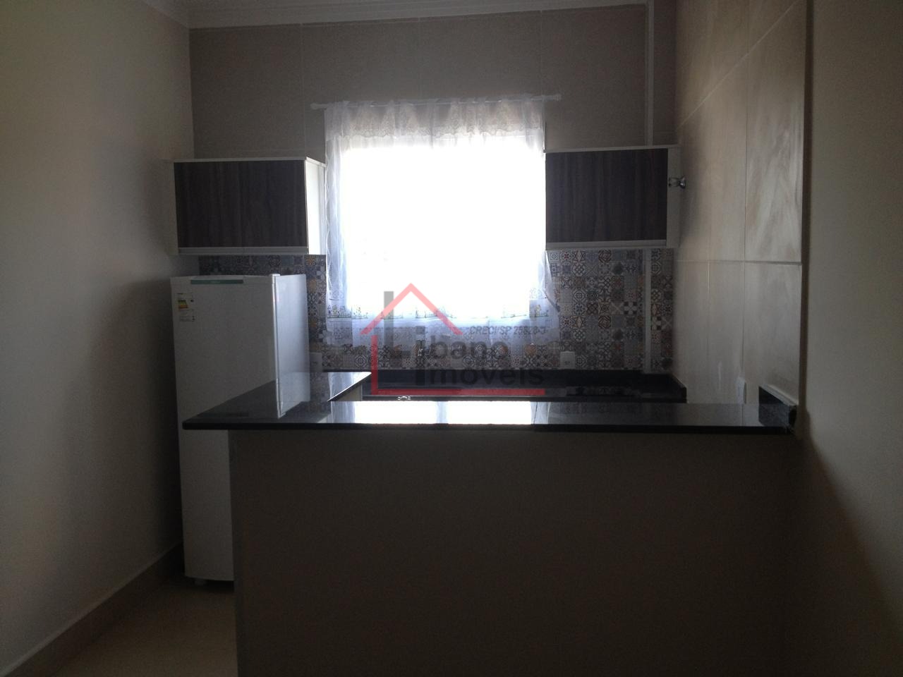 Pronta para morar: Cozinha com cooktop, geladeira e bancada.